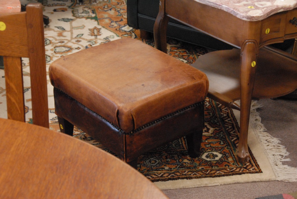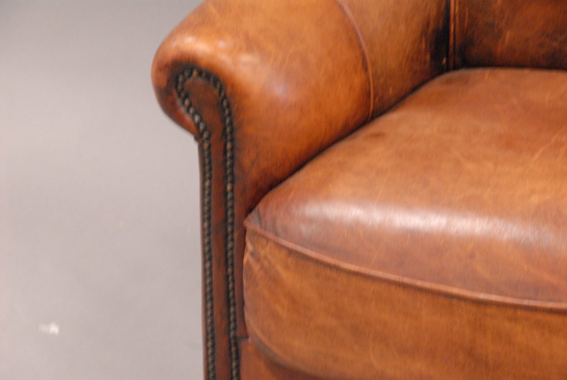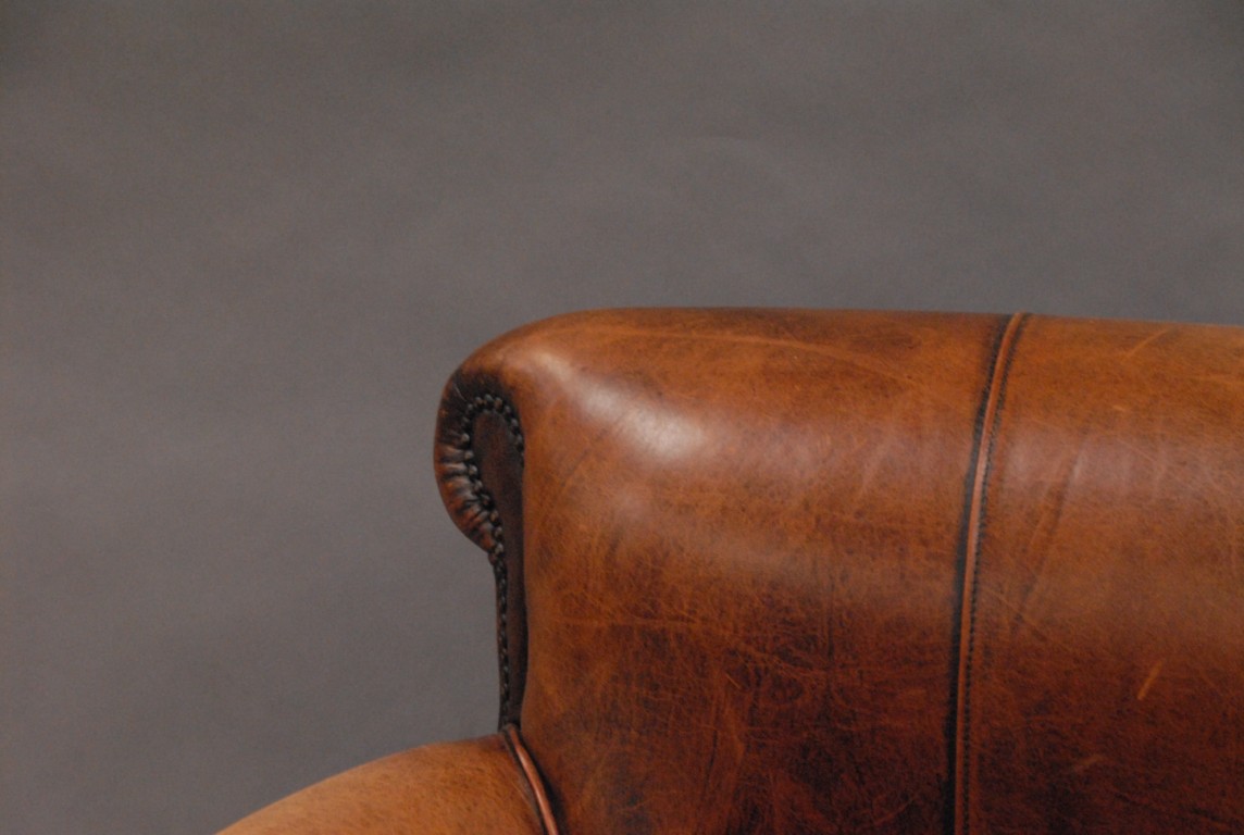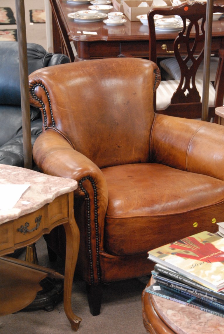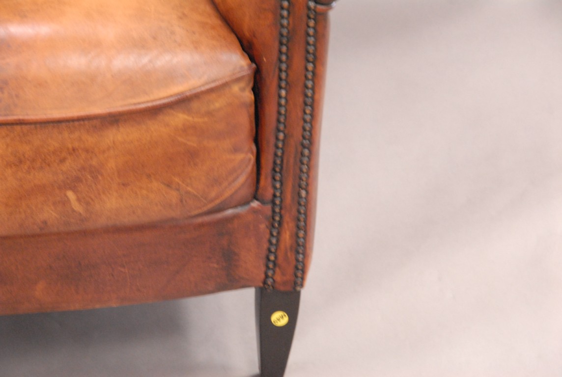 Three piece leather set to include loveseat, chair, and ottoman signed DNG Trading BV.Goor Netherlands