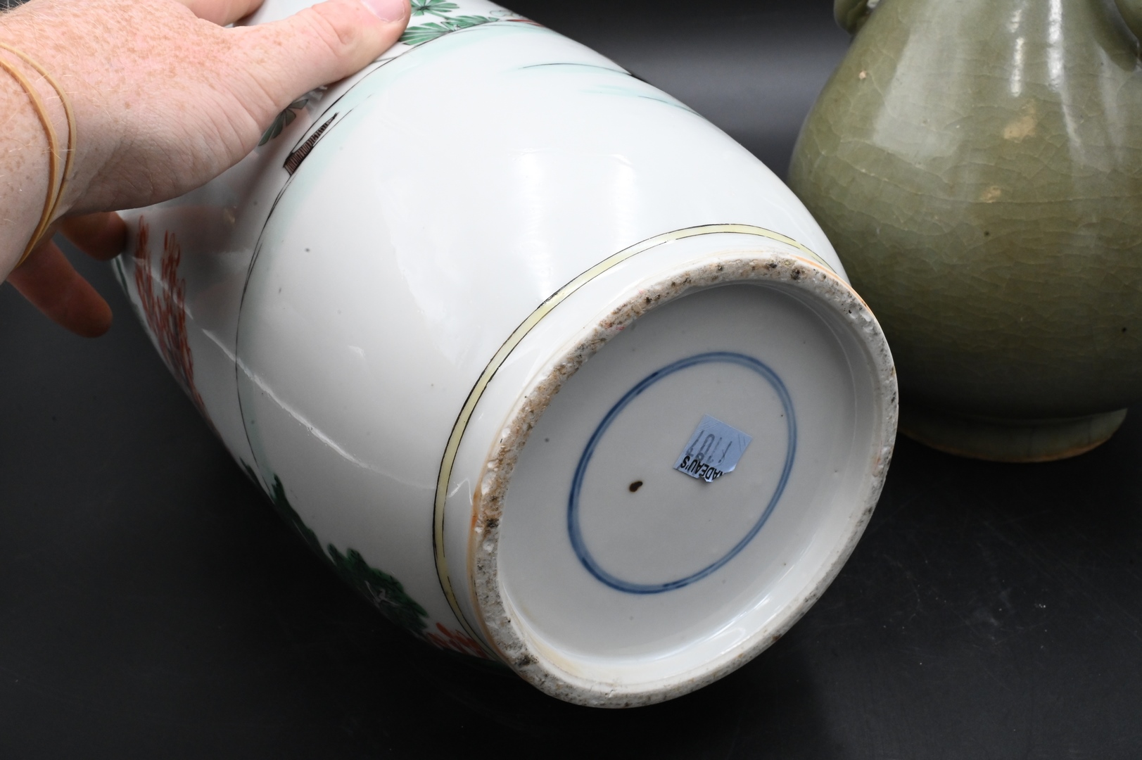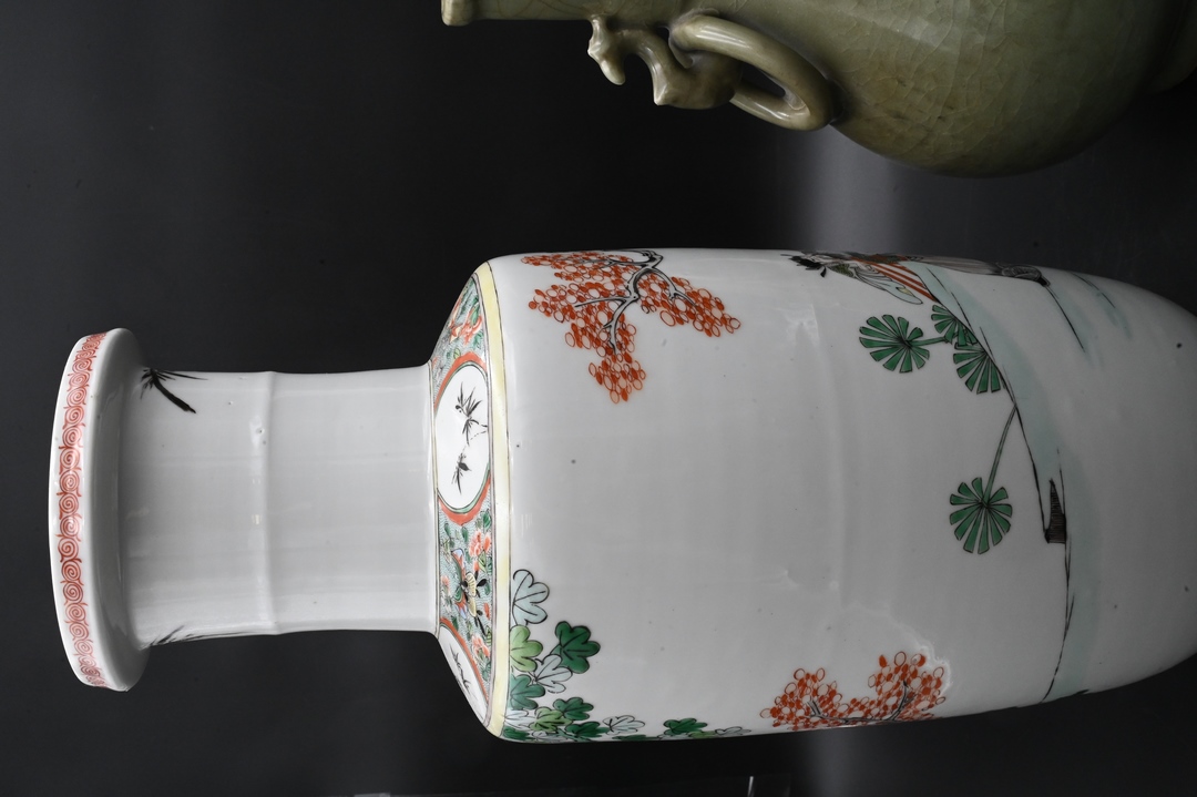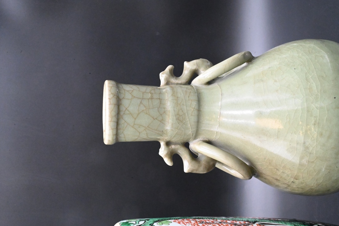 Two Chinese Vases, to include a Longquan celadon vase, 19th century (or older), having a pear-shaped body, covered evenly with an olive green glaze, engaged zoomorphic and ring handles decorate the throat, foot displays iron rust color from firing, height 12 inches; along with a Famille Verte Rouleau having painted Asian scenes, height 17 1/2 inches.