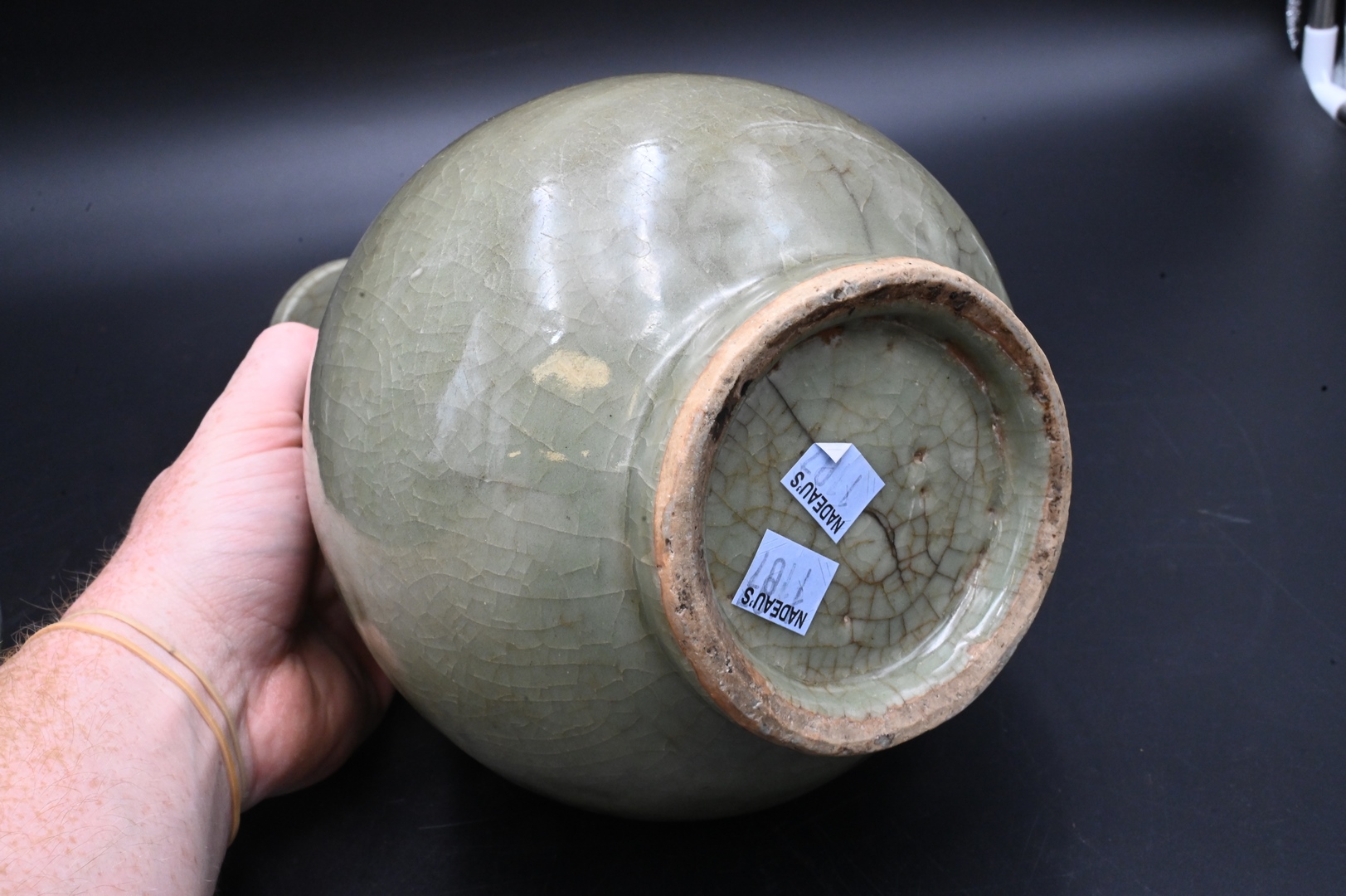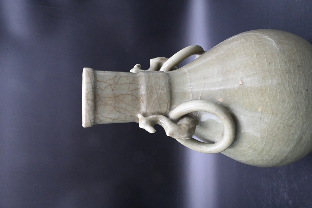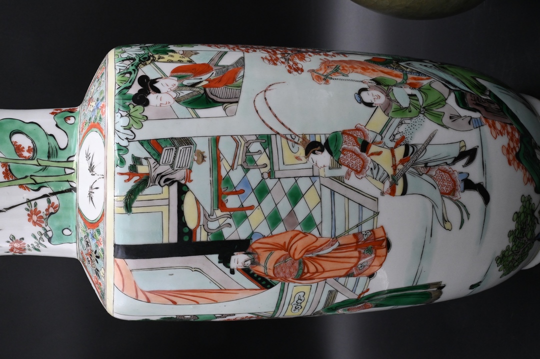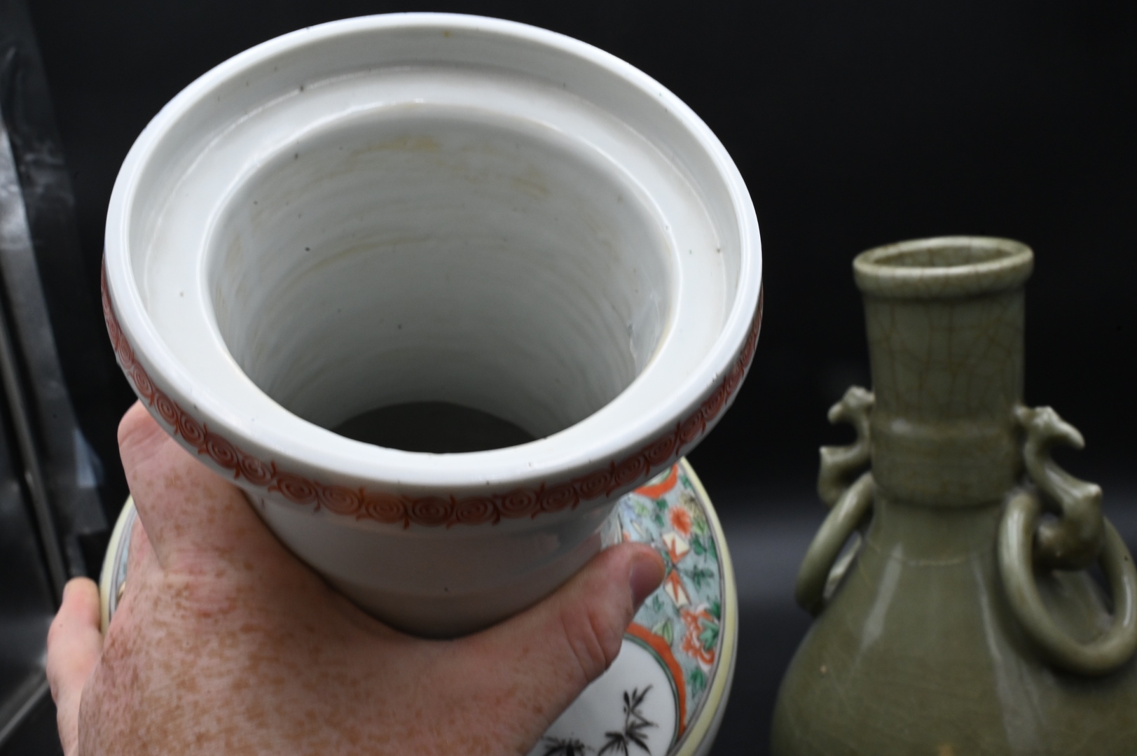 Two Chinese Vases, to include a Longquan celadon vase, 19th century (or older), having a pear-shaped body, covered evenly with an olive green glaze, engaged zoomorphic and ring handles decorate the throat, foot displays iron rust color from firing, height 12 inches; along with a Famille Verte Rouleau having painted Asian scenes, height 17 1/2 inches.