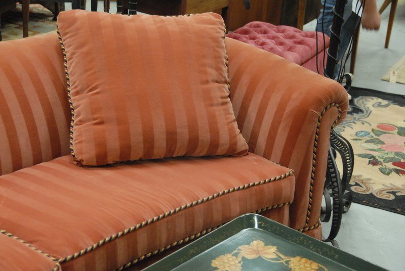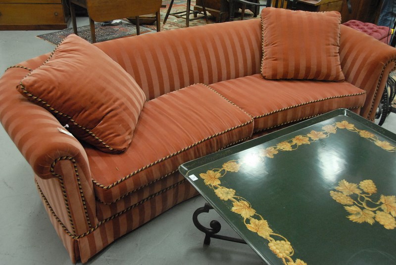 Upholstered sofa with rose upholstery and striped rope pimping, lg. 91in.