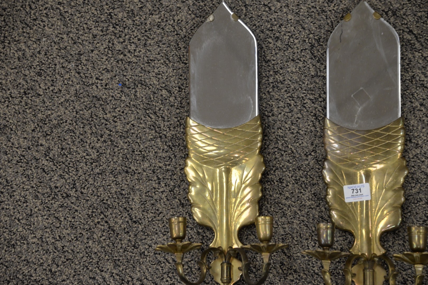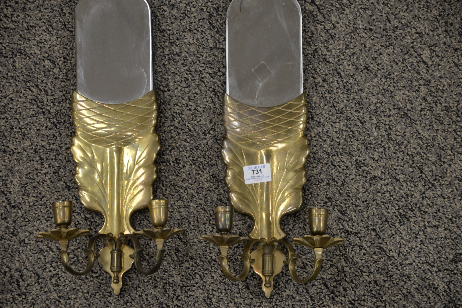 Lot 731: Pair of Chapman Brass and Mirrored Glass Two Candle Light Wall Sconces, having leaf design, marked ‘Chapman’ to the reverse, height …