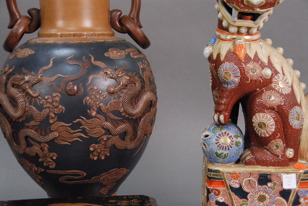 Lot 732: Group of Japanese items to include a large earthenware dragon vase, two Satsuma foodogs, and a lacquered box. foodogs: ht. 18 1/2in….