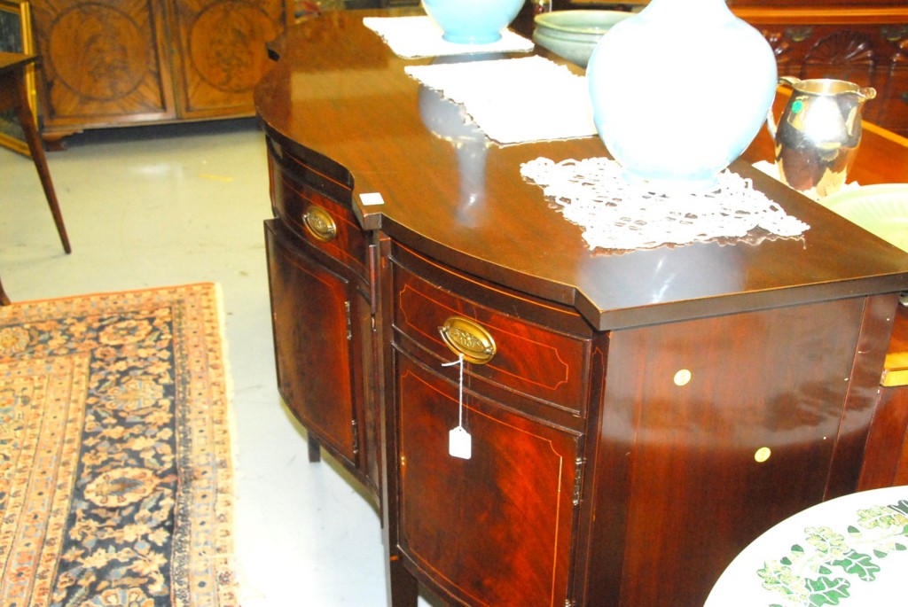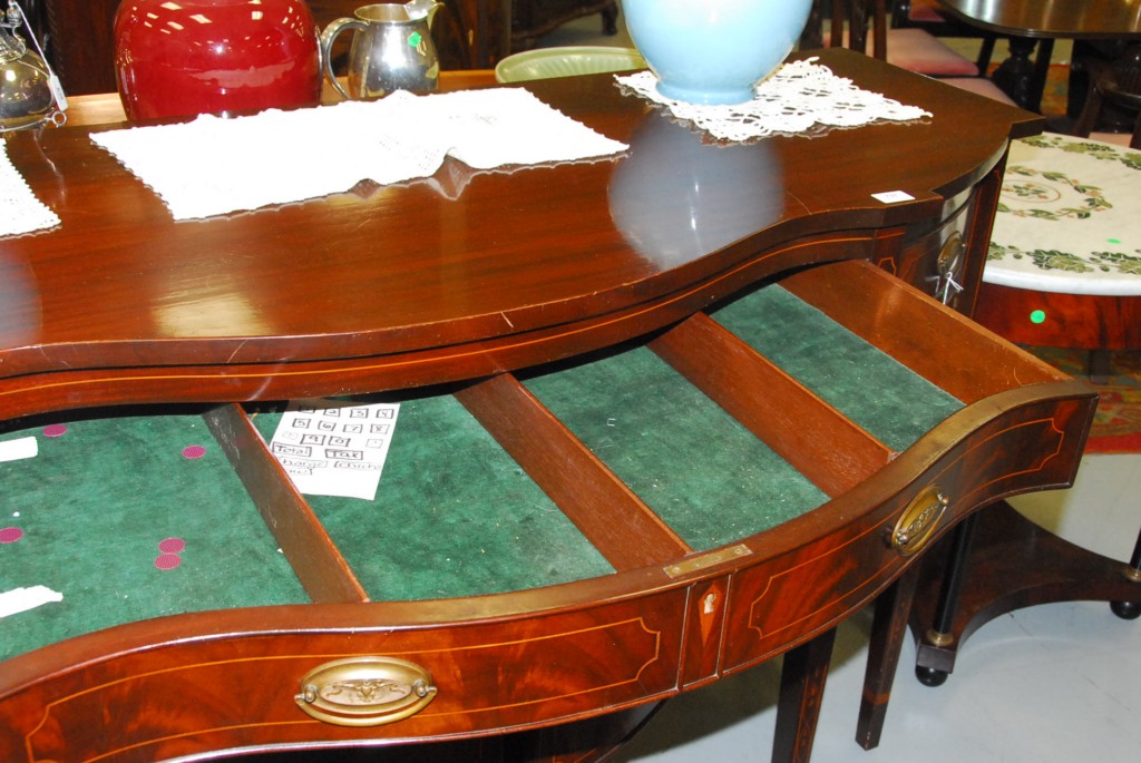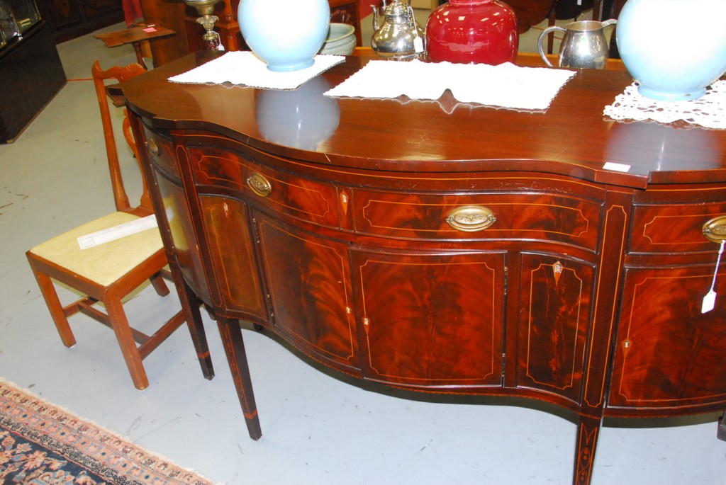 Custom mahogany Federal style sideboard, serpentine top over three drawers over four doors and two bottle drawers all set on square tapered legs with line and bell flower inlays. – ht. 41in. lg. 66 1/2in. dp. 24 1/2in.