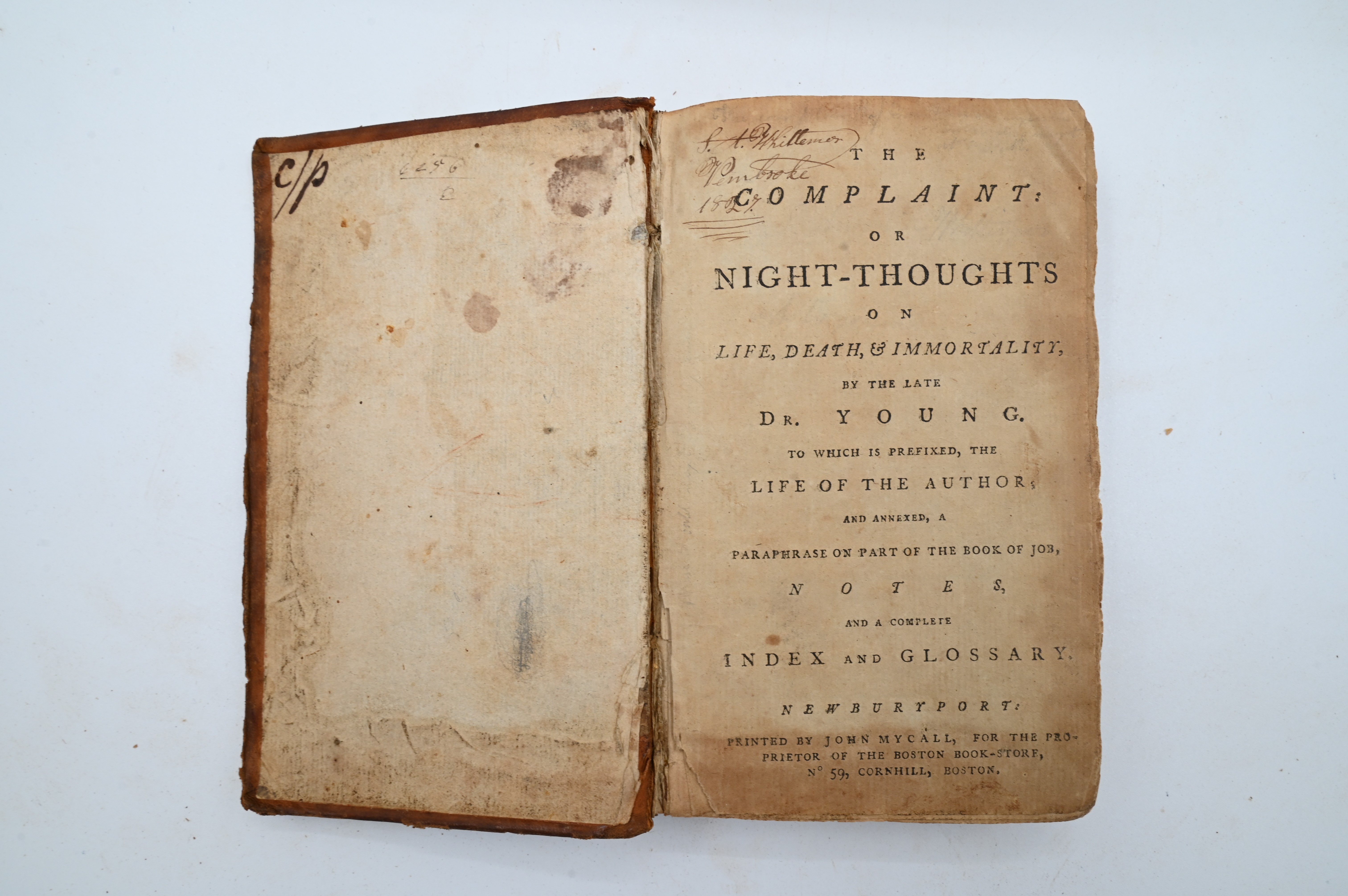 The Complaint or Night Thoughts on Life, Death, and Immortality, by the late Dr. Young, printed by John Mycall, for the proprietor of the Boston Bookstore, number 59, Cornhill, Boston, 1827