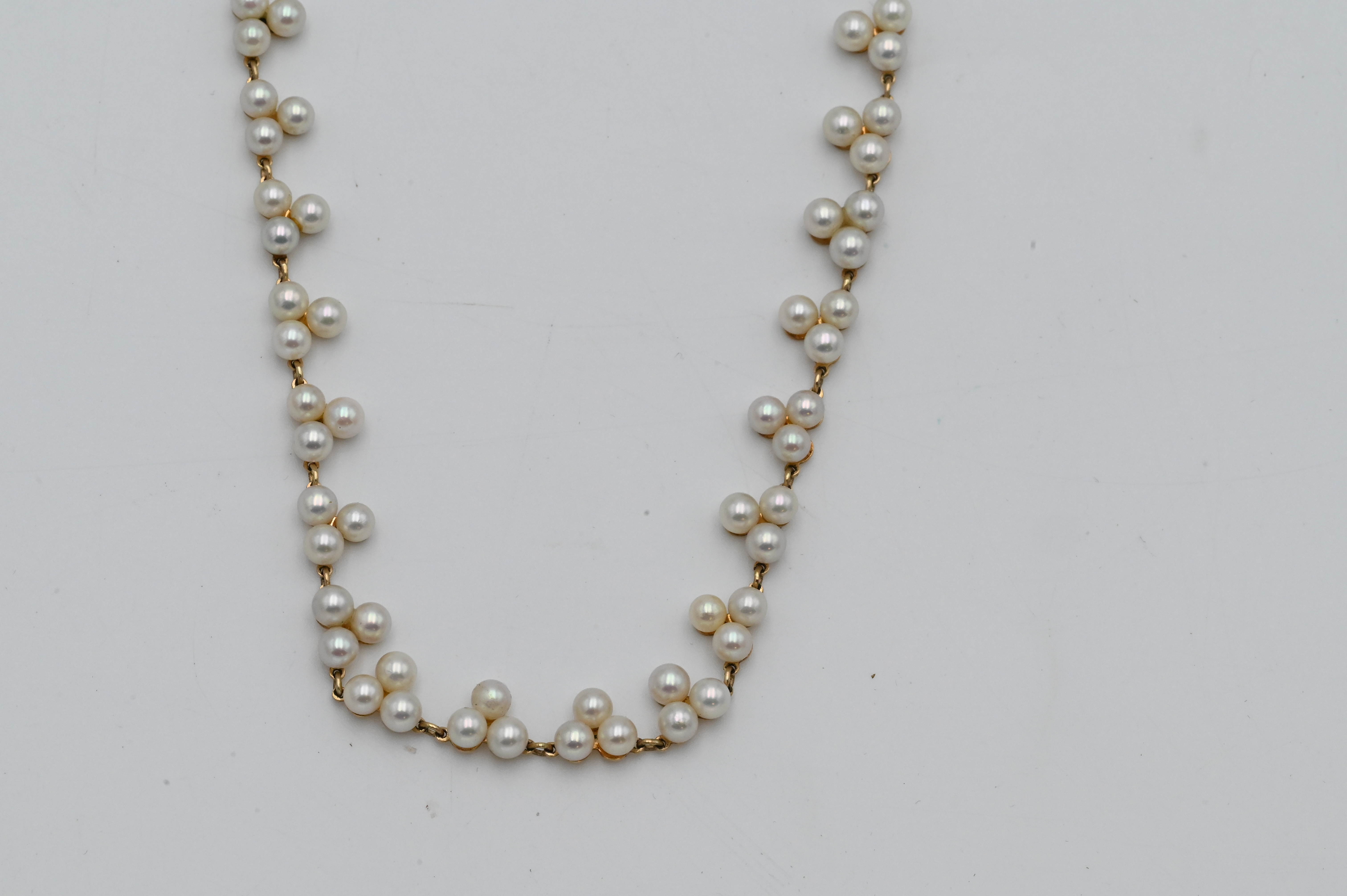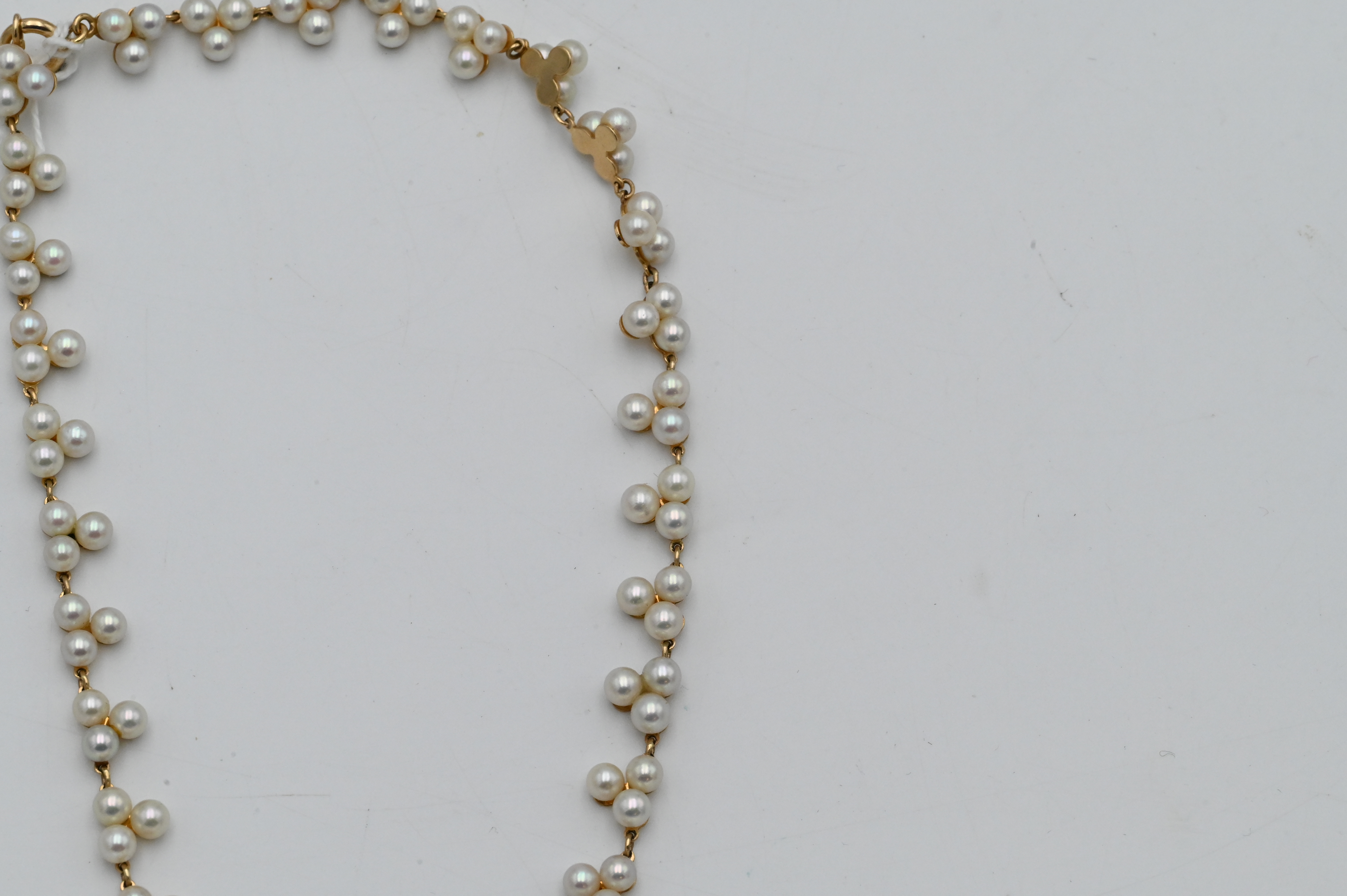14 Karat Yellow Gold and Pearl Necklace, each three leaf clover set with three pearls, length 15 inches.