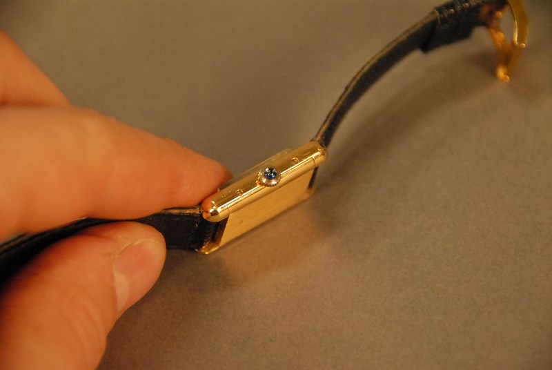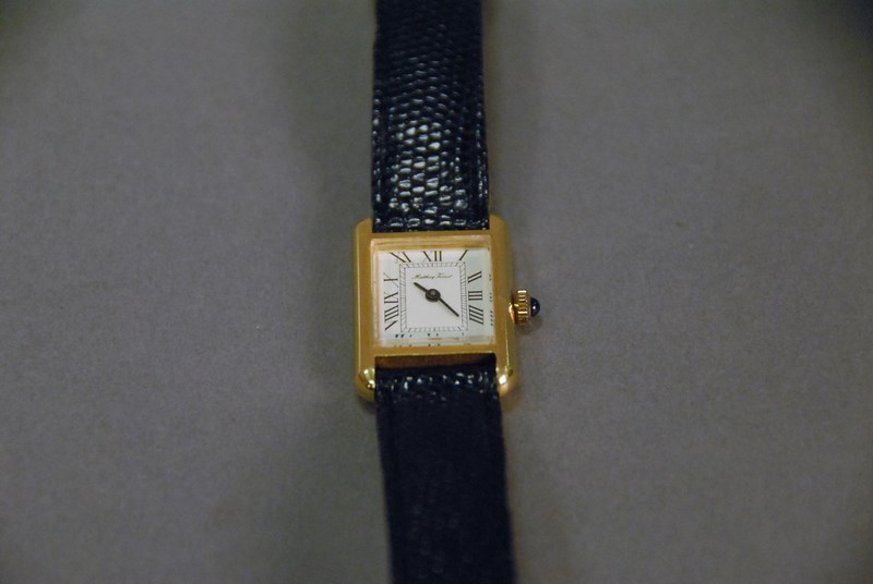 Lot 74: 18k gold Mathey Tissot ladies wristwatch with black Cartier band.