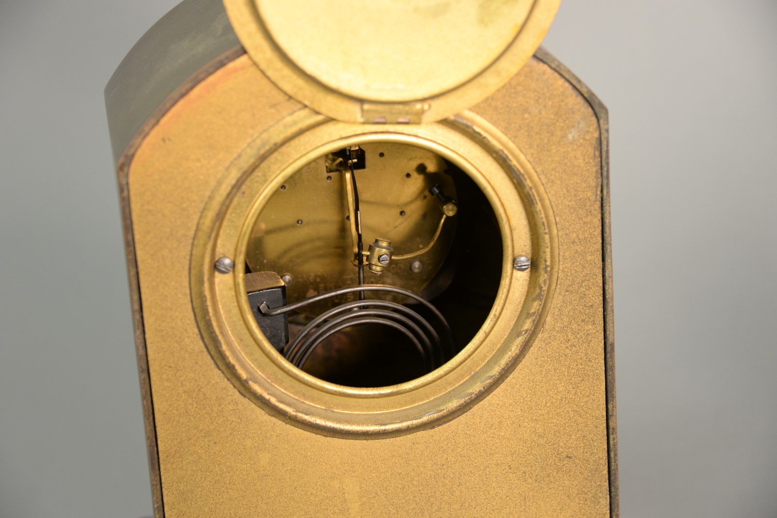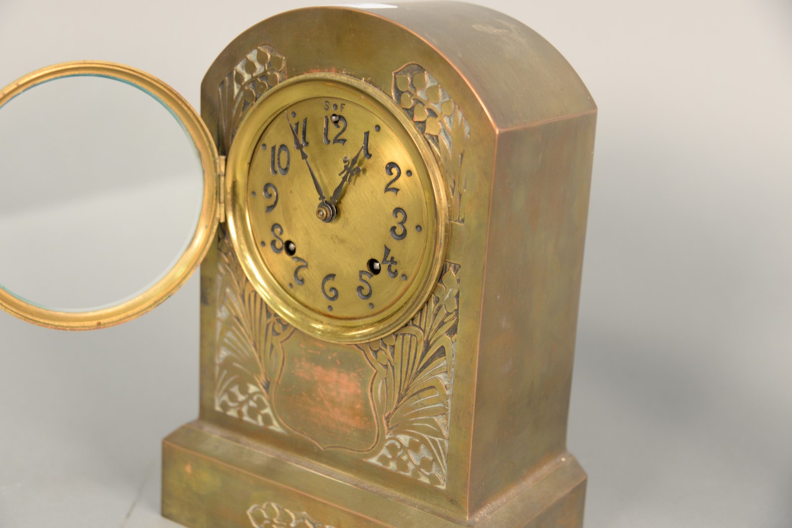 Lot 74: Art Nouveau brass and iron clock by Ansonia Clock Co. New York, U.S.A.ht. 10 1/2 in. wd. 7 1/2 in.