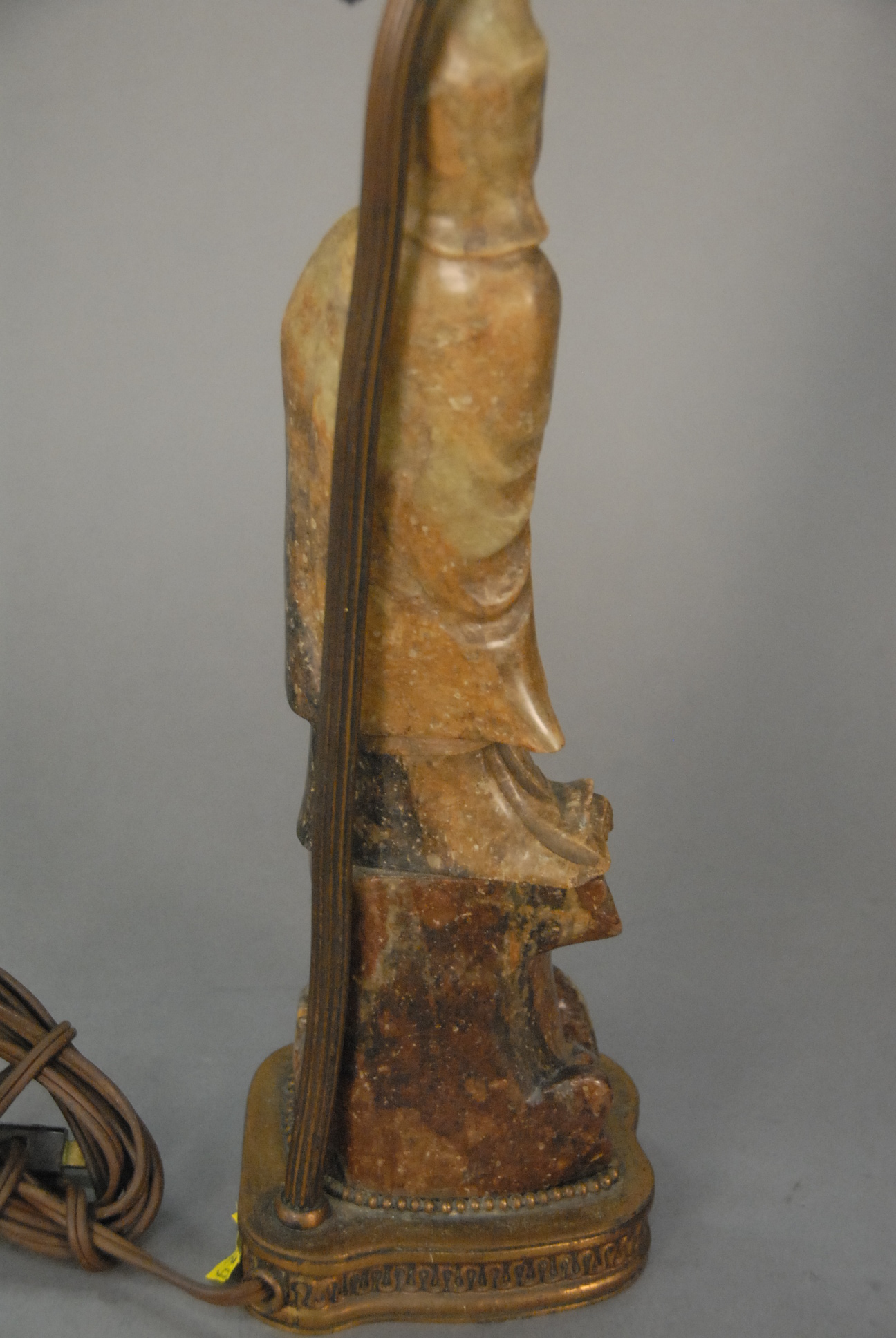 Lot 74: Carved soap stone figure of Guanyin holding a Ruyi Scepter standing on stone base. soap stone ht. 13 in.