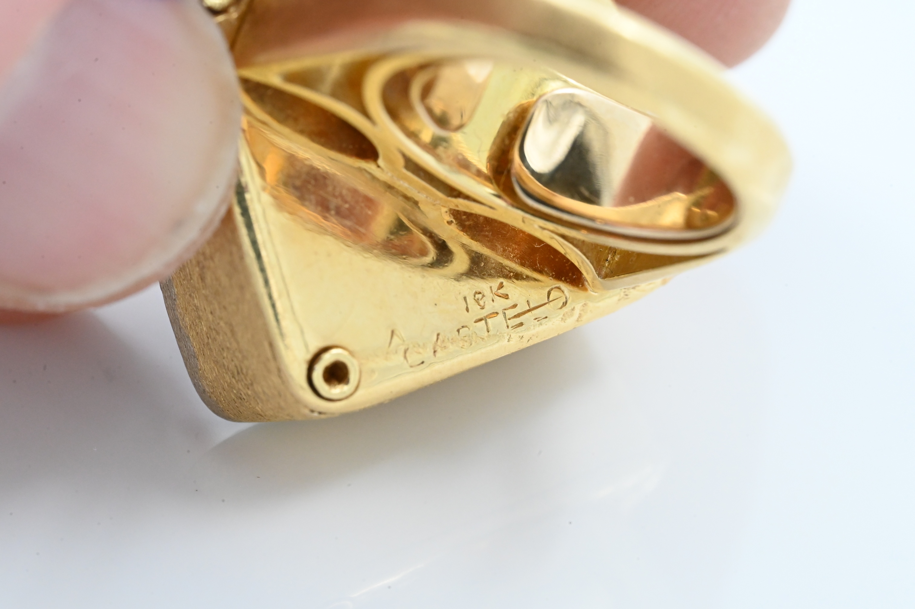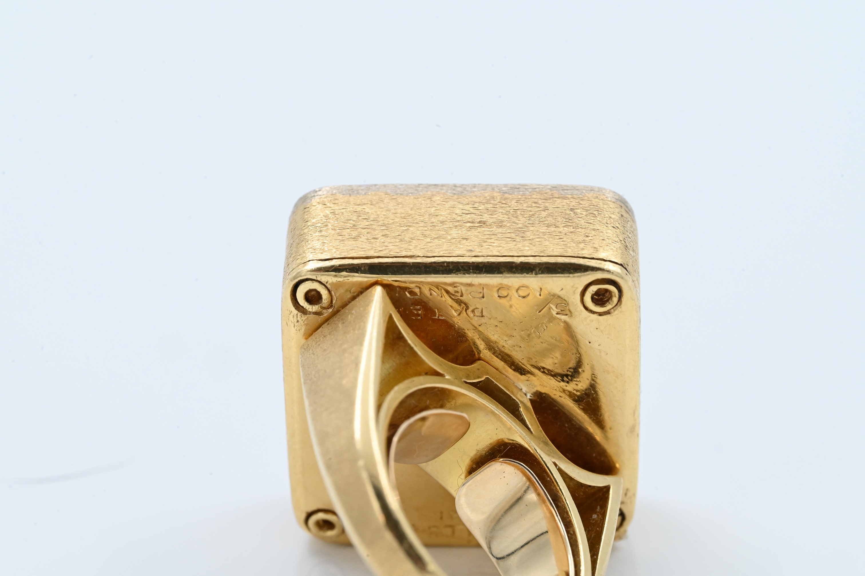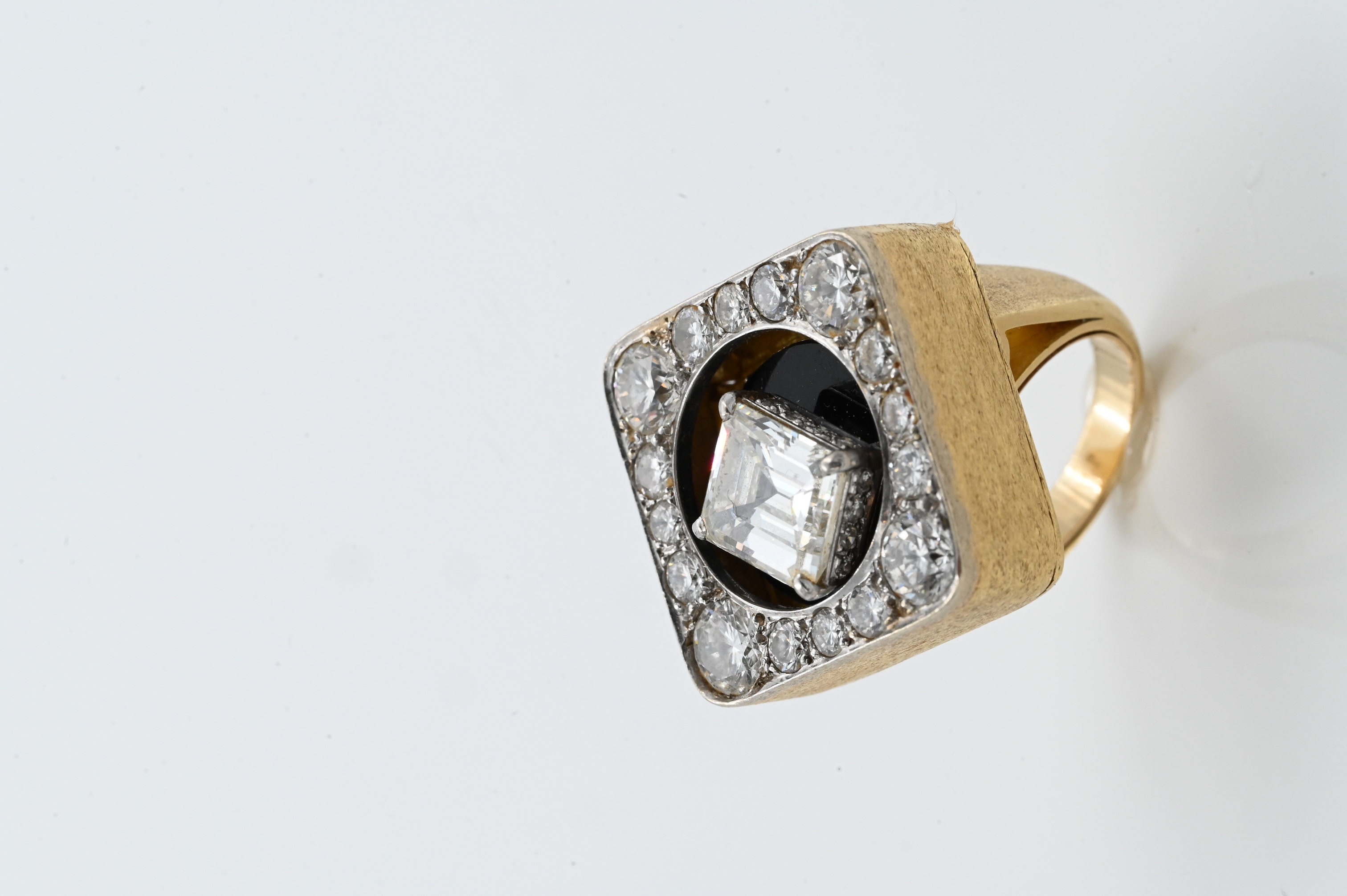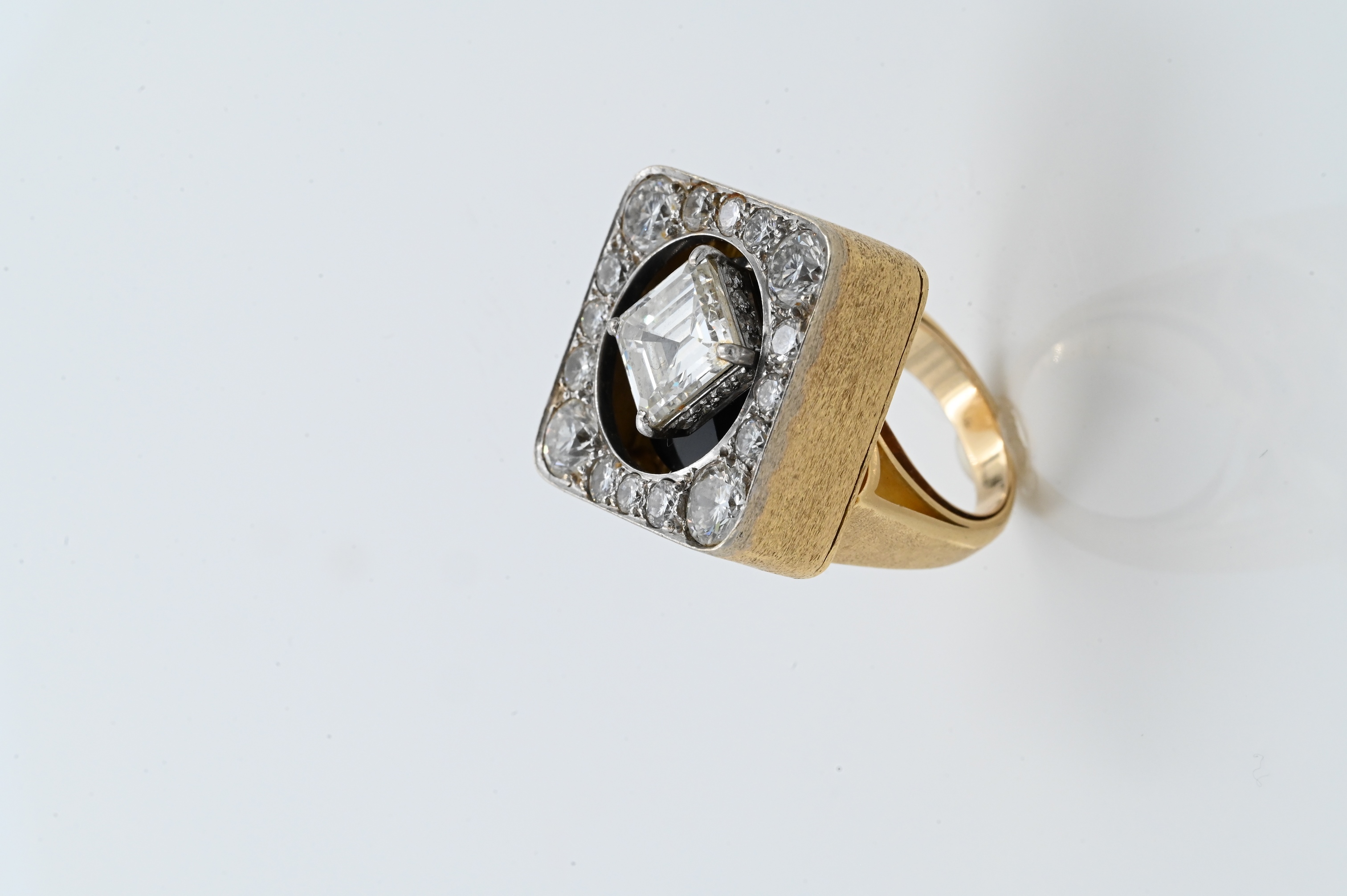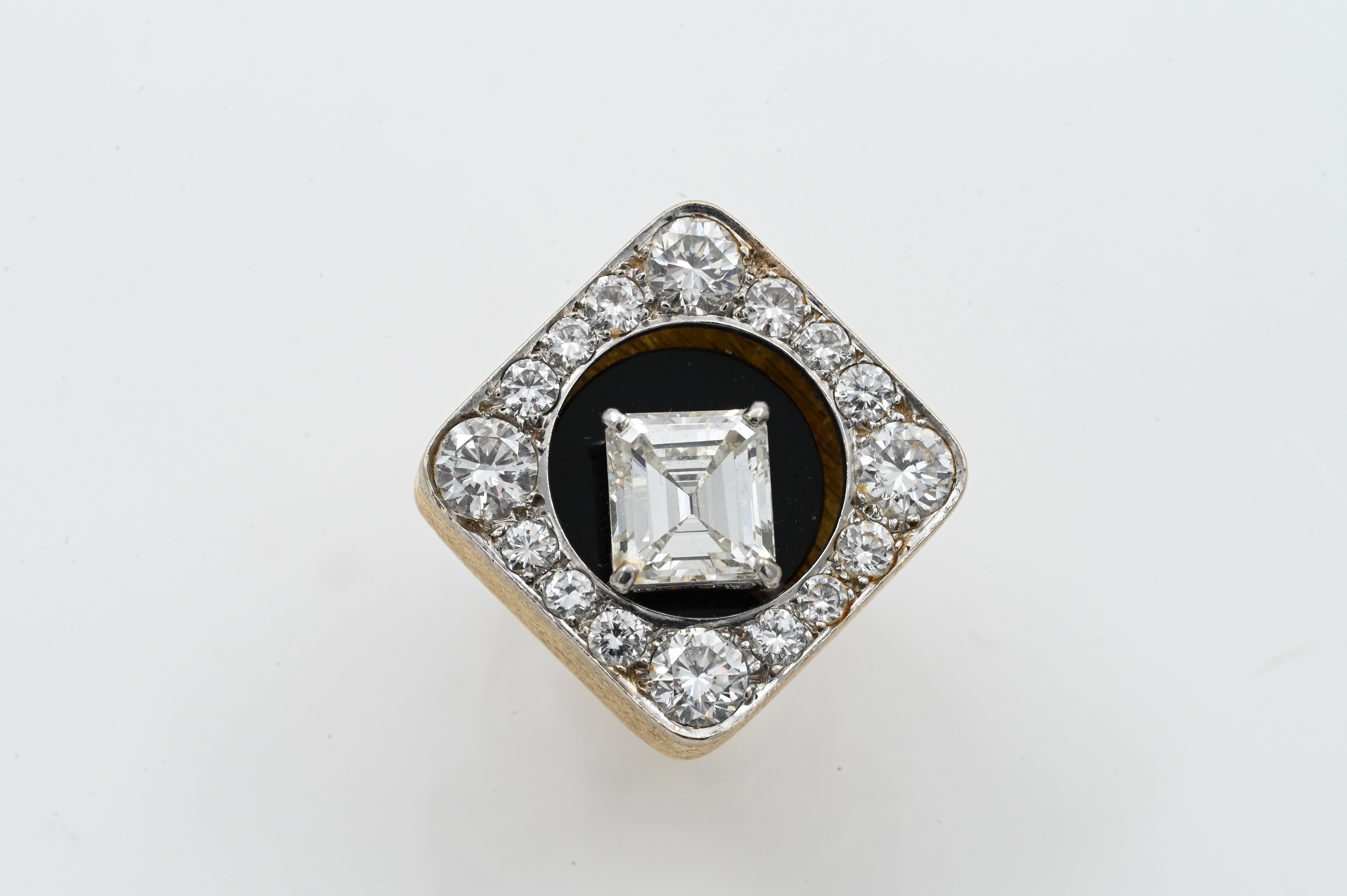 having onyx ground with one emerald cut diamond 3.10 carats, four larger diamonds in corners and 28 small diamonds approximately 1.7 total carats, marked “18 K Castelo 3/100 patent pending”