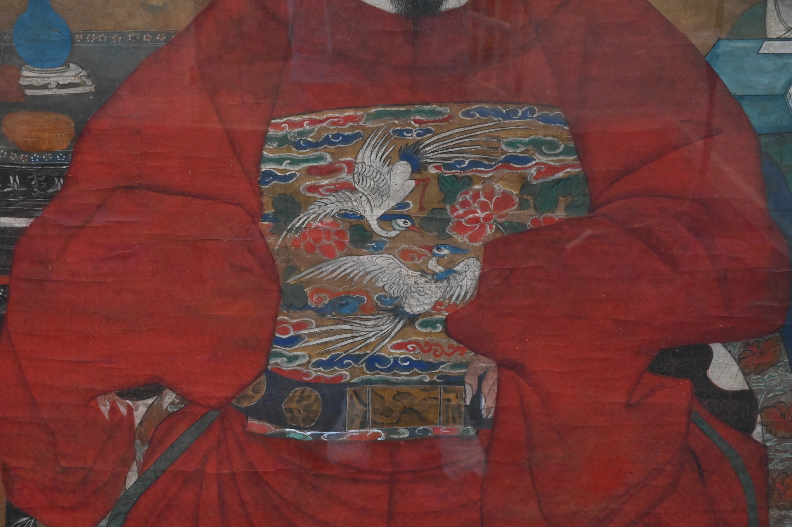 A monumental ancestral portrait depicting a Ming official seated frontally in richly embroidered red court robes with crane motif, his rank badge clearly visible at chest, attended by a standing figure at his side. Painted with the formal precision and solemnity characteristic of ancestral portraiture, this large-scale scroll would have been created for domestic veneration, affirming lineage and filial piety.