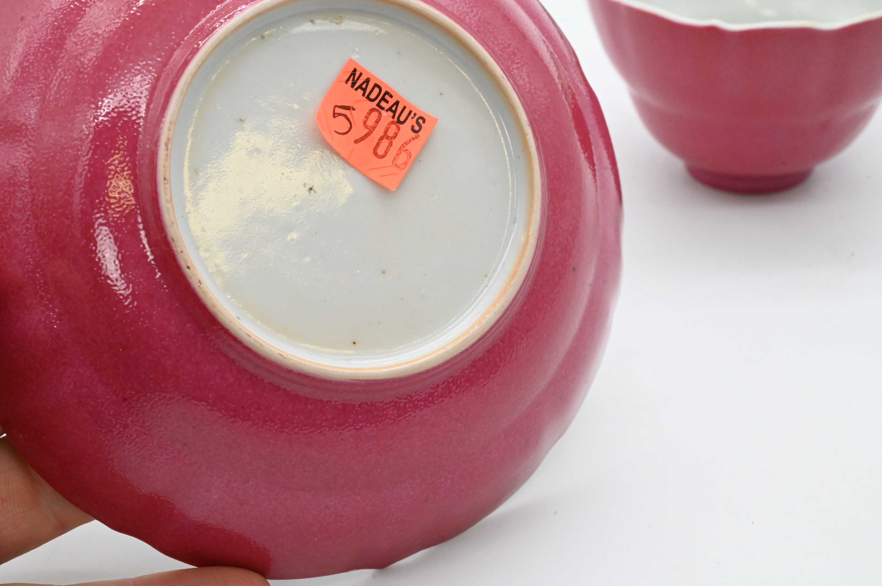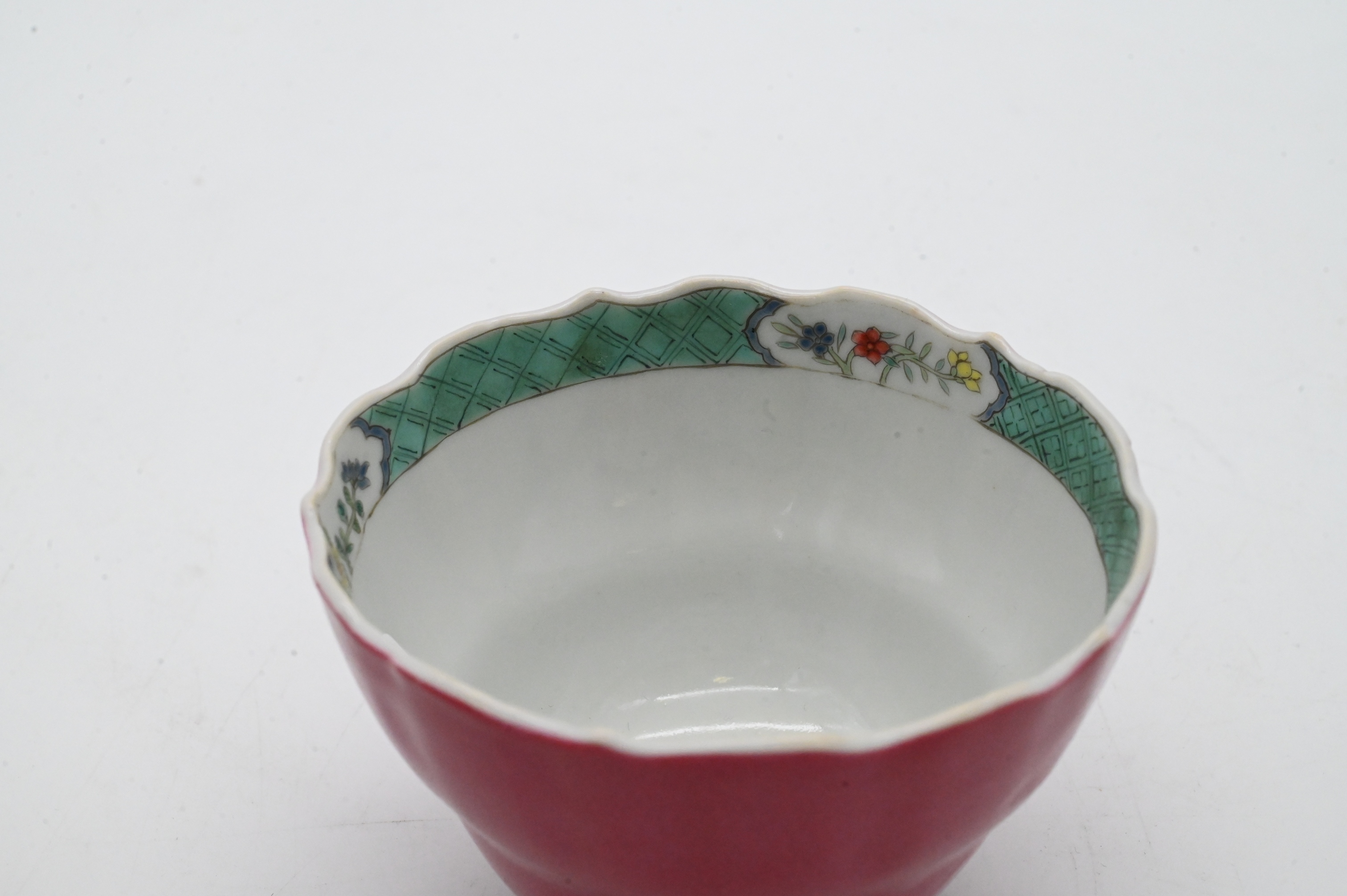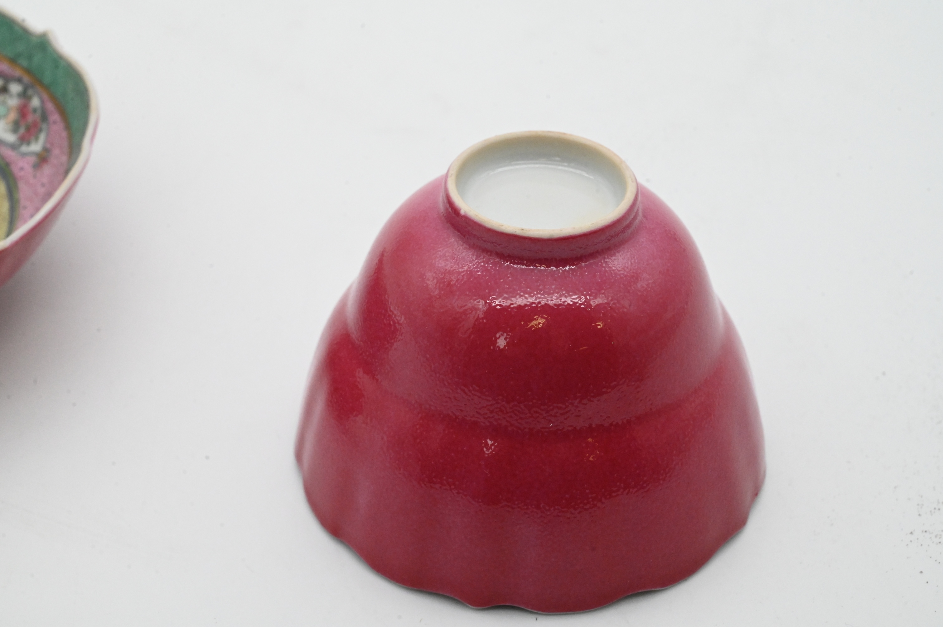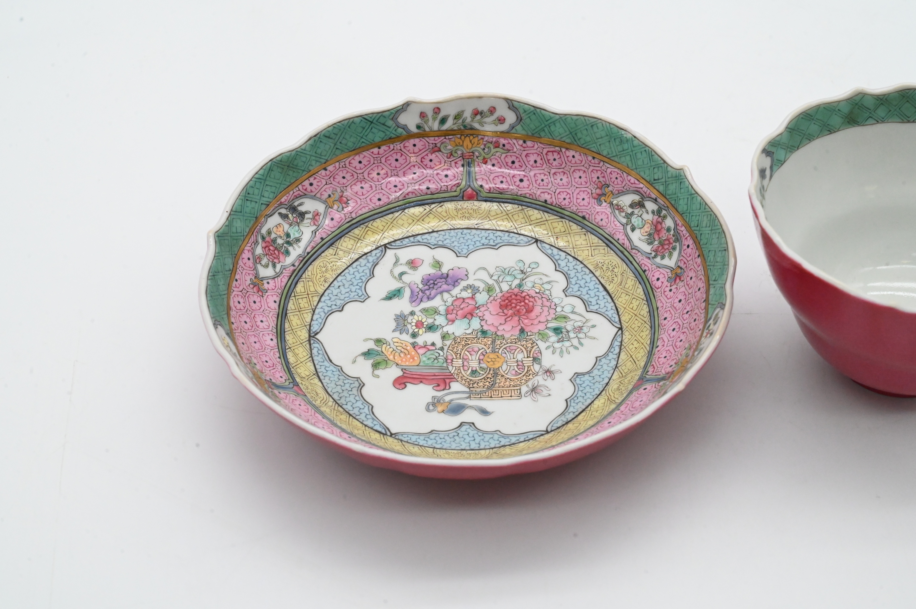 teacup with scalloped rim and matching saucer, each decorated in famille rose enamels, saucer with alternating pink, yellow, and turquoise borders enclosing floral sprays, the cup exterior enameled in a rich rose-pink ground with floral cartouches at the rim