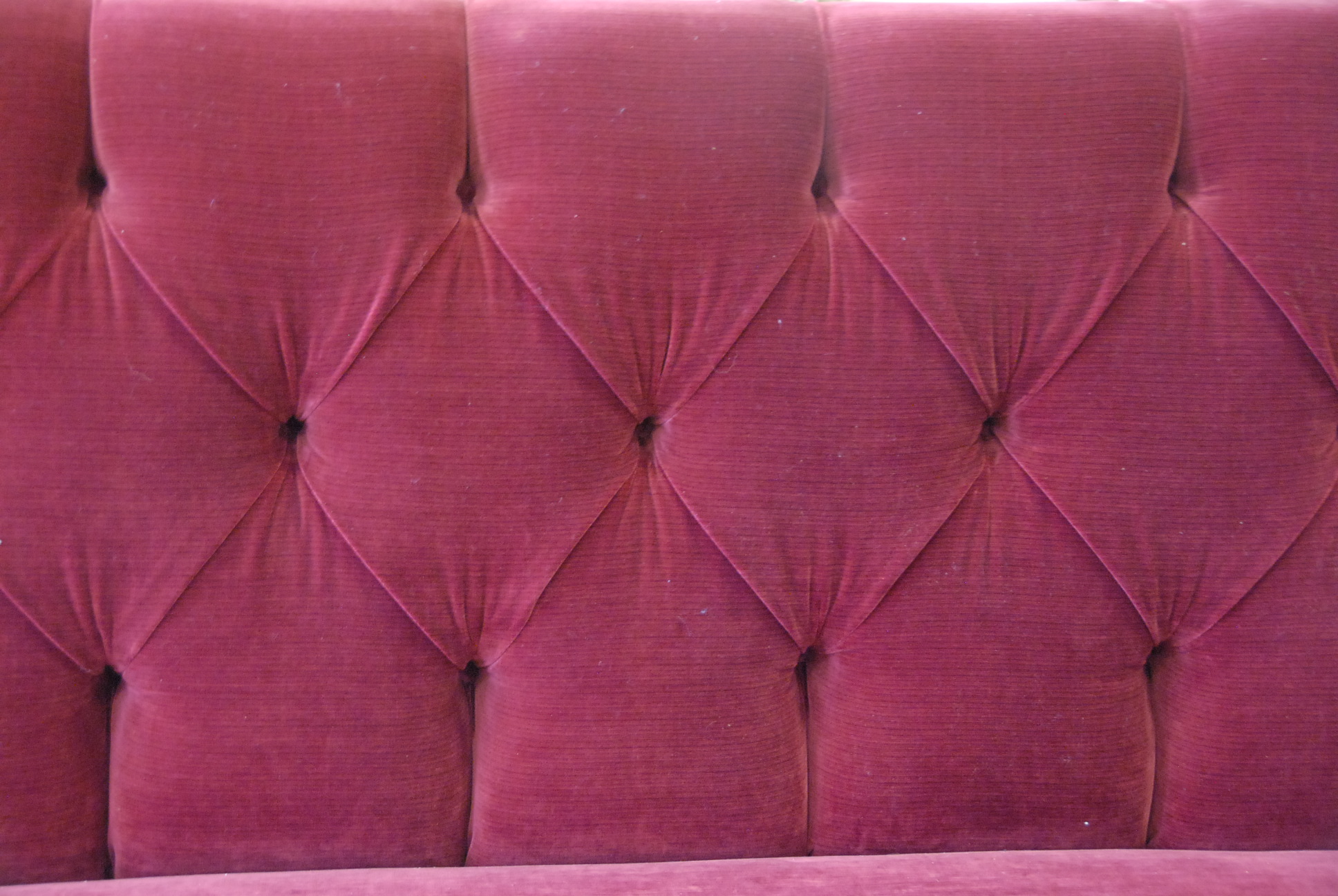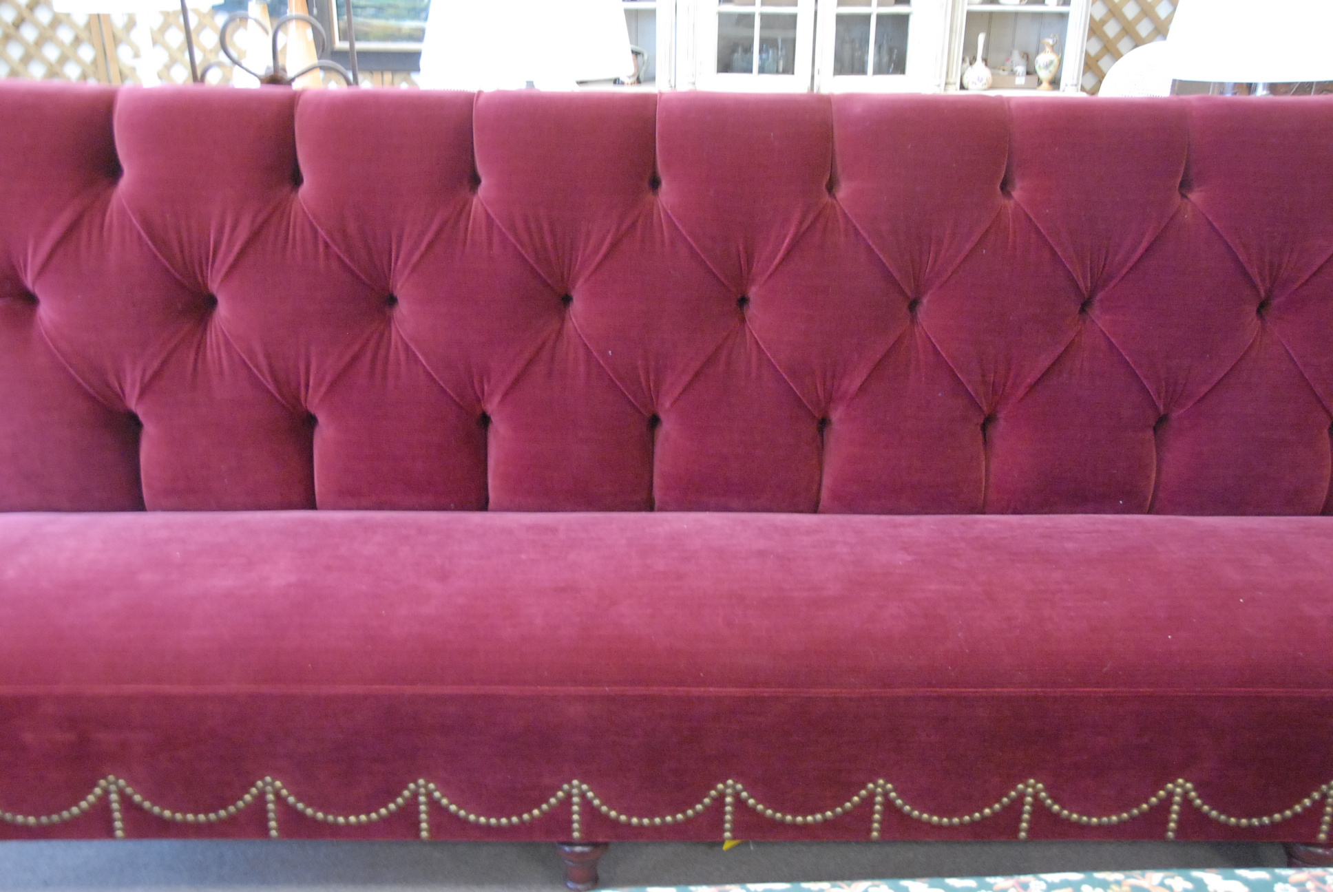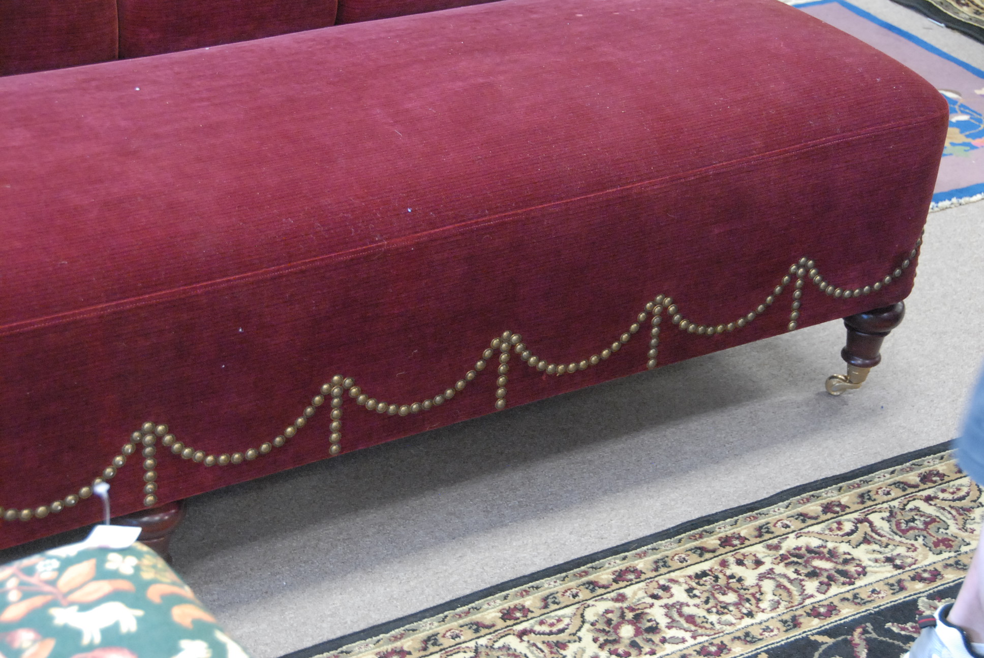 Custom burgundy upholstered bench, ht. 48in. lg. 138in.