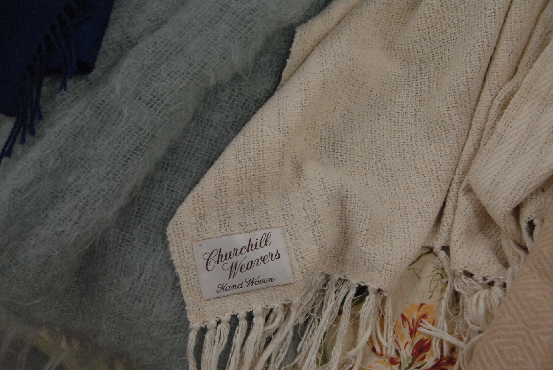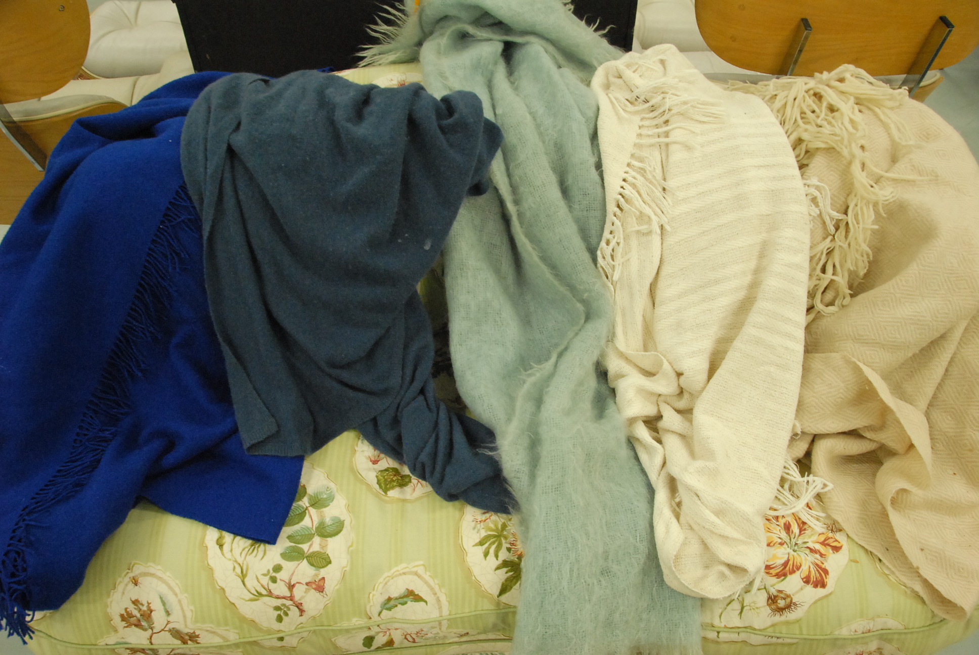 Five shawls including Armand Diradourian, Churchill Weavers, Johnstons of Elgin, and Heather Brae Mohair.