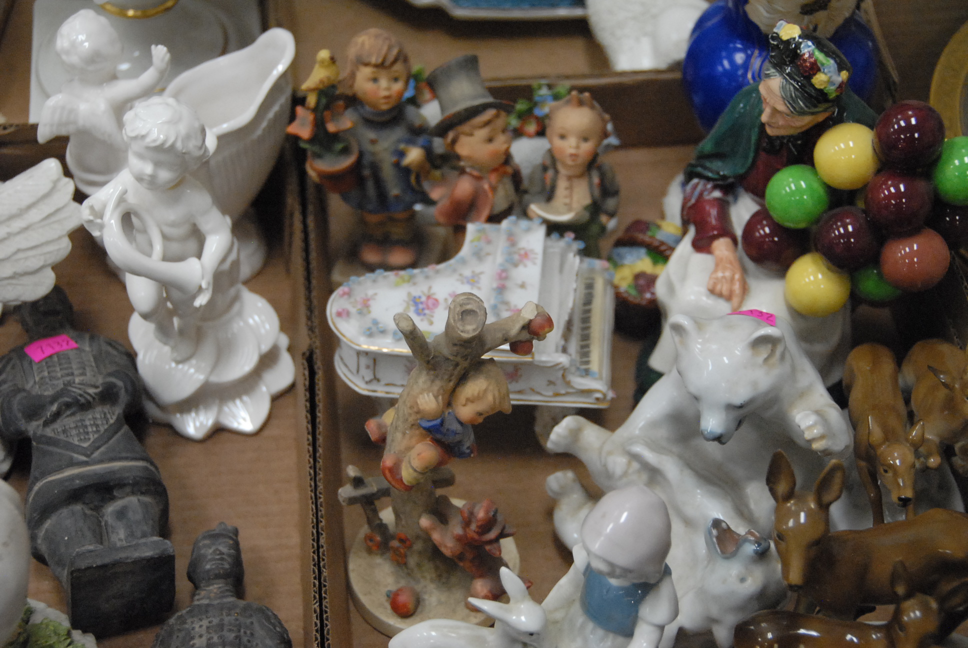 Lot 74: Four box lots to include a pair of Portugal tall urns, porcelain figures, Hummels, Royal Doulton Balloon Lady, Copenhagen bears, t…