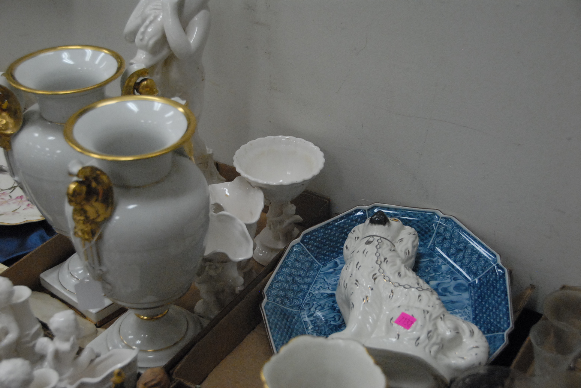 Four box lots to include a pair of Portugal tall urns, porcelain figures, Hummels, Royal Doulton Balloon Lady, Copenhagen bears, two Staffordshire dogs, etc.