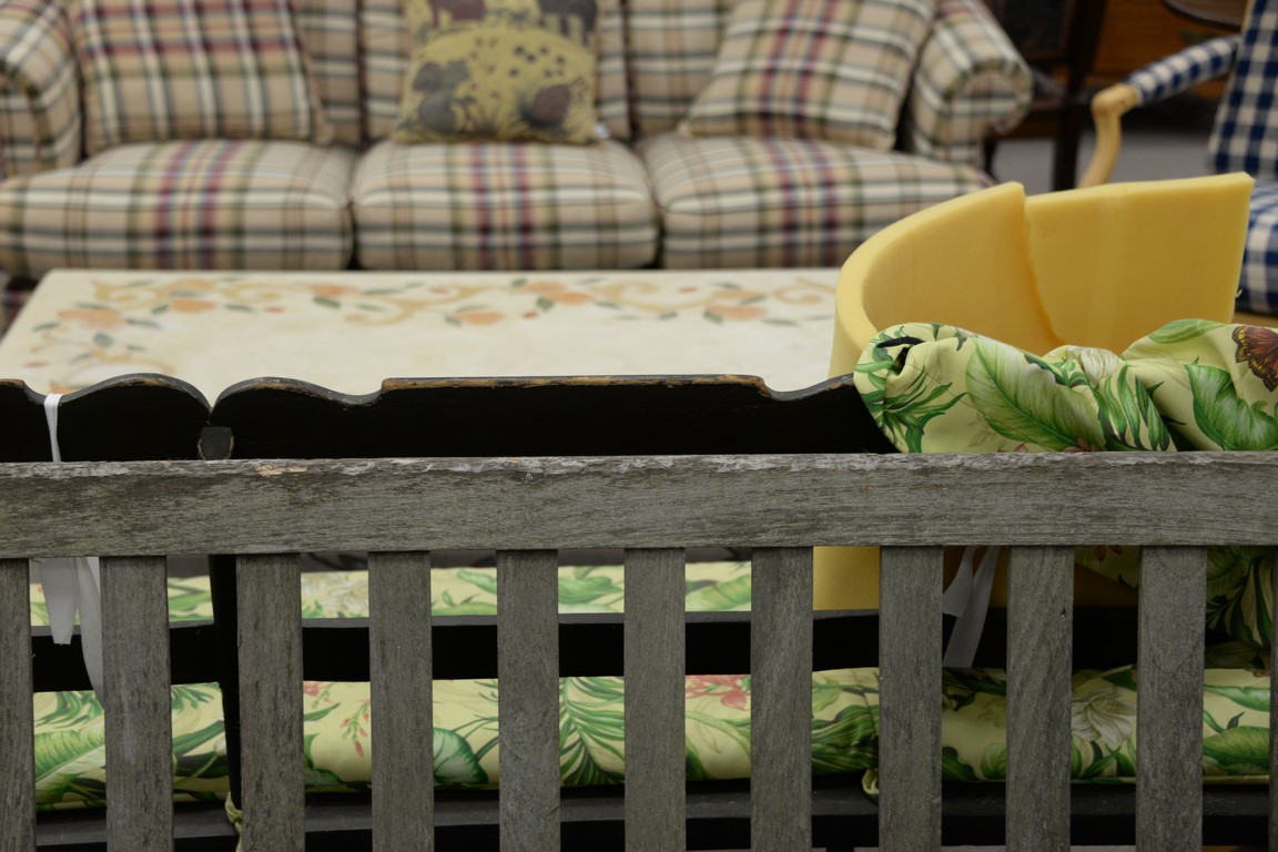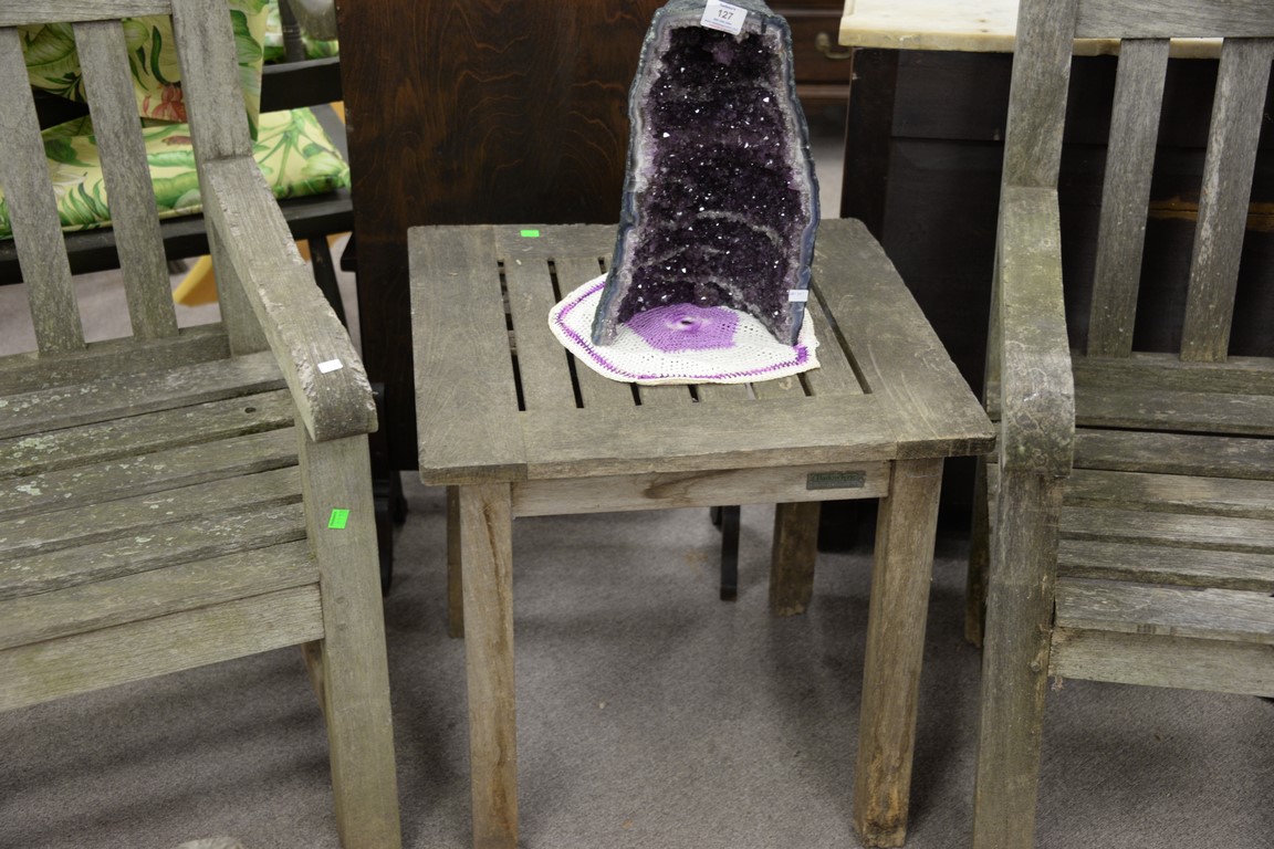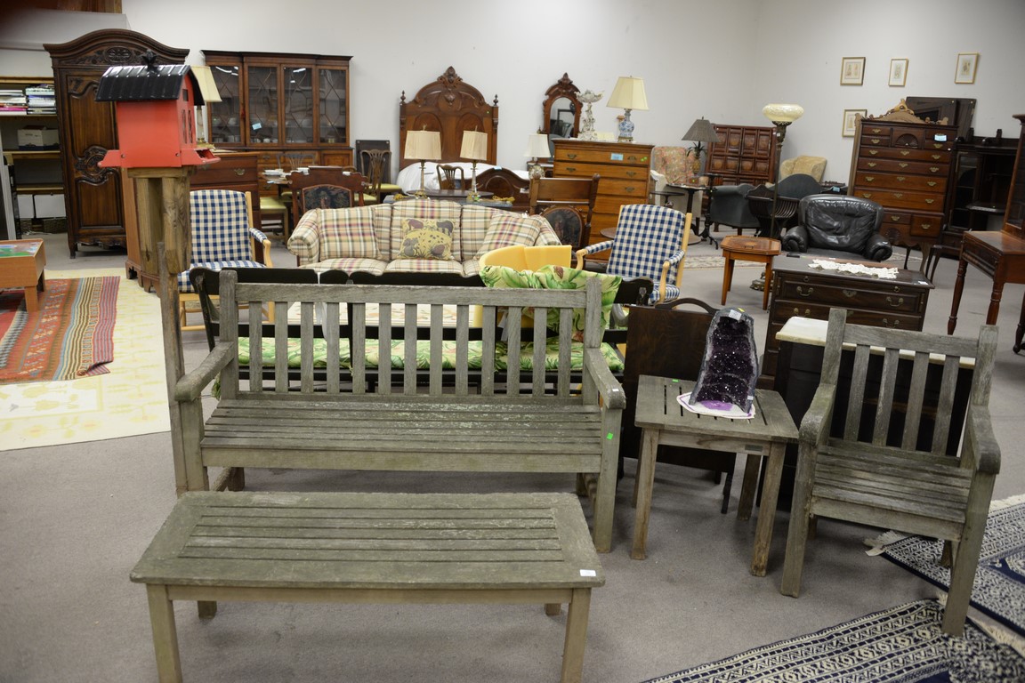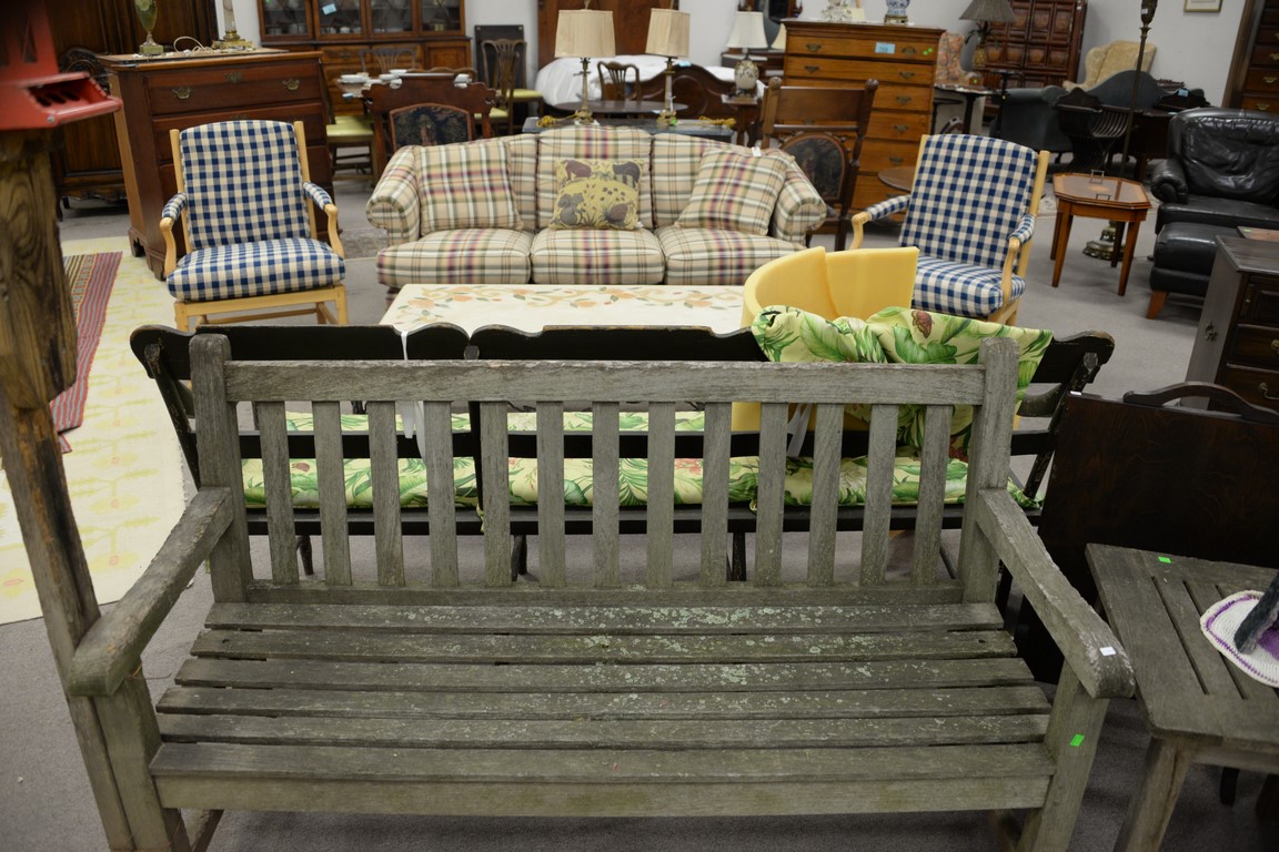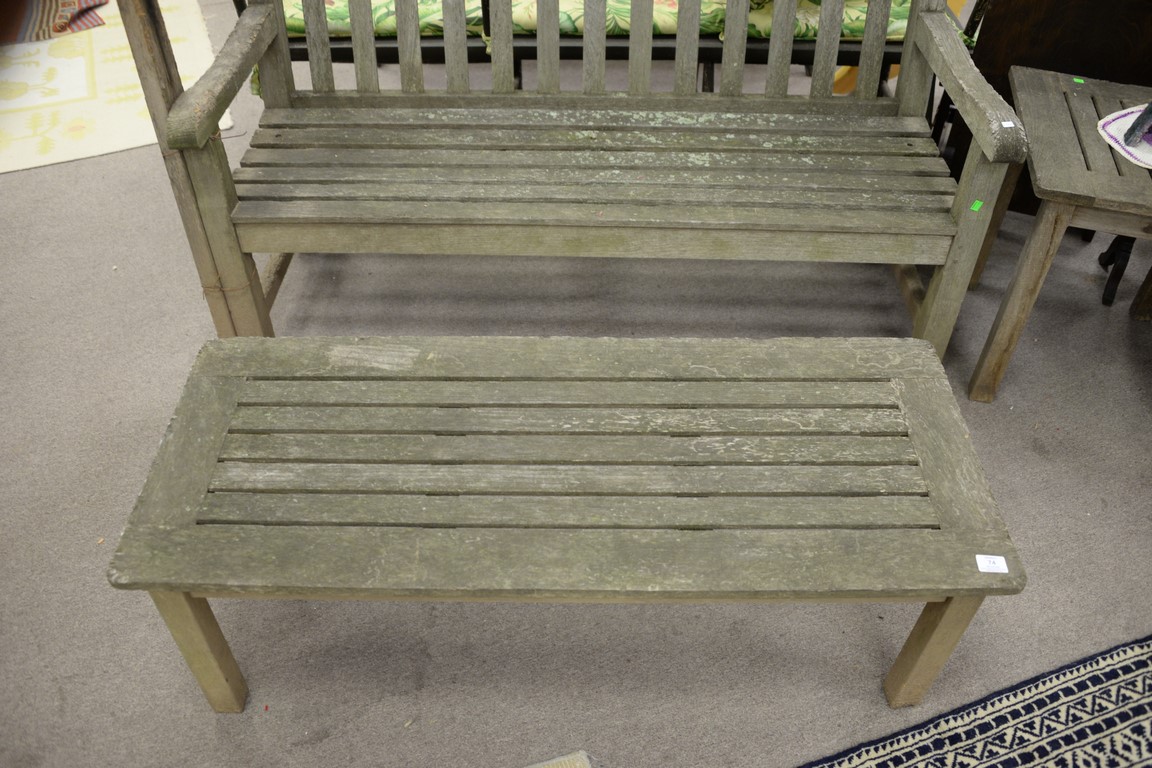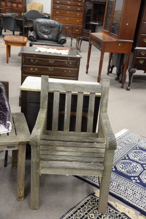 Four teak pieces including bench, armchair, and two tables. bench: lg. 58in.