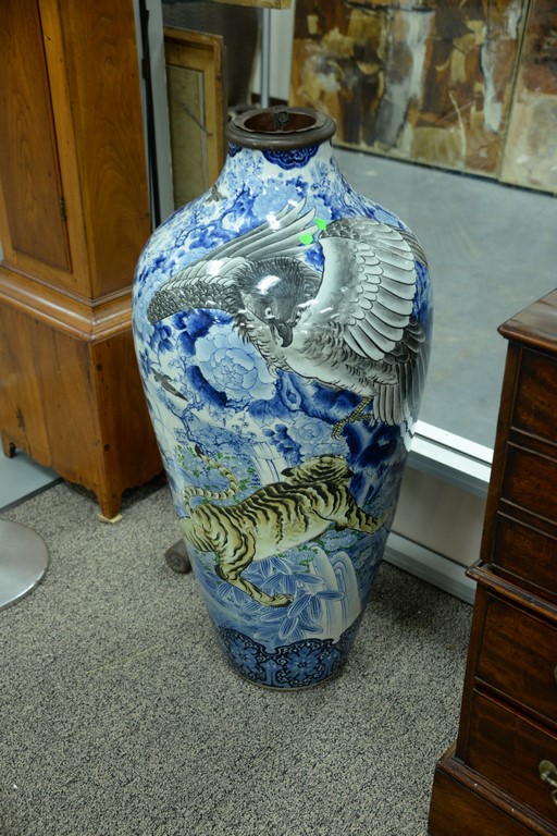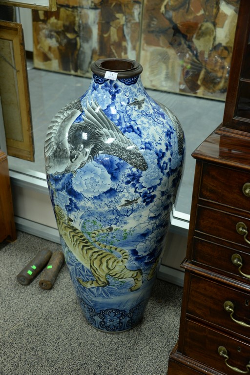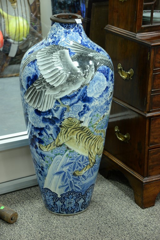 Lot 74: Japanese porcelain palace vase depicting tigers and birds of prey, top cut now fitted with brass sleeve, 19th century. crack near …