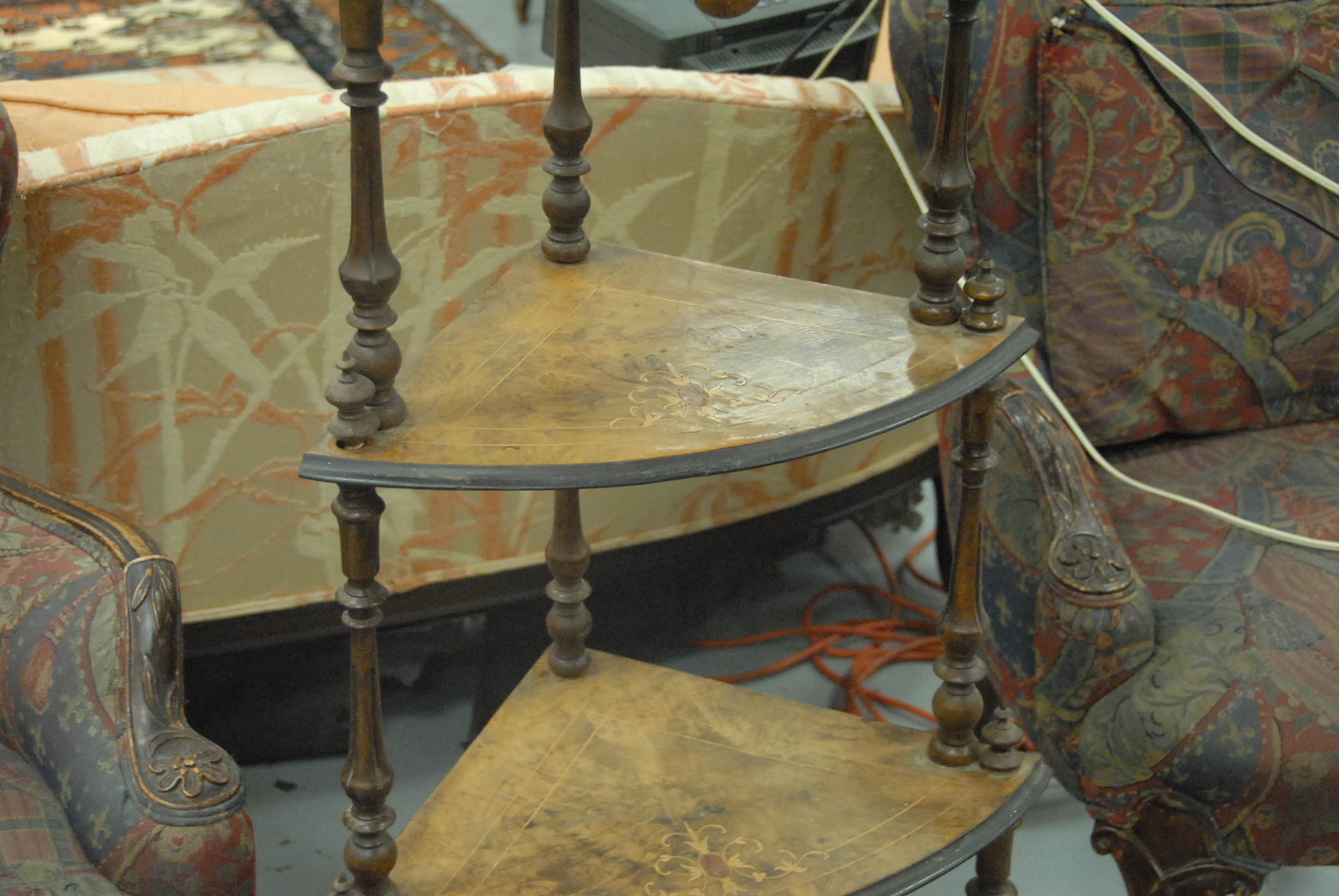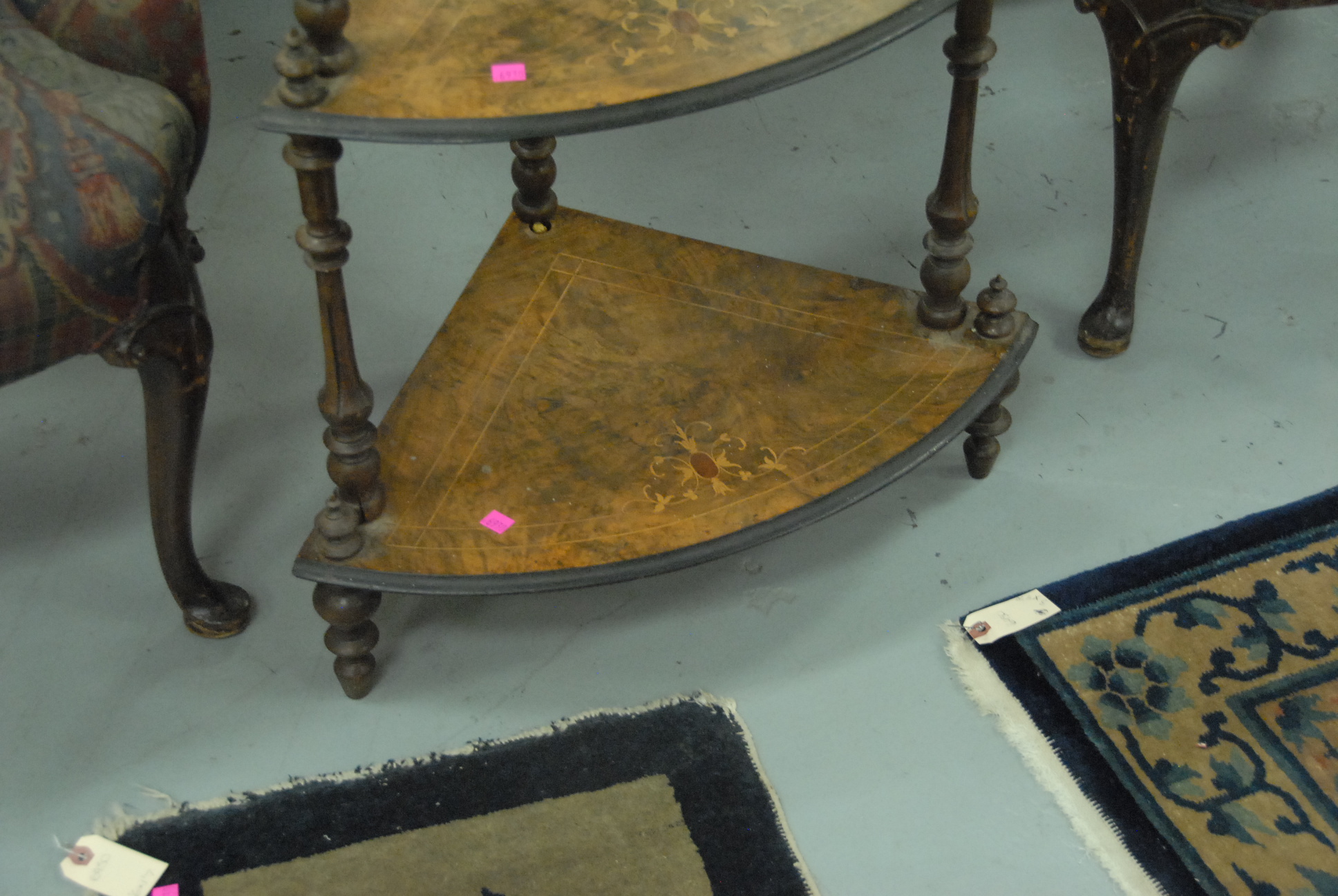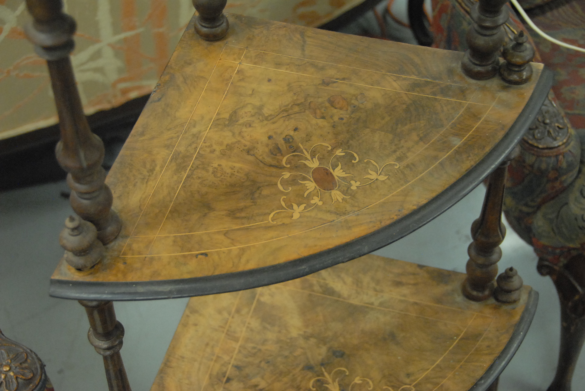 Lot 74: Marquetry inlaid burlwood Victorian corner shelf.