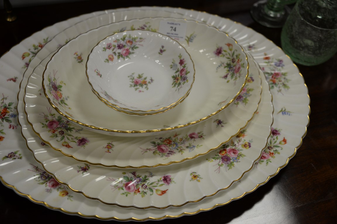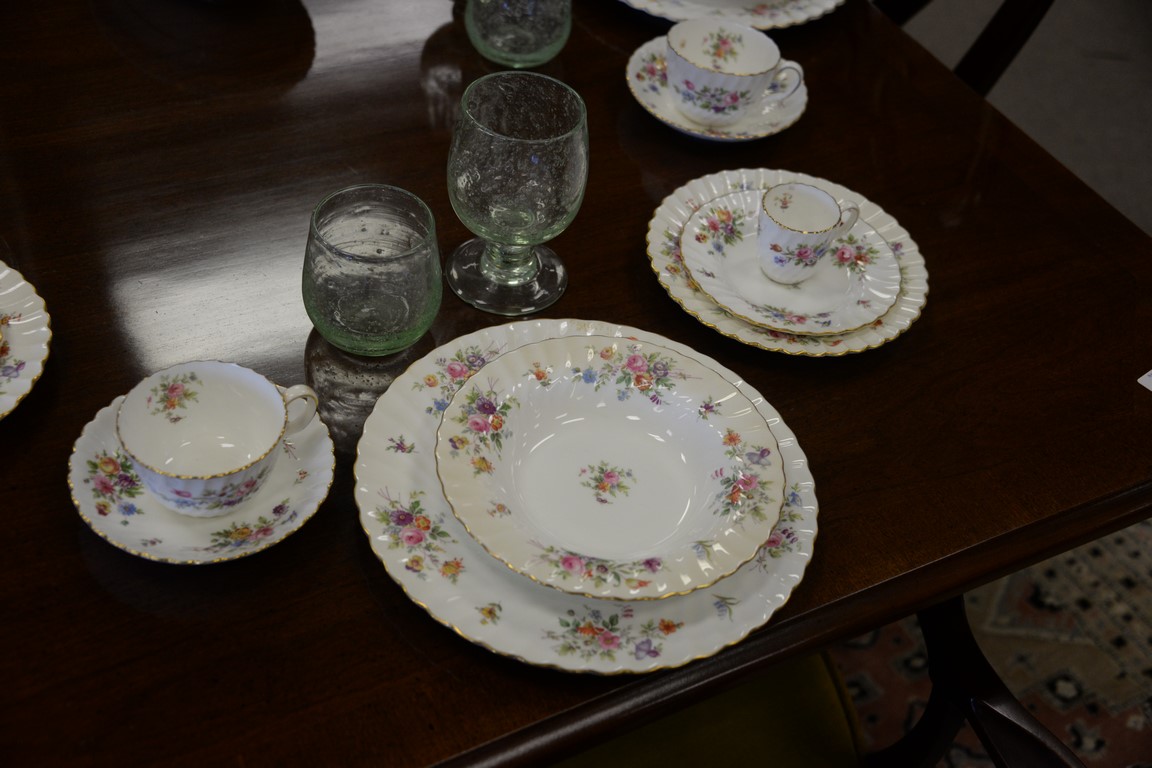 Lot 74: Minton Marlow porcelain dinner set marked Mintons Marlow on bottom service for 8 plus extras including 11 dinner plates, 8 soups, …
