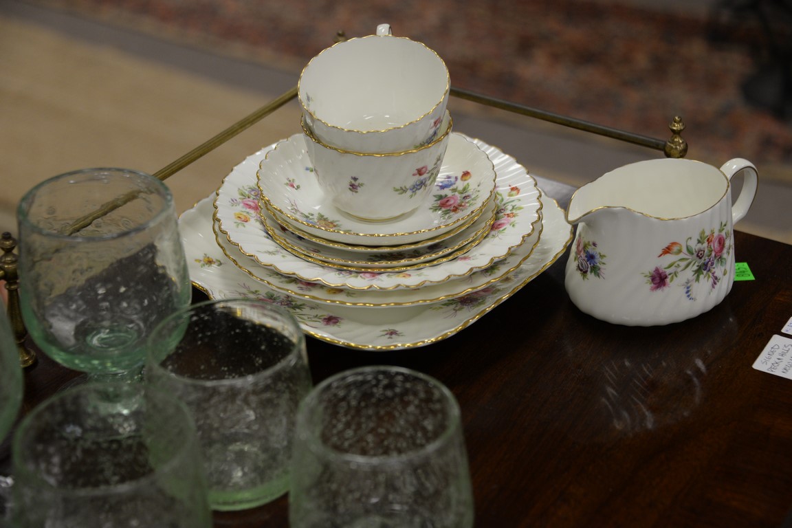 Minton Marlow porcelain dinner set marked Mintons Marlow on bottom service for 8 plus extras including 11 dinner plates, 8 soups, 12 cups, 10 saucers, 8 salad plates, 8 bread and butter plates, 6 demi cups, 5 saucers, and serving pieces.