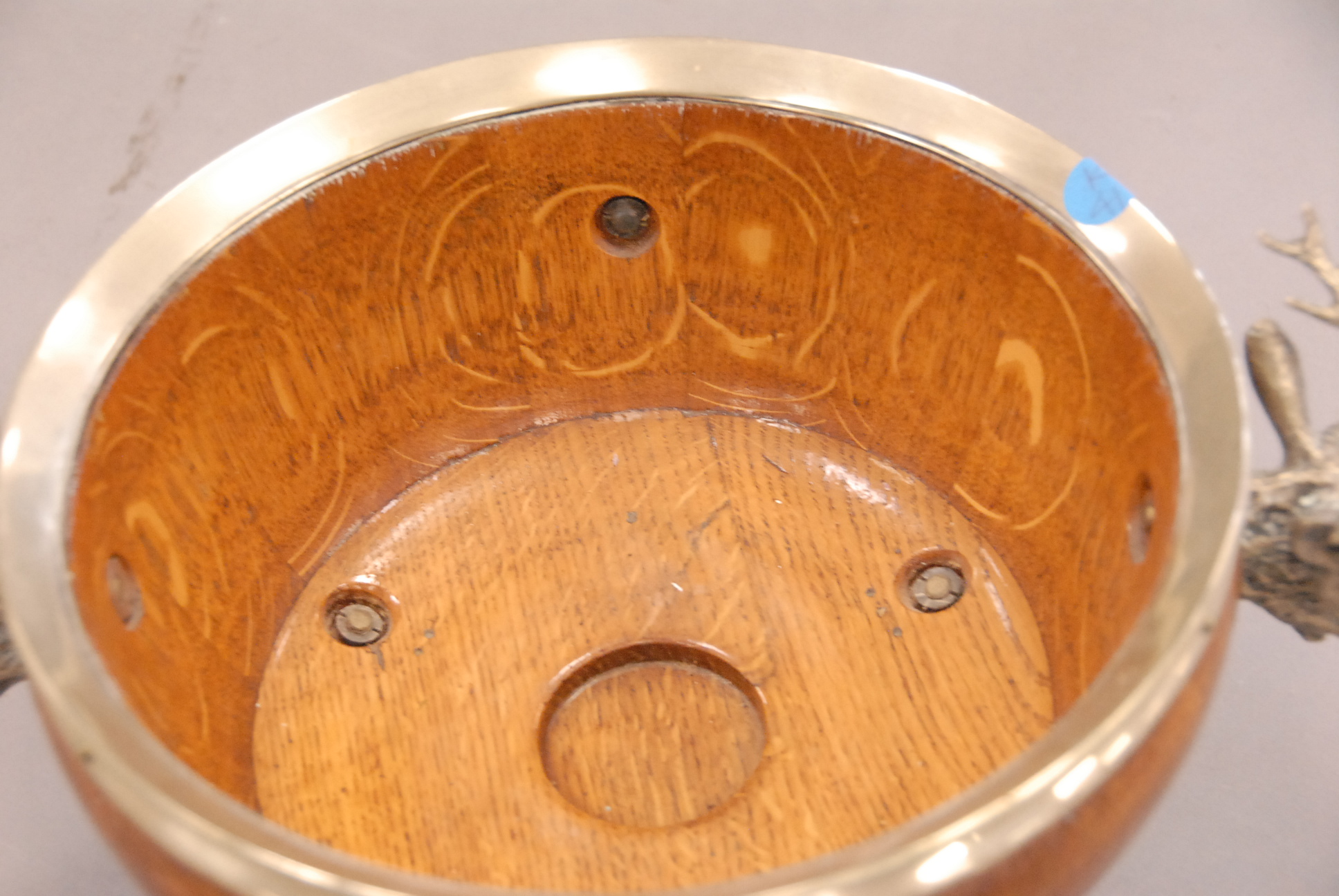 Oak and silver plated salad bowl on hoof feet with stag head handles with matching two piece fork and spoon set, bowl marked wedgwood.
