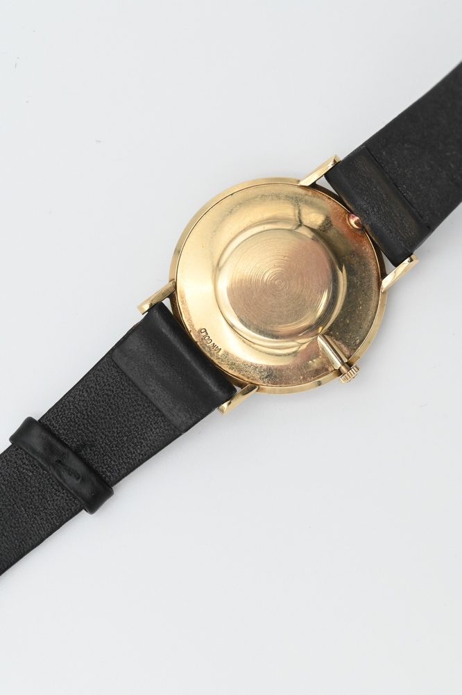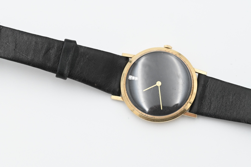 Lot 74: Omega 14 Karat Gold Men’s Wristwatch, set with three small diamonds, 32.8 millimeters.