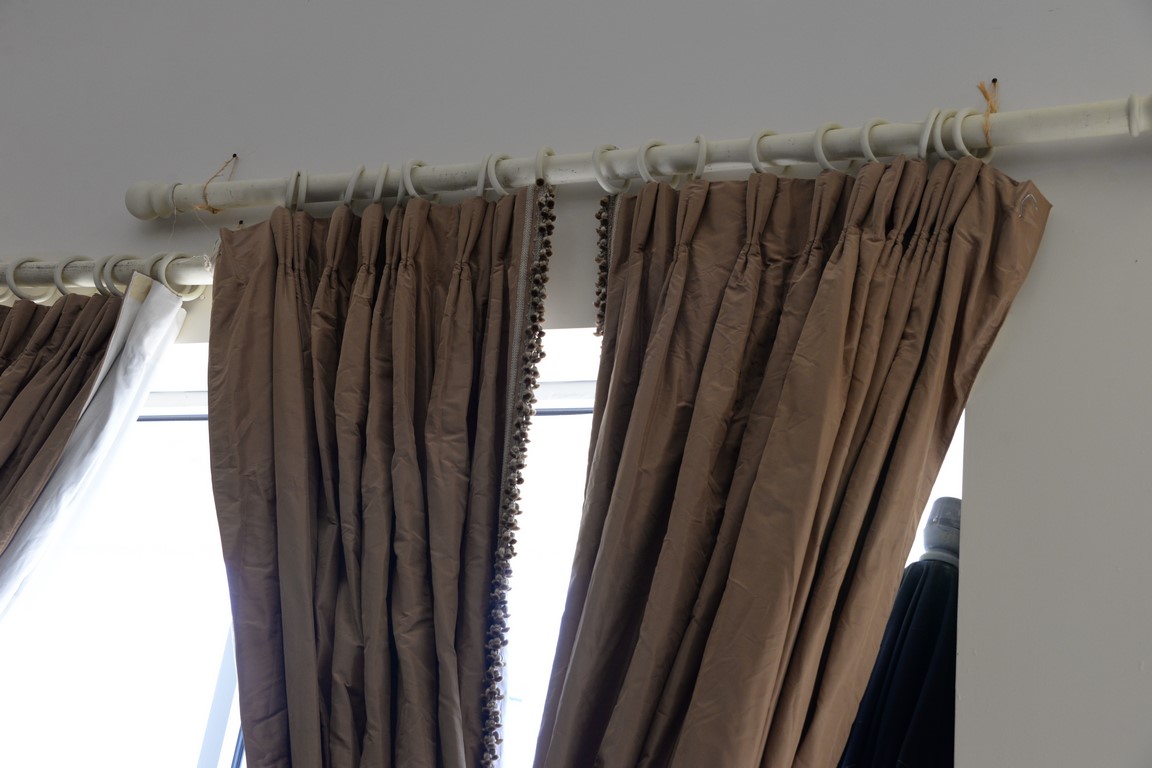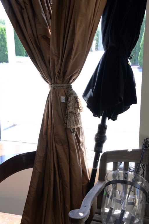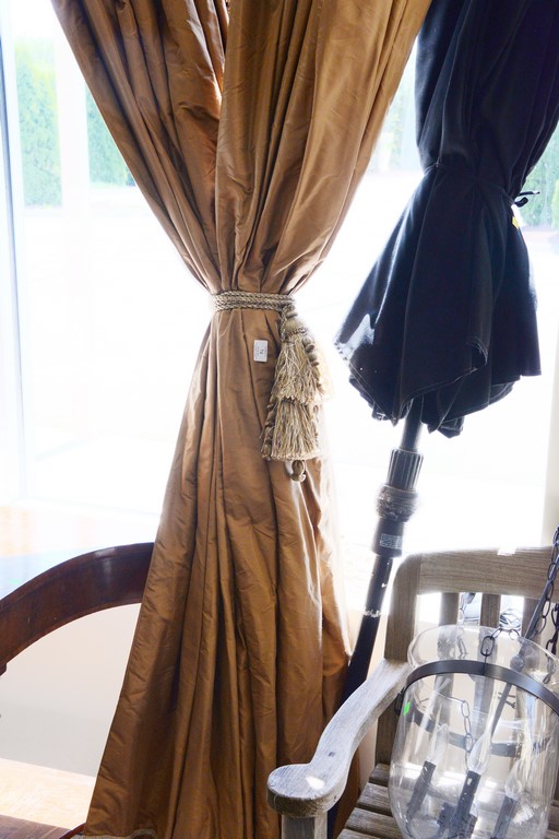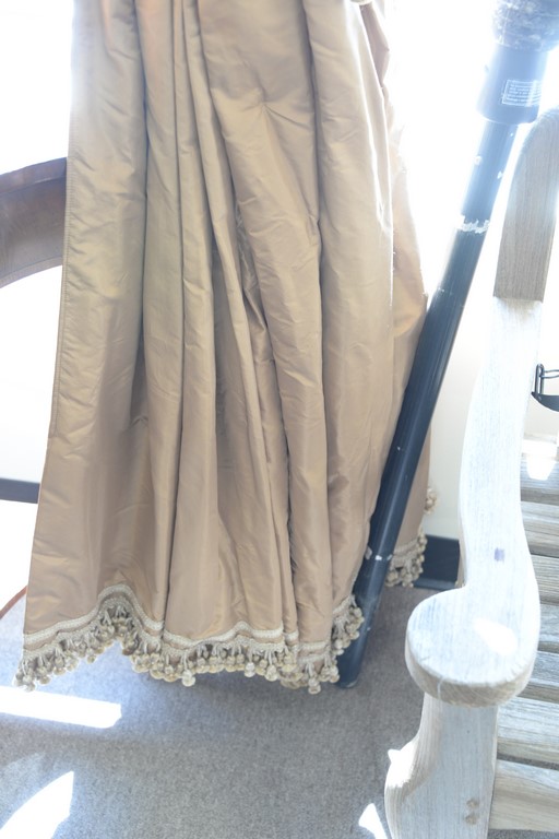 Lot 74: Pair of custom tan silk drapes, lined curtains, window or door treatment. approximate measurements: lg. 114in., wd. 92in. Provenance…
