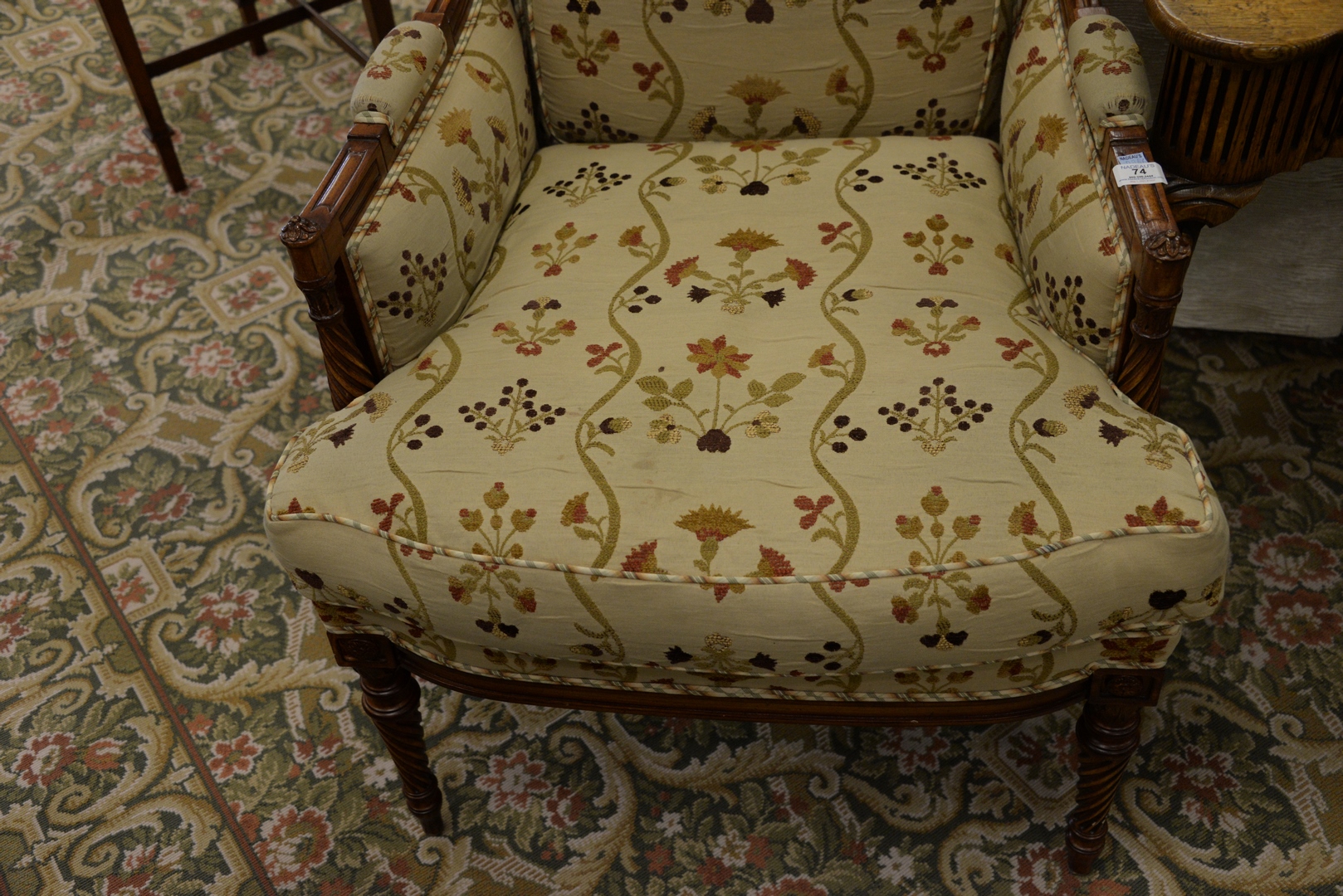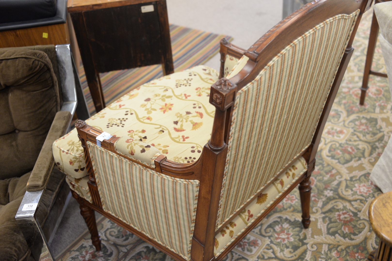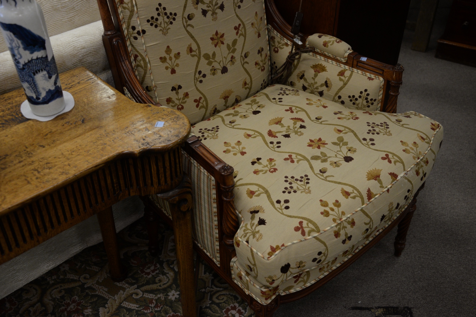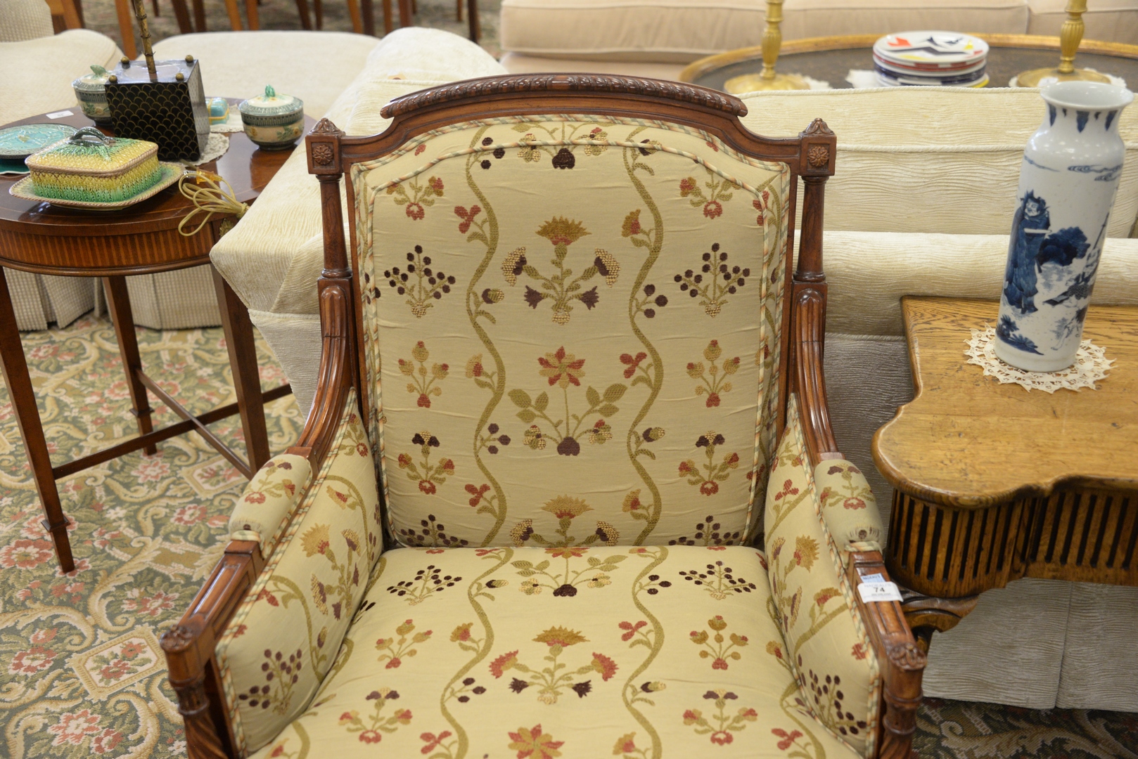 Pair of Louis XVI Style Custom Bergeres, height 39 inches, (one having slight soiling).