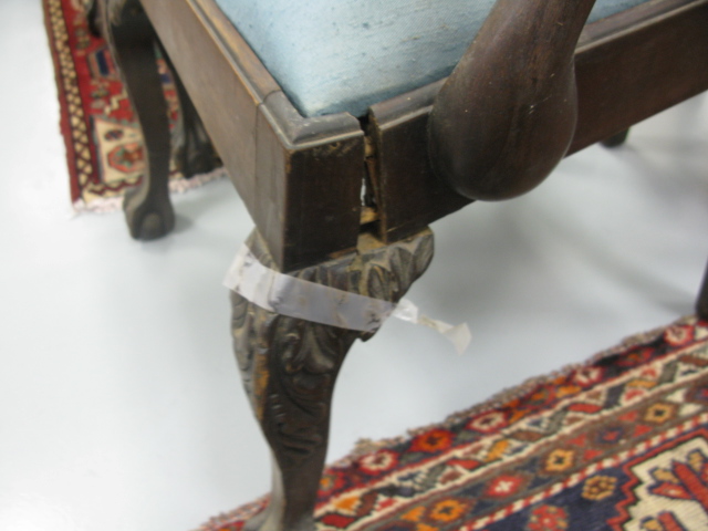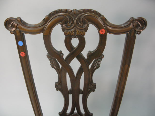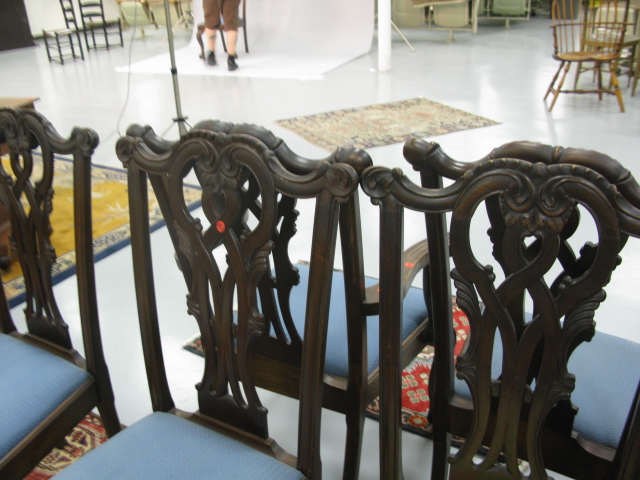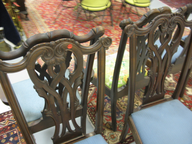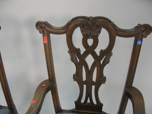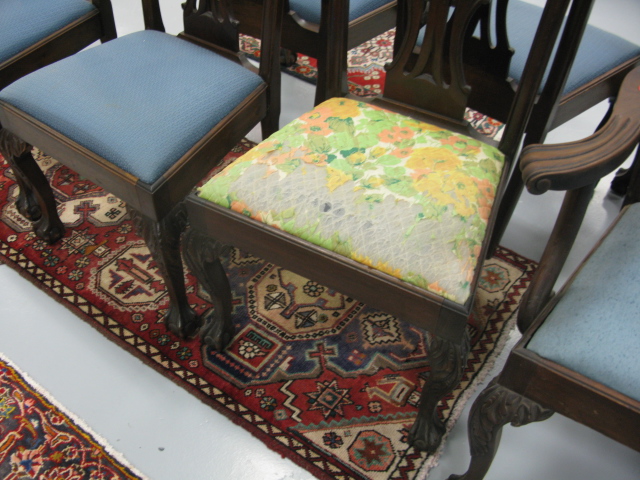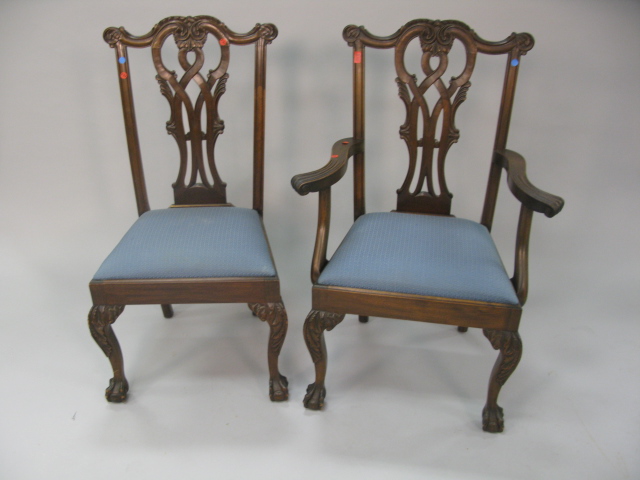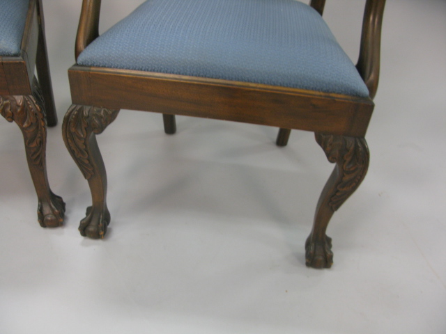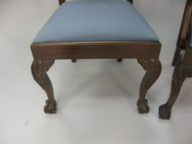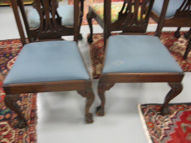Set of eight Chippendale style ball and claw foot dining chairs, two arm and six side, one armchair as is from the estate of Broadway actress Leta Gold