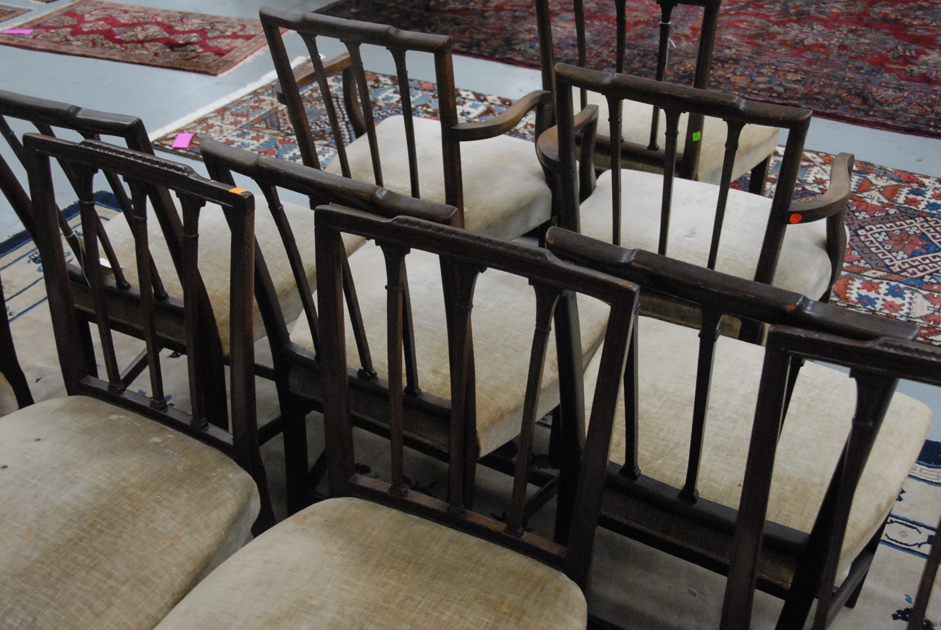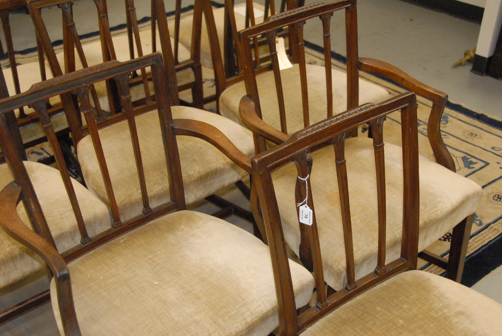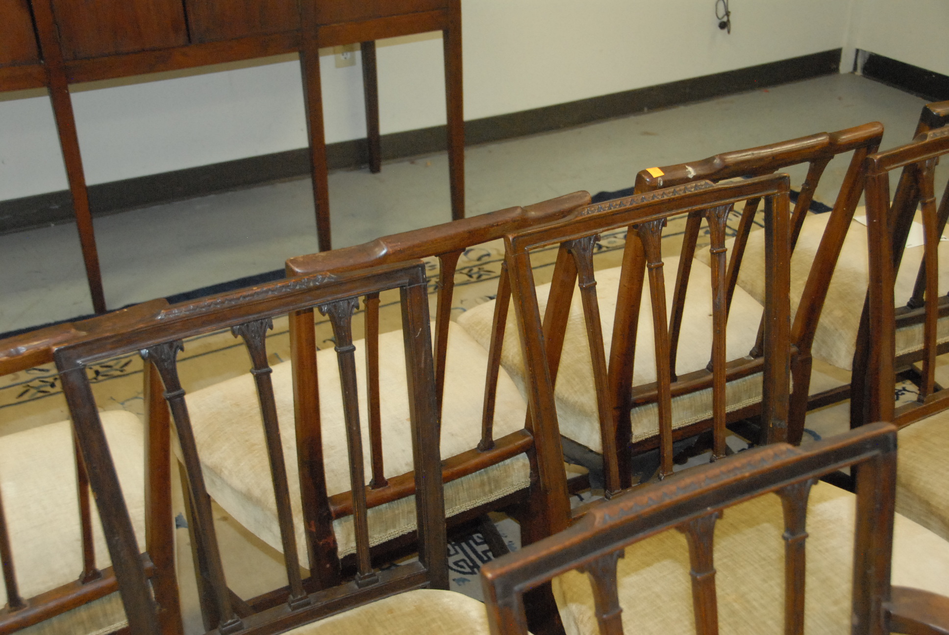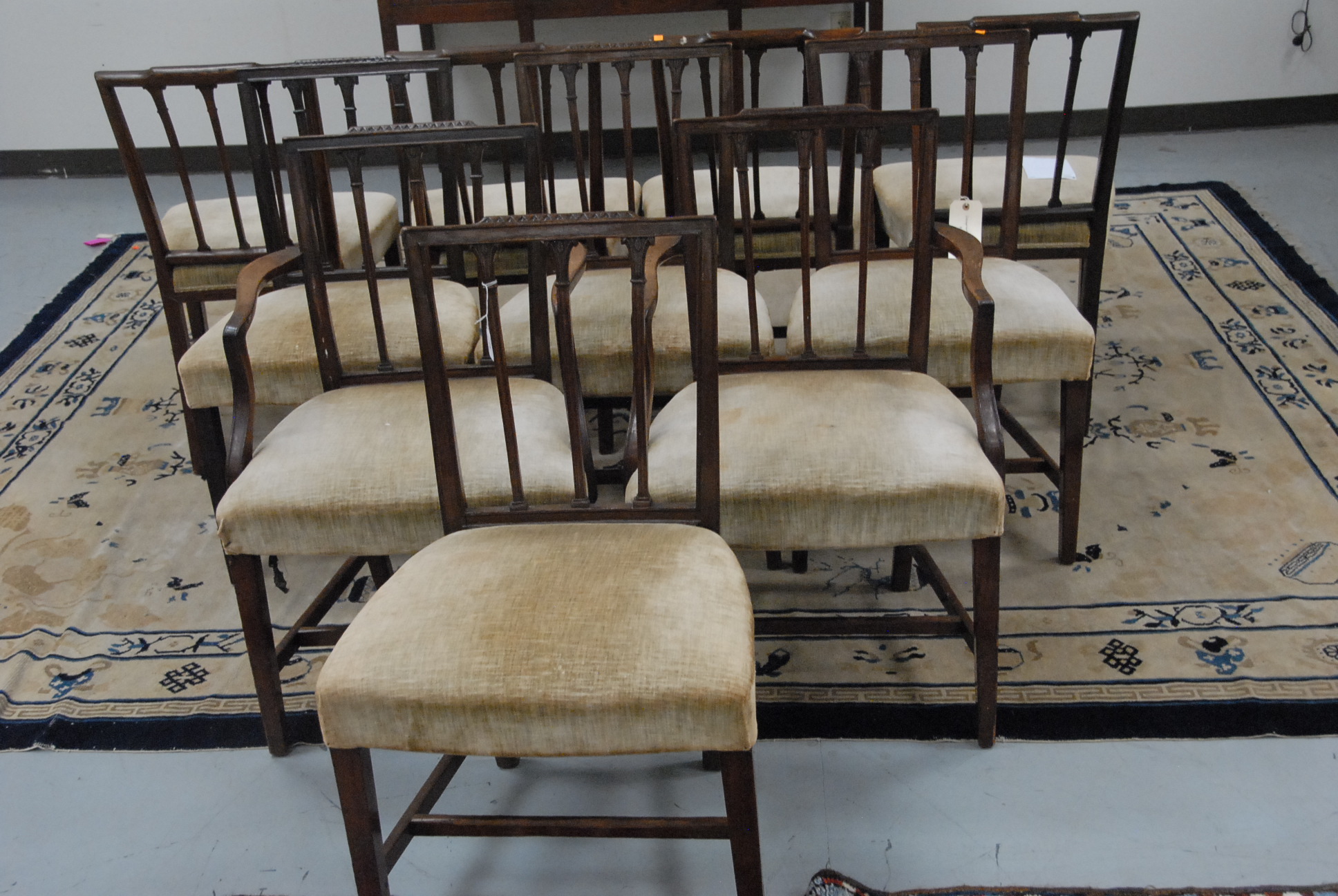 Lot 74: Set of ten George III mahogany dining chairs having square backs on fully upholstered seats on square legs, circa 1780-1810, two armchairs and eight side chairs.