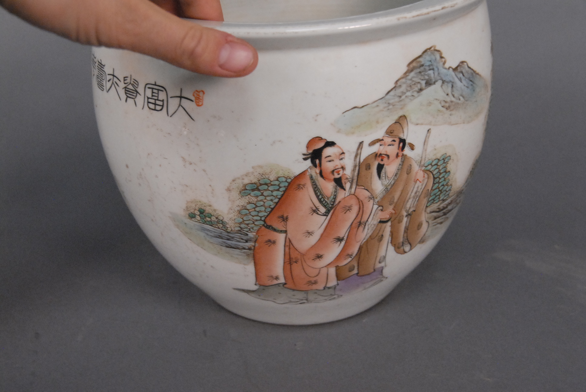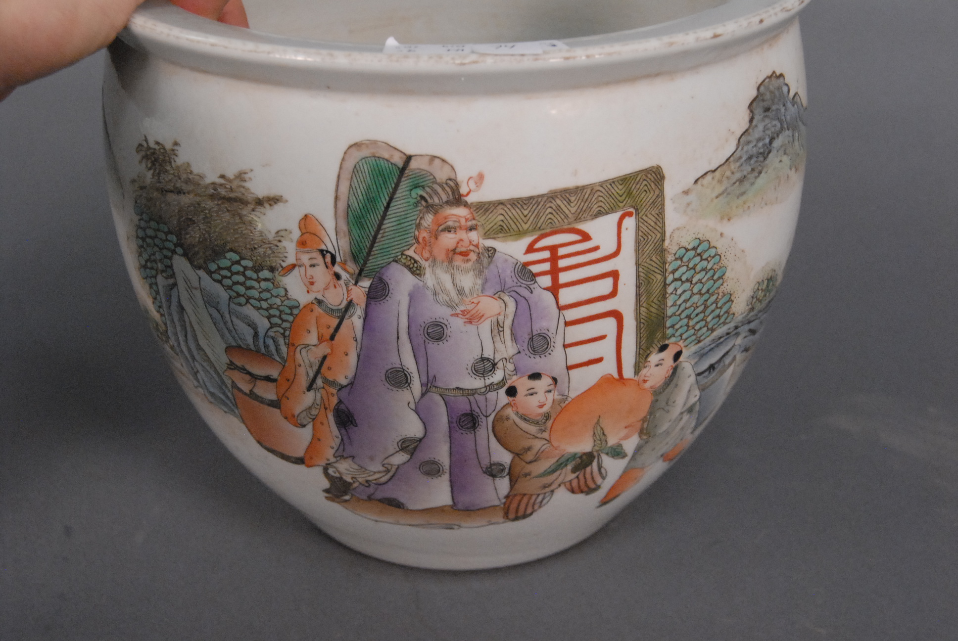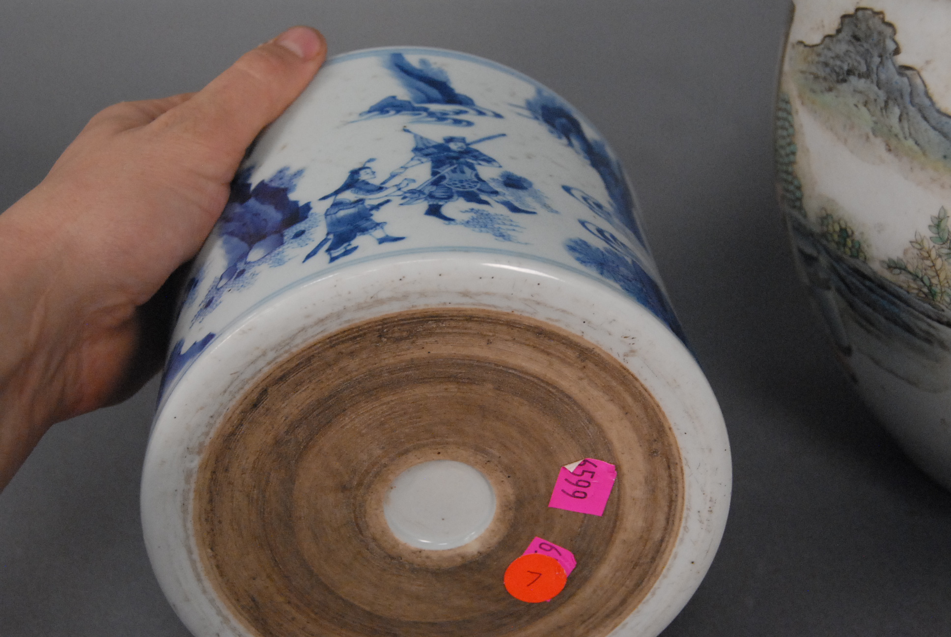 Three Oriental porcelain pieces two blue and white brush pots with painted landscapes ht. 3 3/4in. dia. 7in. & ht. 6in. dia. 7in., and a famille rose planter painted with warrior figures in a landscape ht. 9in. dia. 10in.