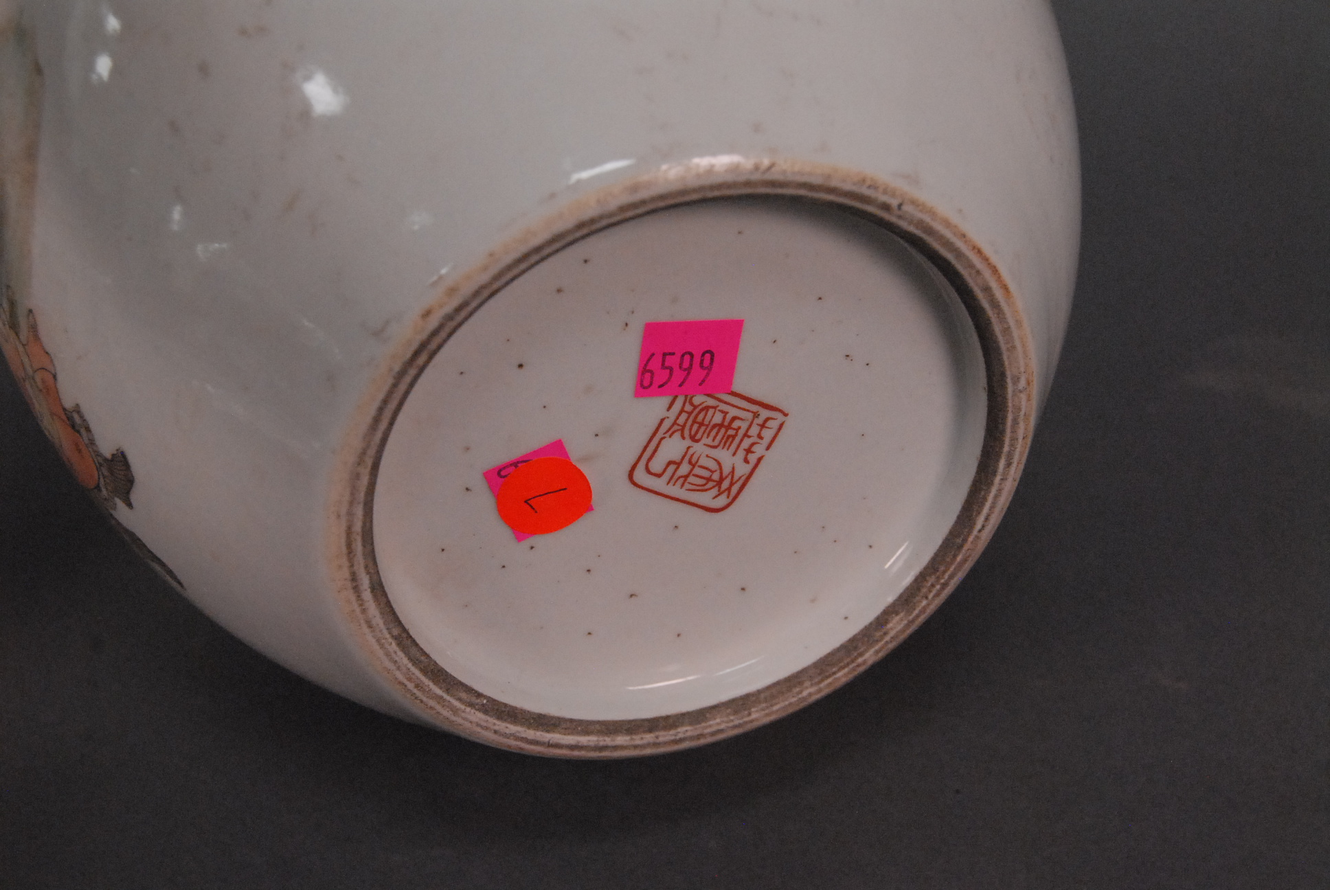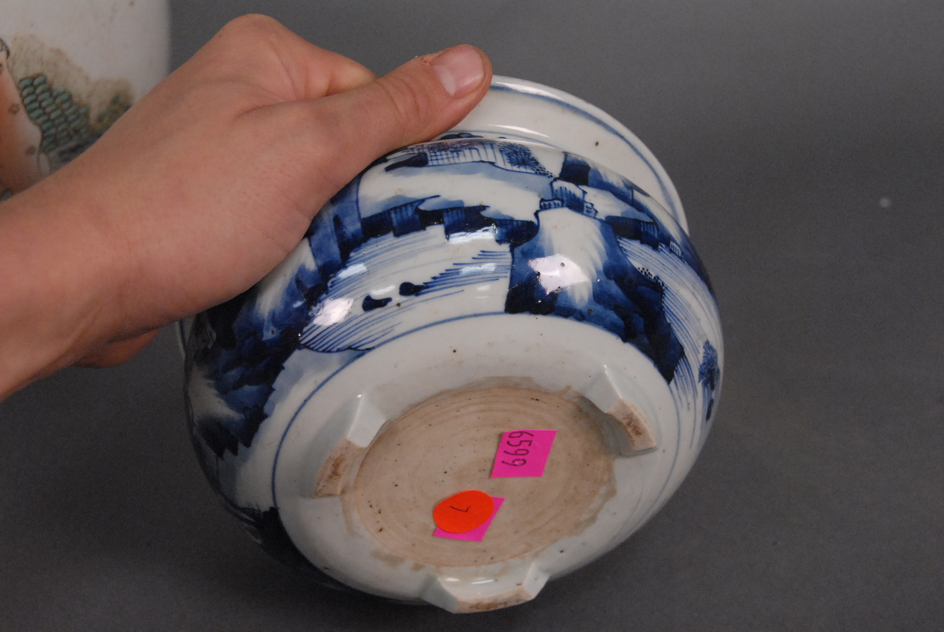 Lot 74: Three Oriental porcelain pieces two blue and white brush pots with painted landscapes ht. 3 3/4in. dia. 7in. & ht. 6in. dia. 7in…