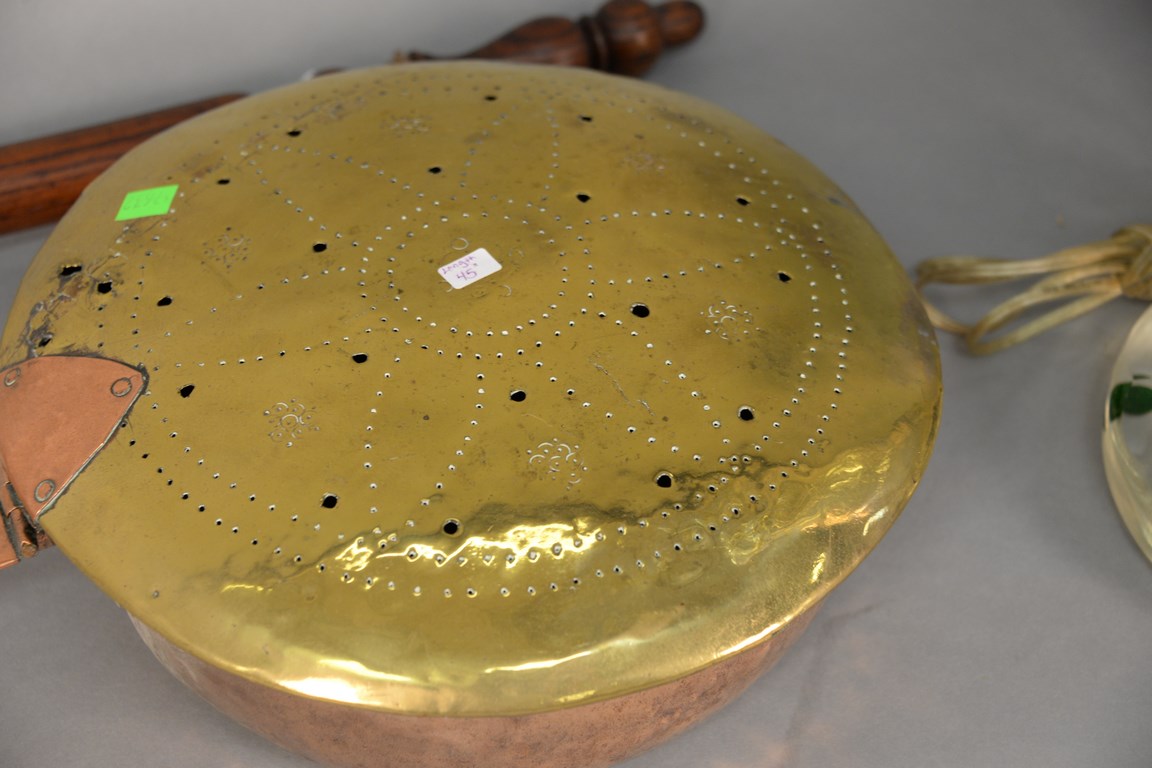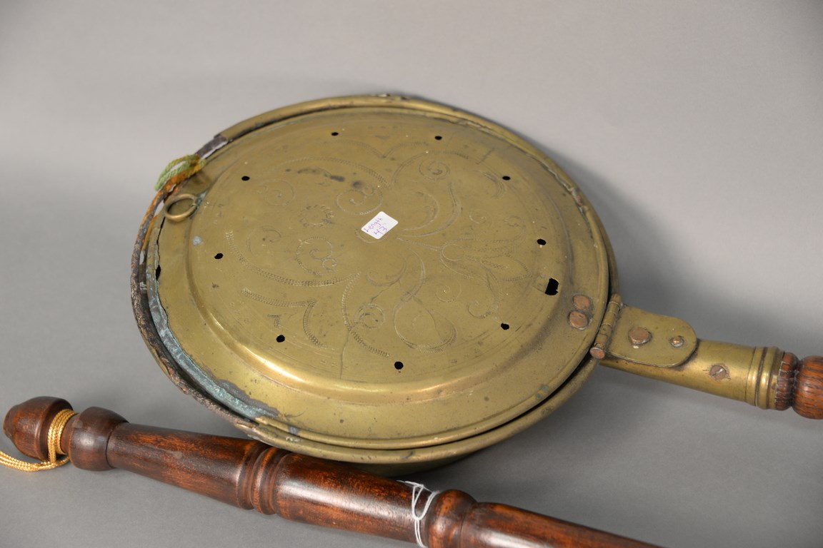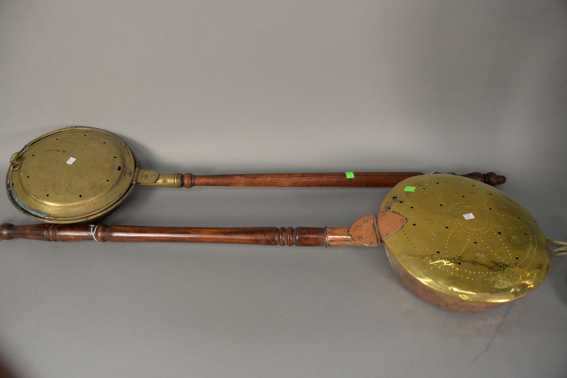 Two brass bed warmers. lg. 43 in. & 45 in.