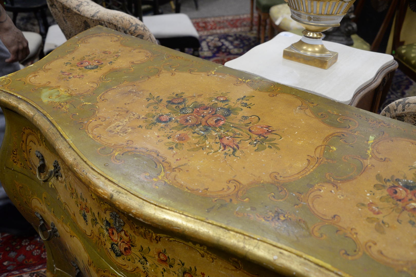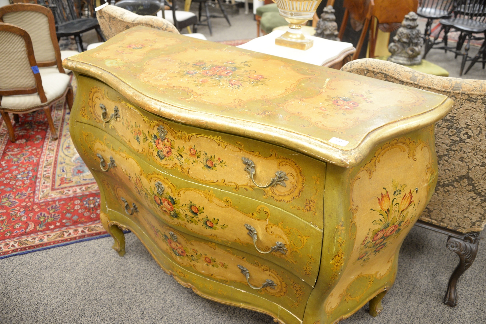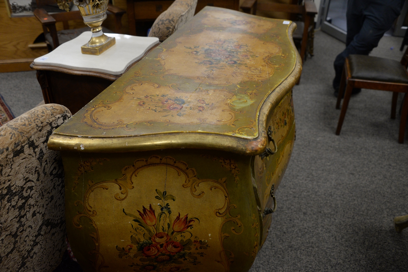 Lot 741: Venetian Style Commode, paint decorated, having three drawers with bombay sides and front, height 37 inches, width 50 inches, small…