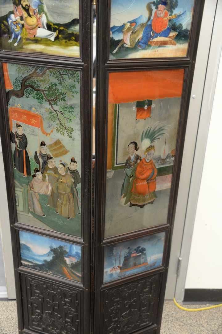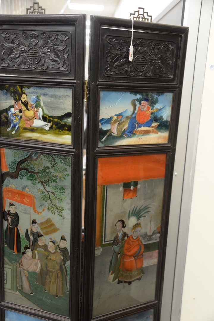 Lot 749: Chinese Two Panel Folding Screen, each panel having hardwood frame, two carved panels and three reverse paintings on glass, panels d…