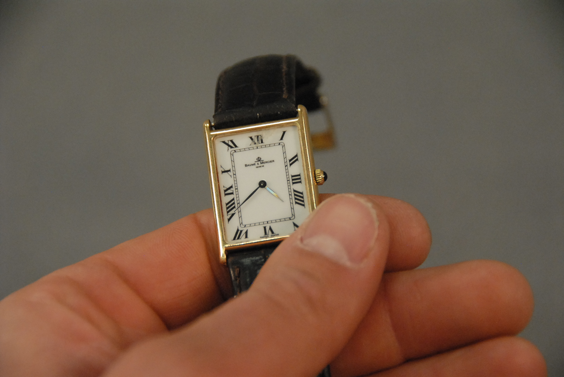 Lot 74A: Baum & Mercier wristwatch, 14K gold having white dial with black roman numerals and hands with leather band, signed Baum & Mercier.