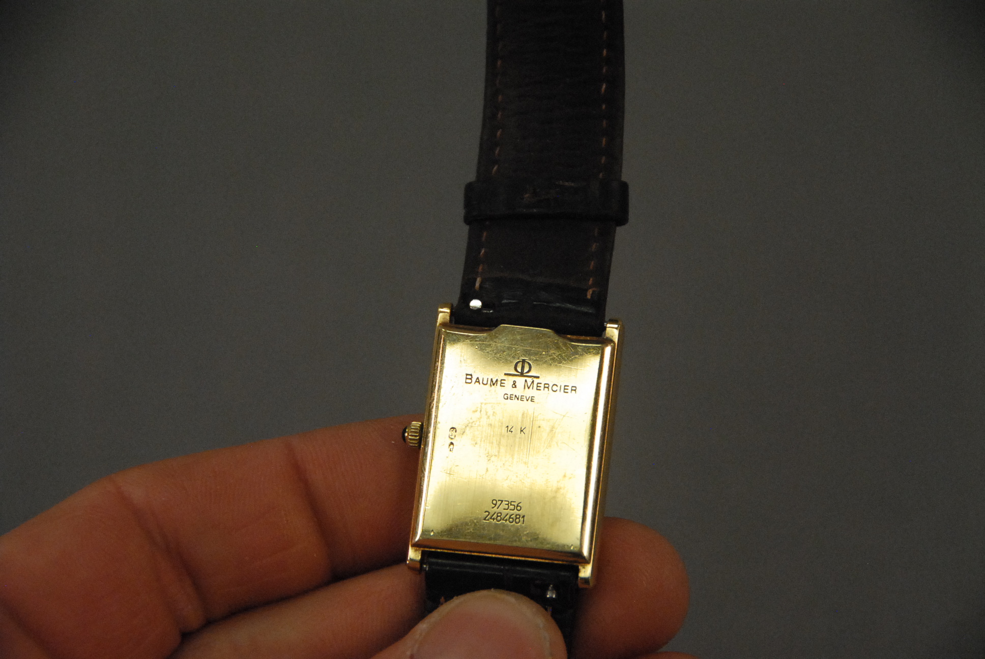Baum & Mercier wristwatch, 14K gold having white dial with black roman numerals and hands with leather band, signed Baum & Mercier.