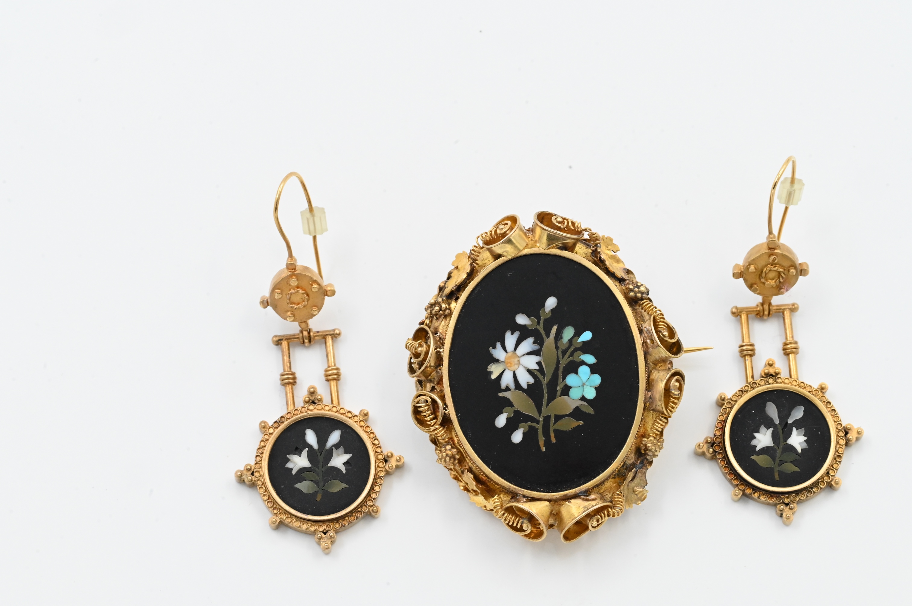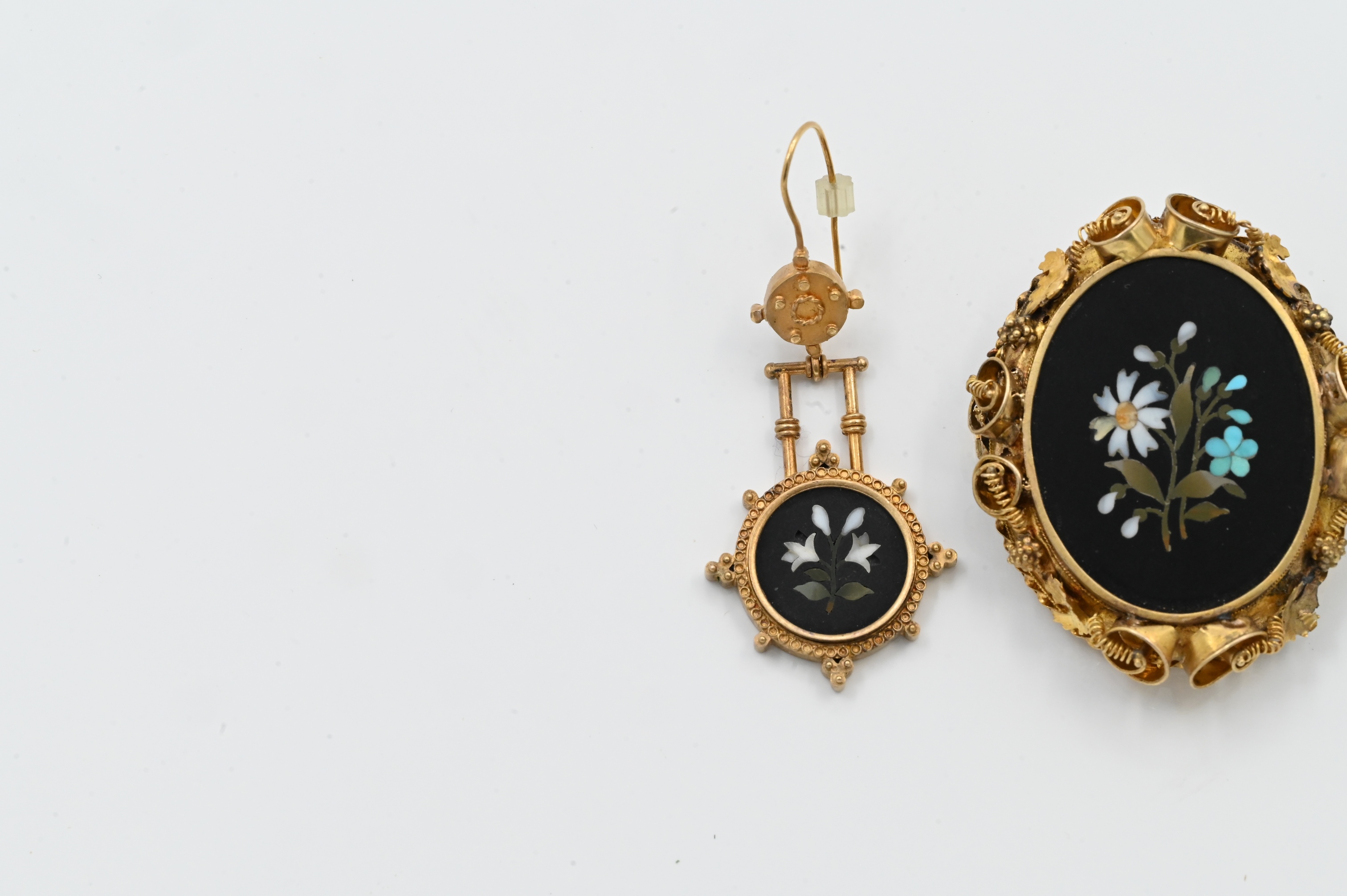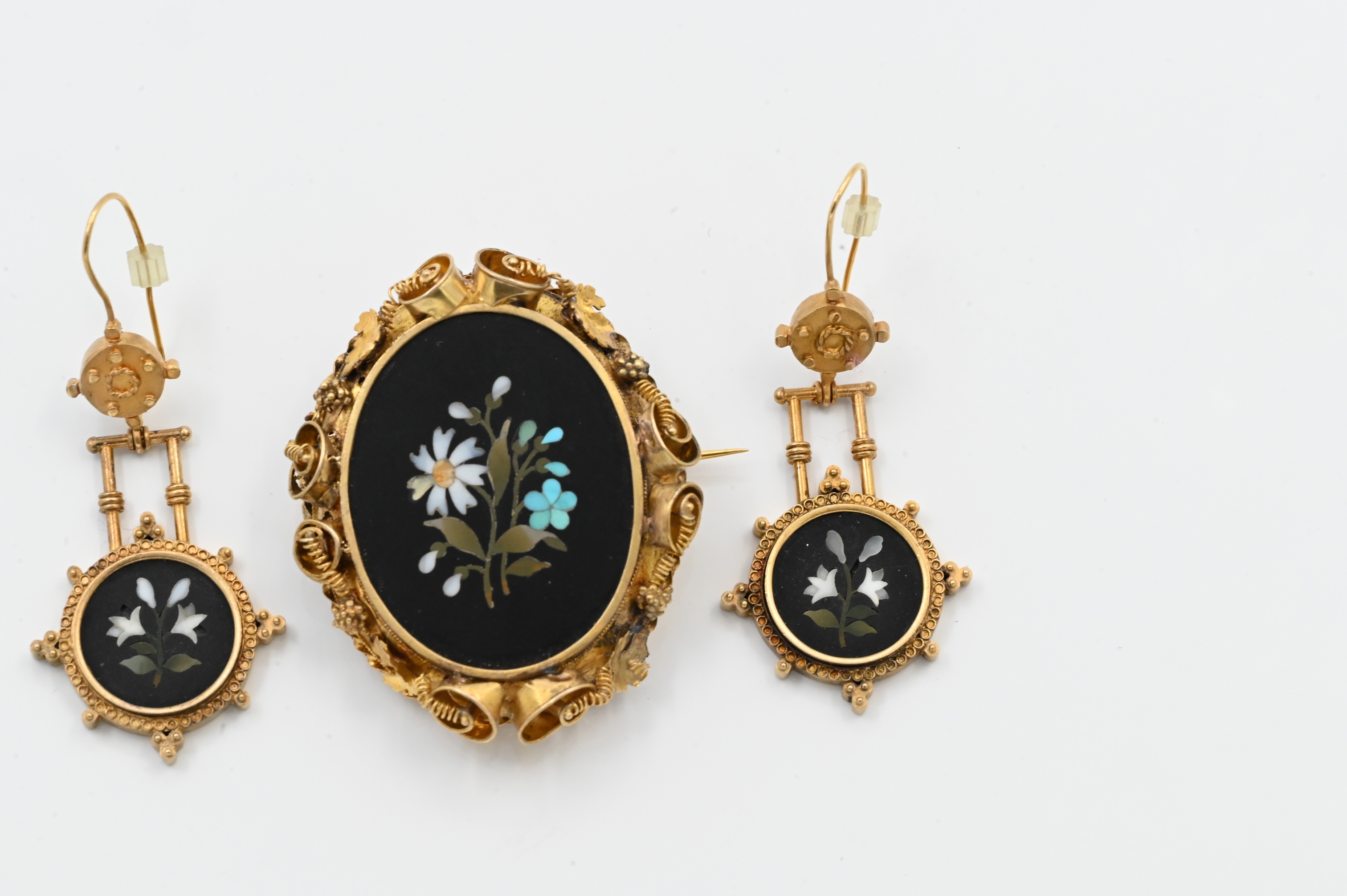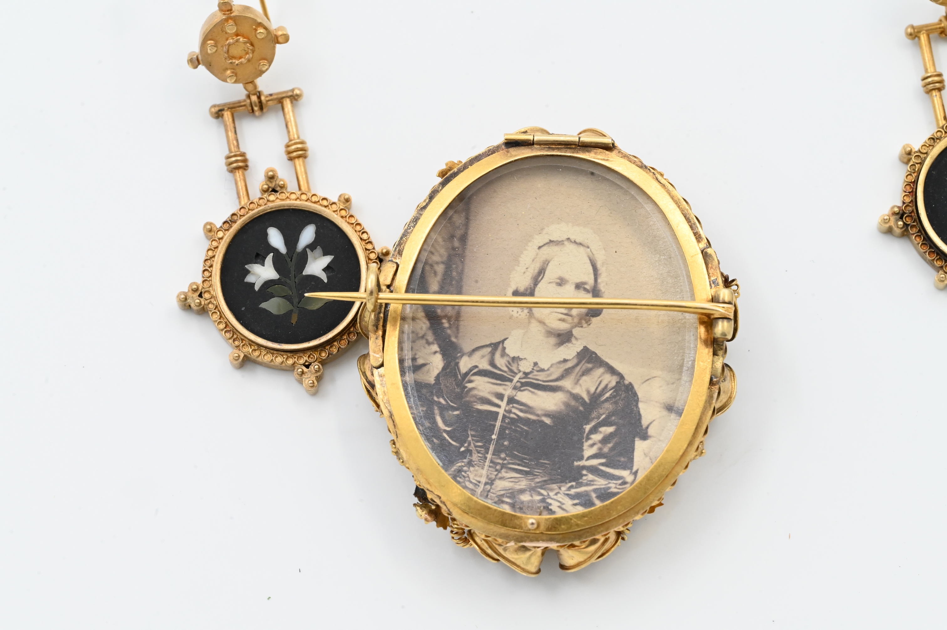 consisting of micro mosaic locket/brooch and earrings set with micro mosaic centers, 27.3 grams total weight.