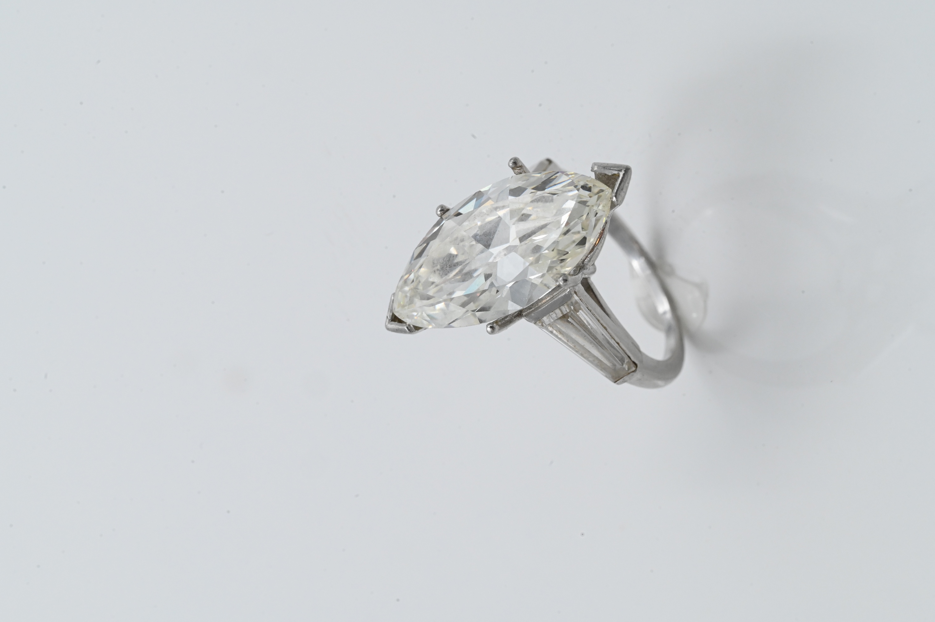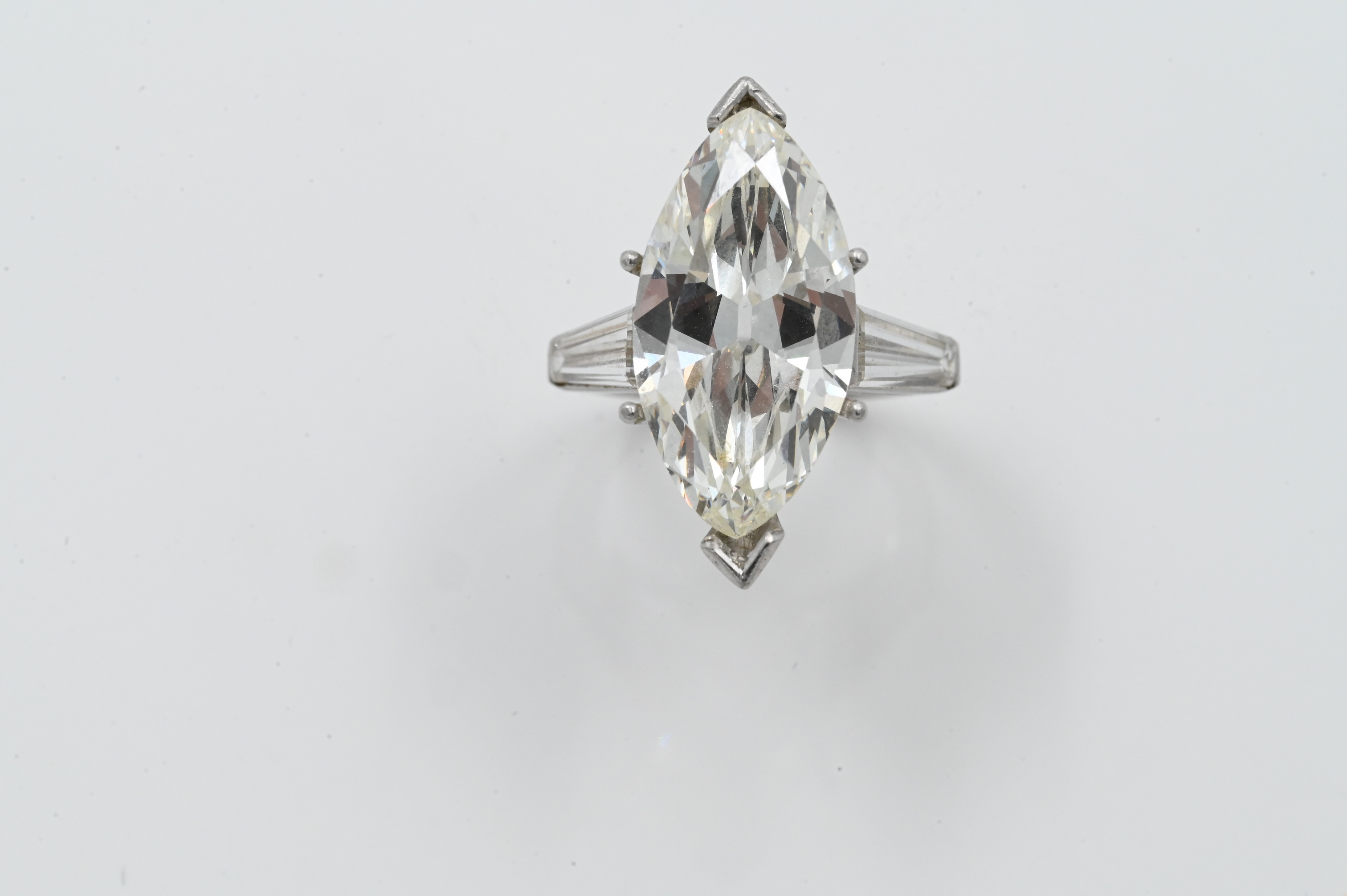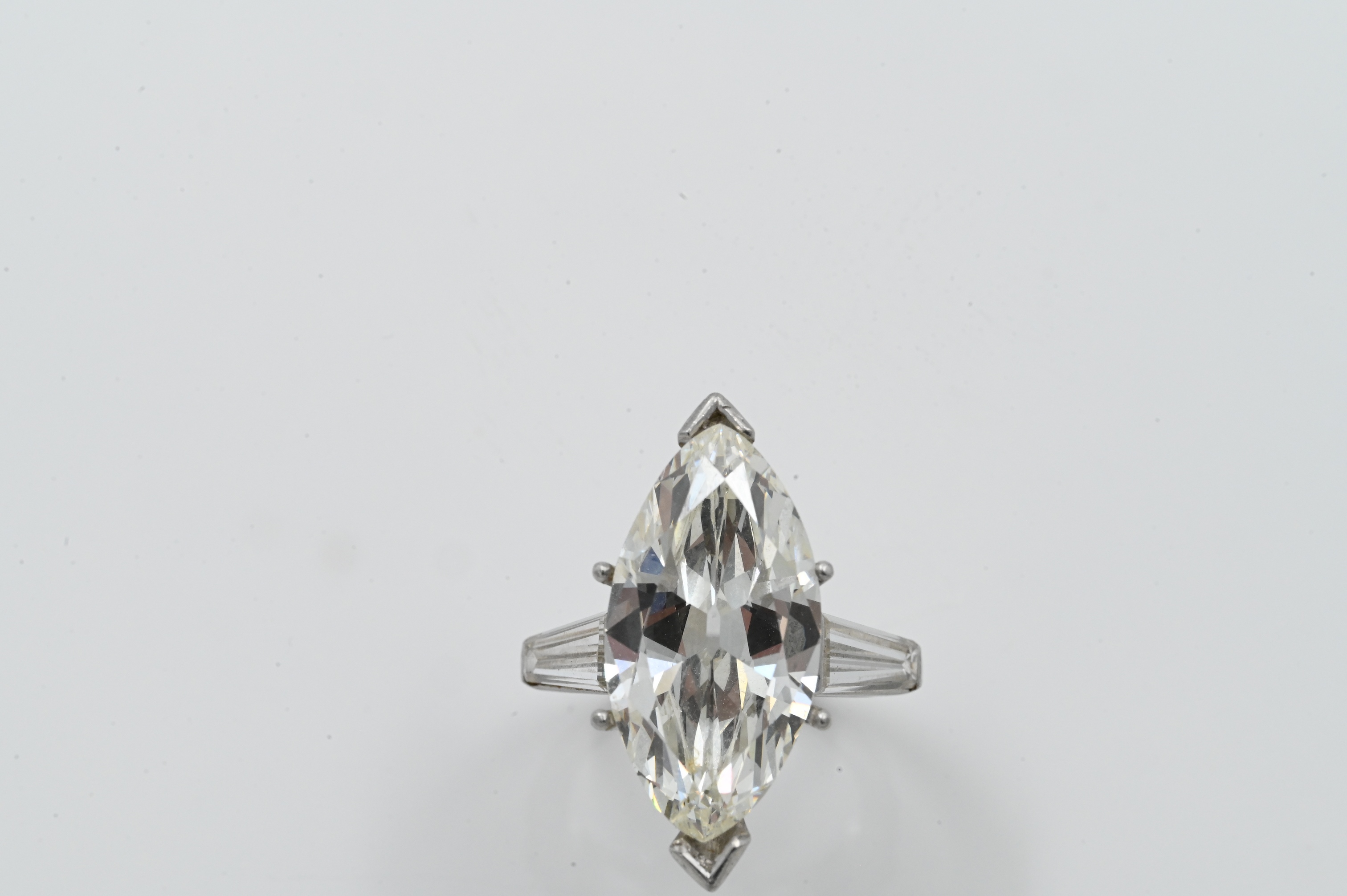 set with 7.15 carat marquise diamond color L, VS1, flanked by tapered baguettes in platinum setting, GIA report number 6233459416