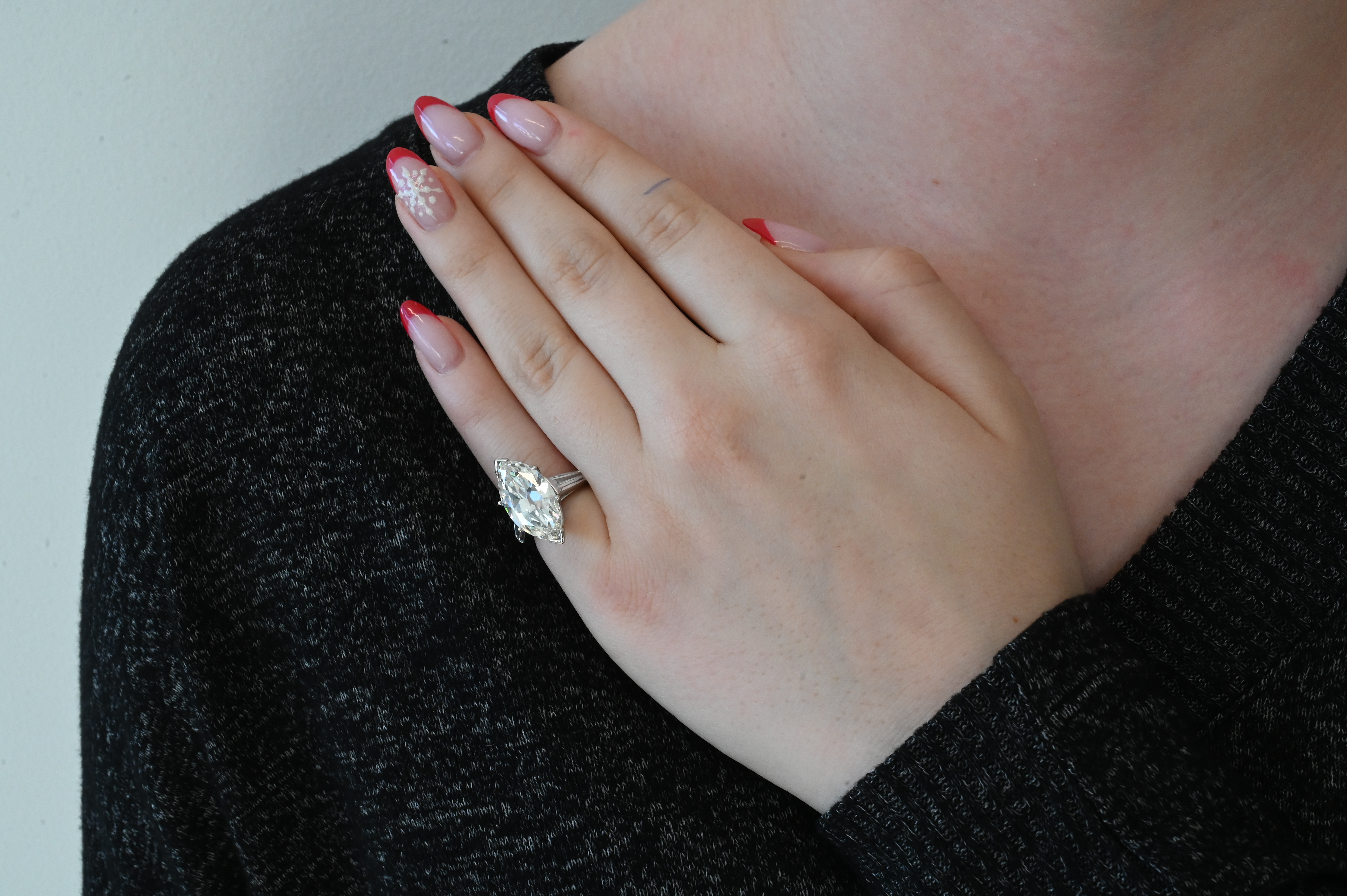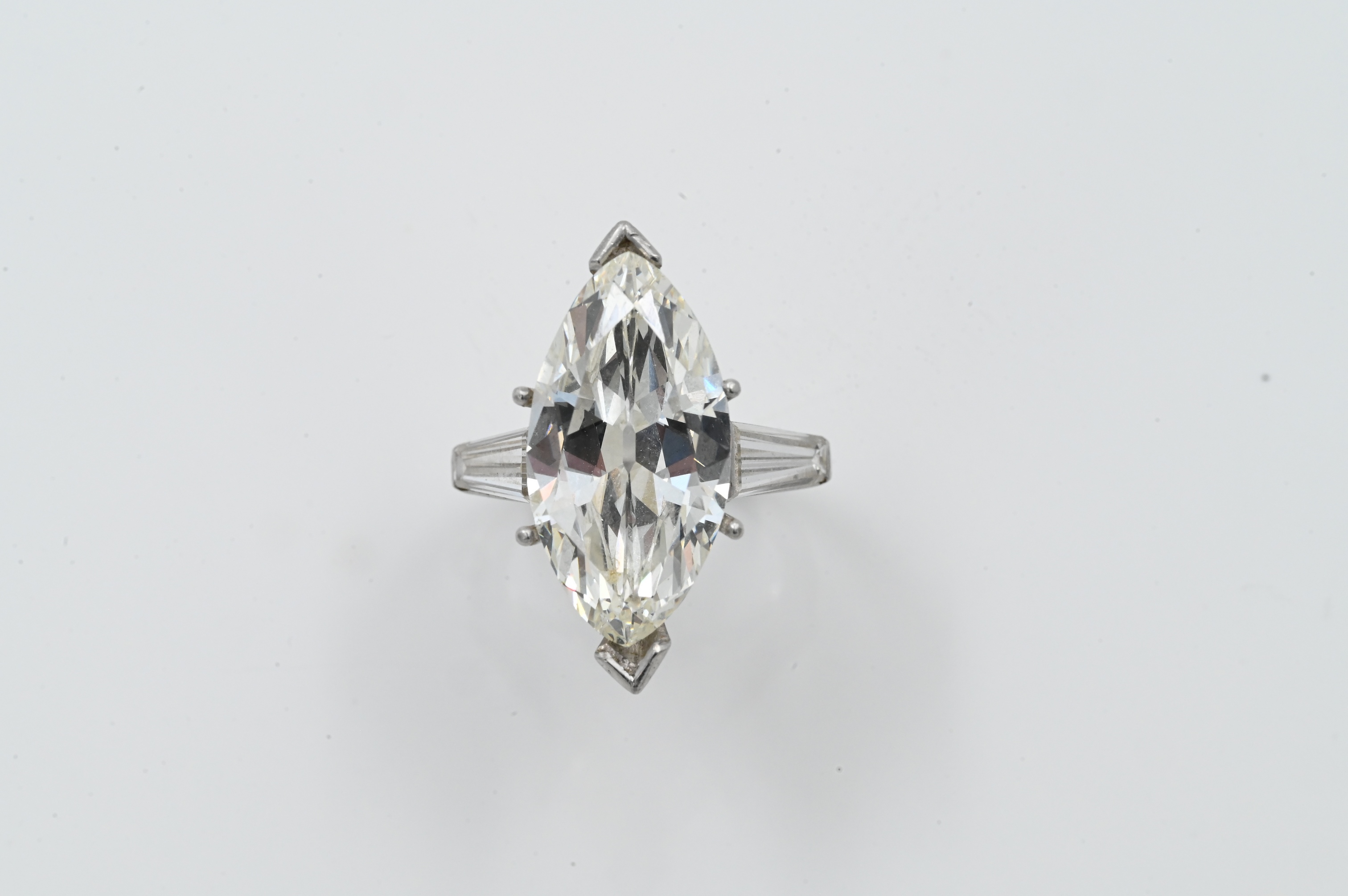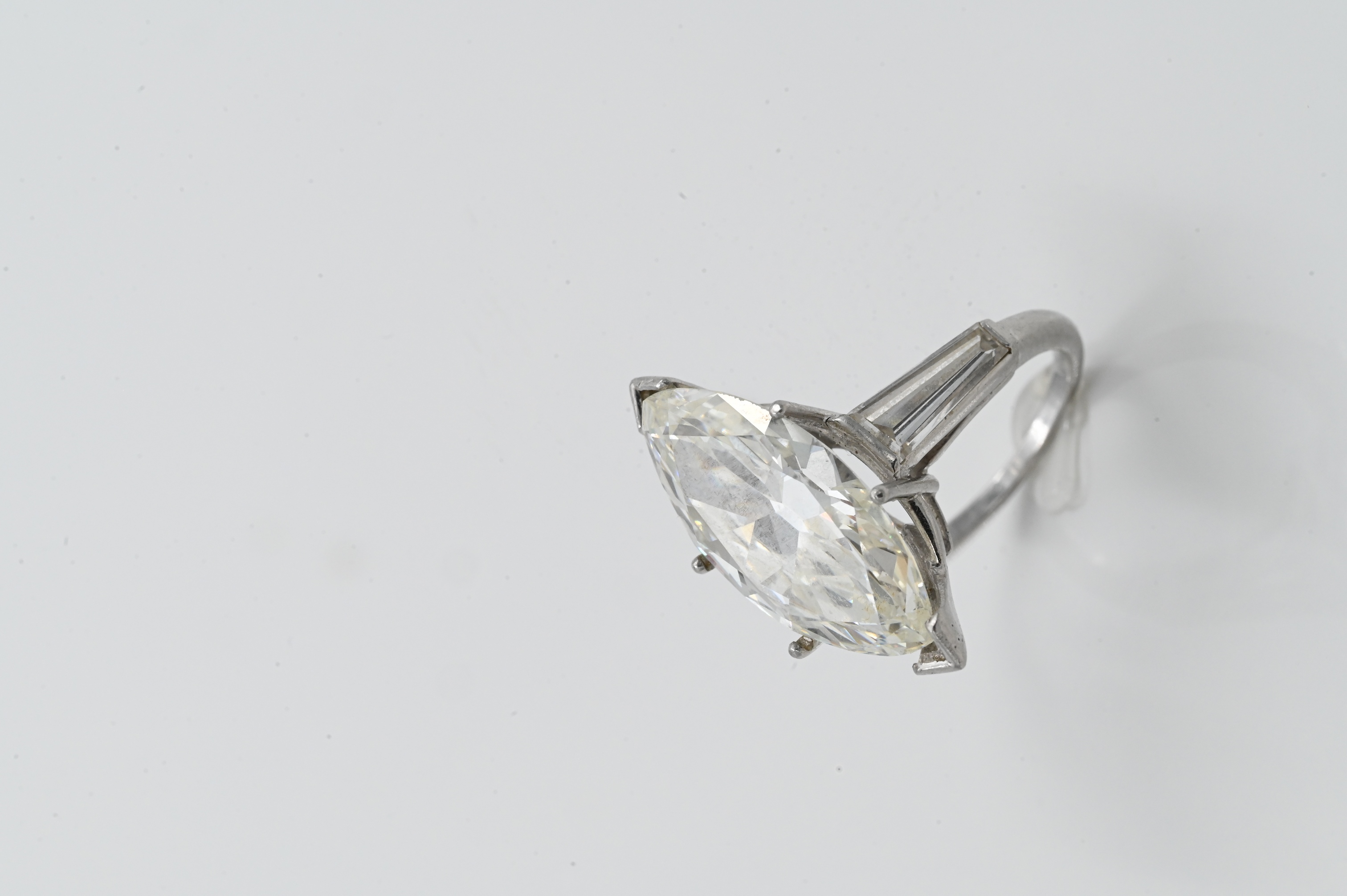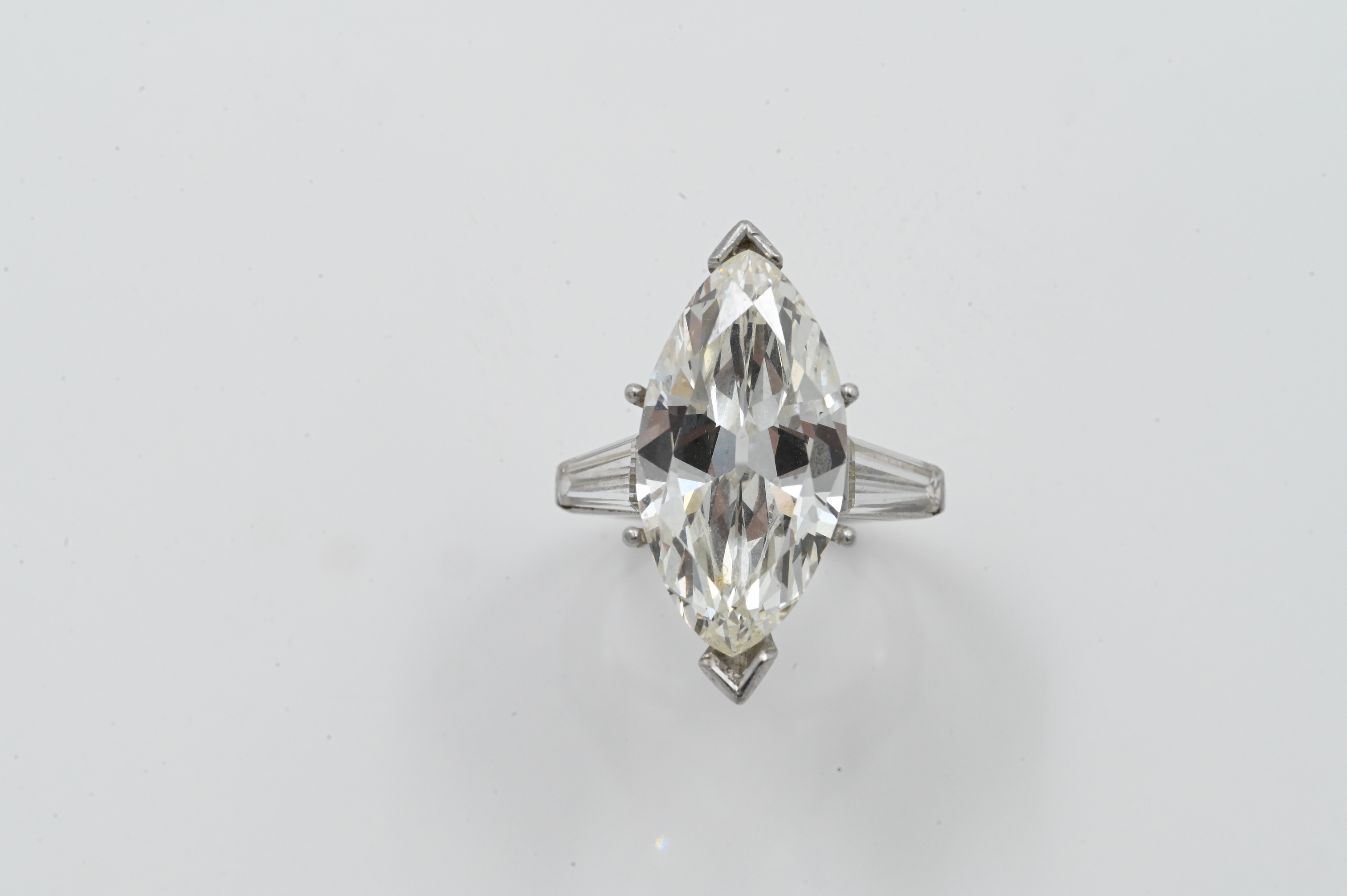 set with 7.15 carat marquise diamond color L, VS1, flanked by tapered baguettes in platinum setting, GIA report number 6233459416