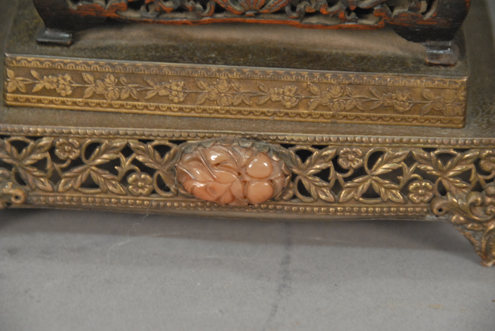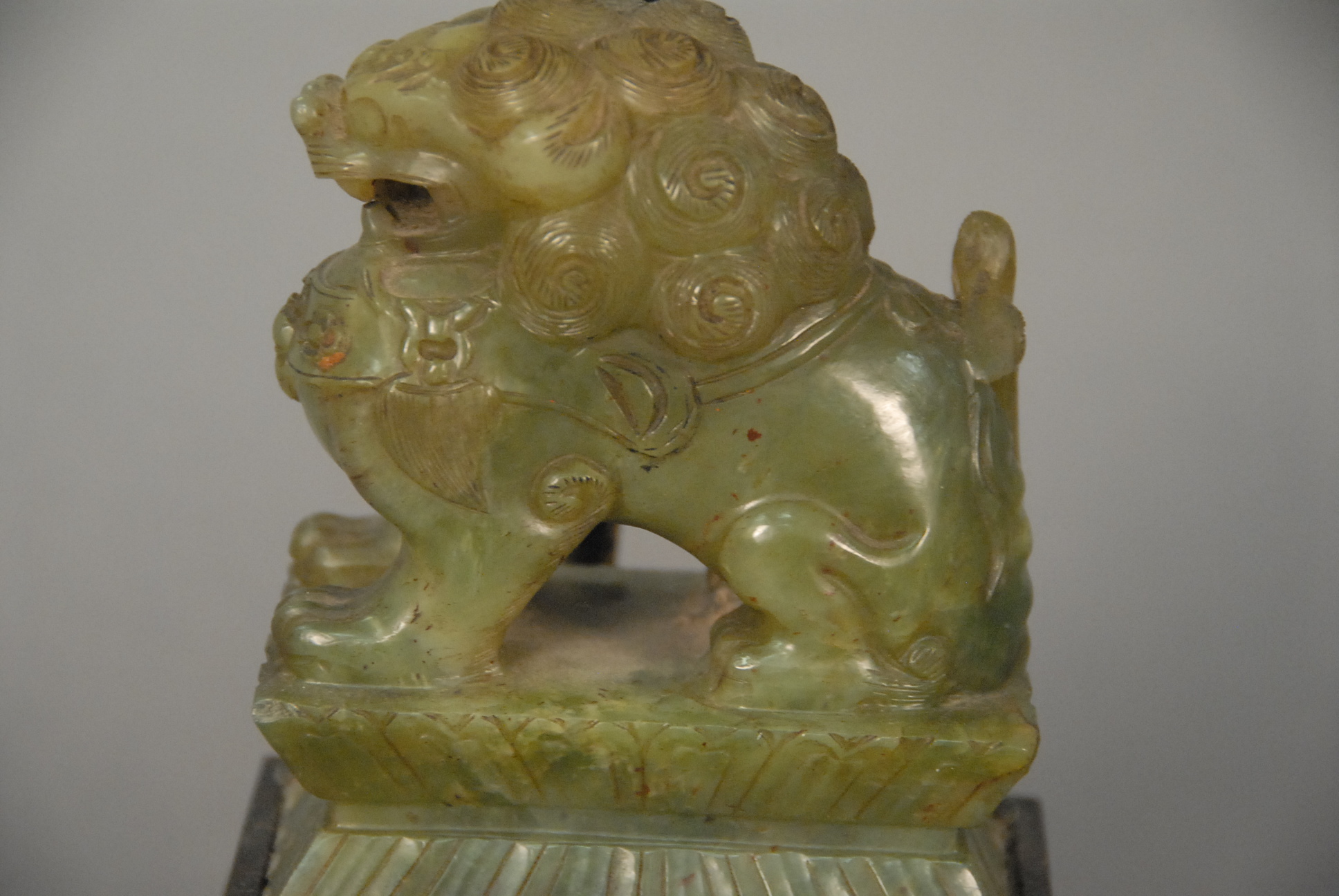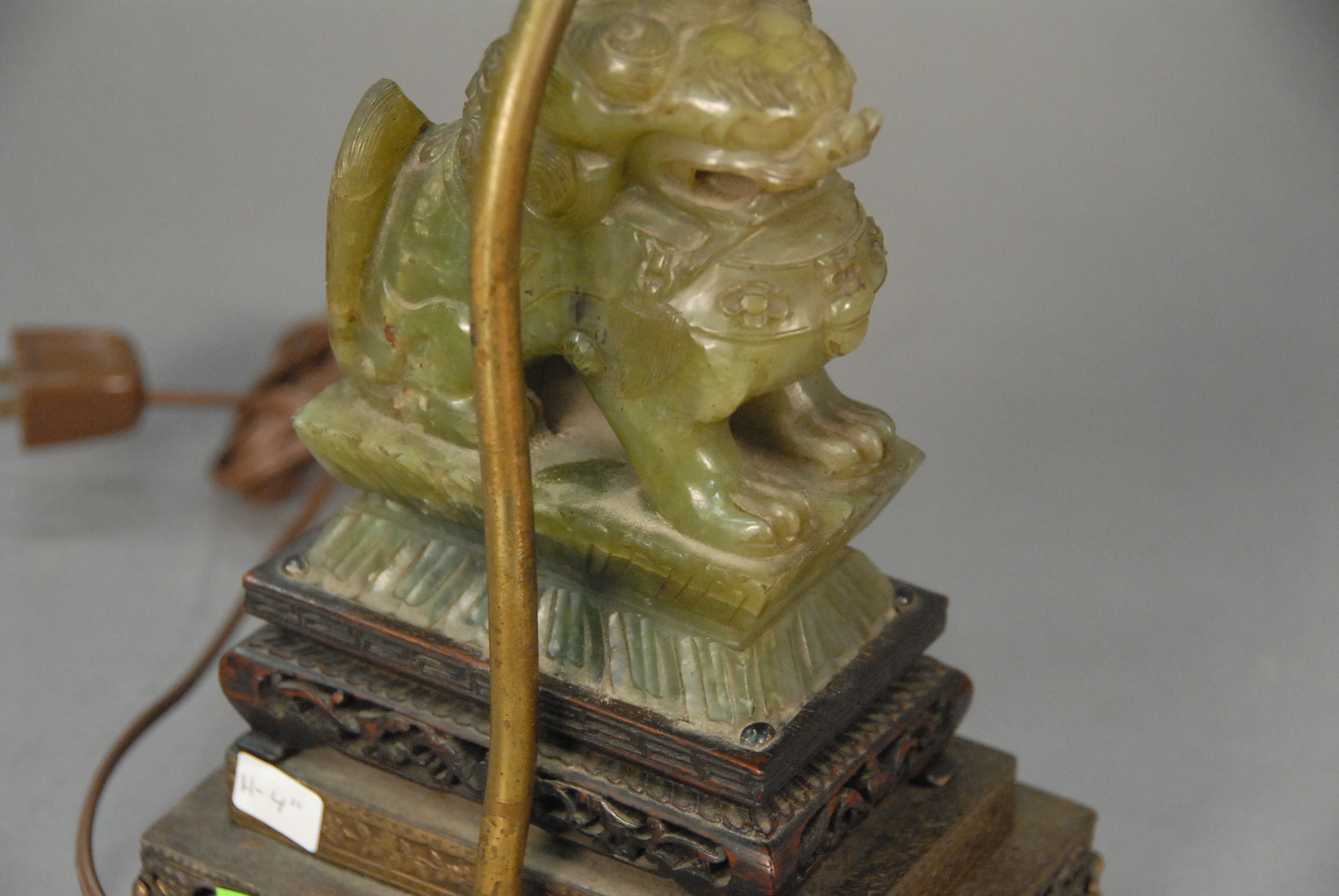 Lot 75: Carved green jade foo dog lion seated on carved lotus form base all resting on reticulated carved hardwood base, made into a table lamp, metal base set with a small hardstone jewel. figure ht. 4 1/2 in.
