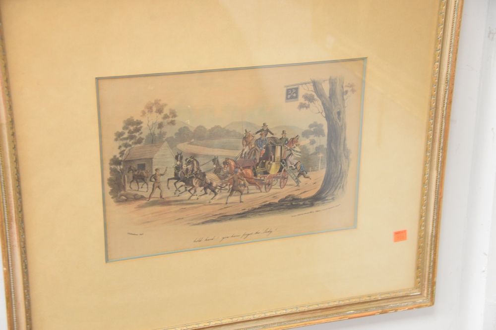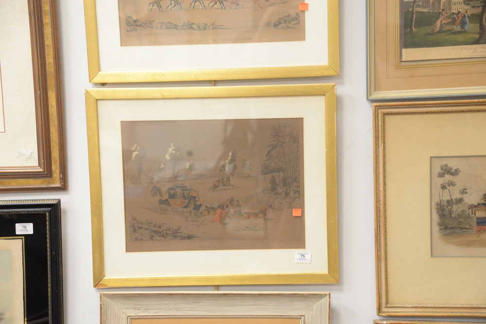 Group of Five Framed Prints, to include “Hold Hard! You have Forgot the Lady” by J. Watson; “A View of Foots” by W. Woollett; “The Mail Couch in a Drift of Snow” by James Pollard; “The Sleepy Gate Keeper” by C.B. Newhouse along with “The Mail Coach in a Storm of Snow” by James Pollard, largest 11″ x 16″.