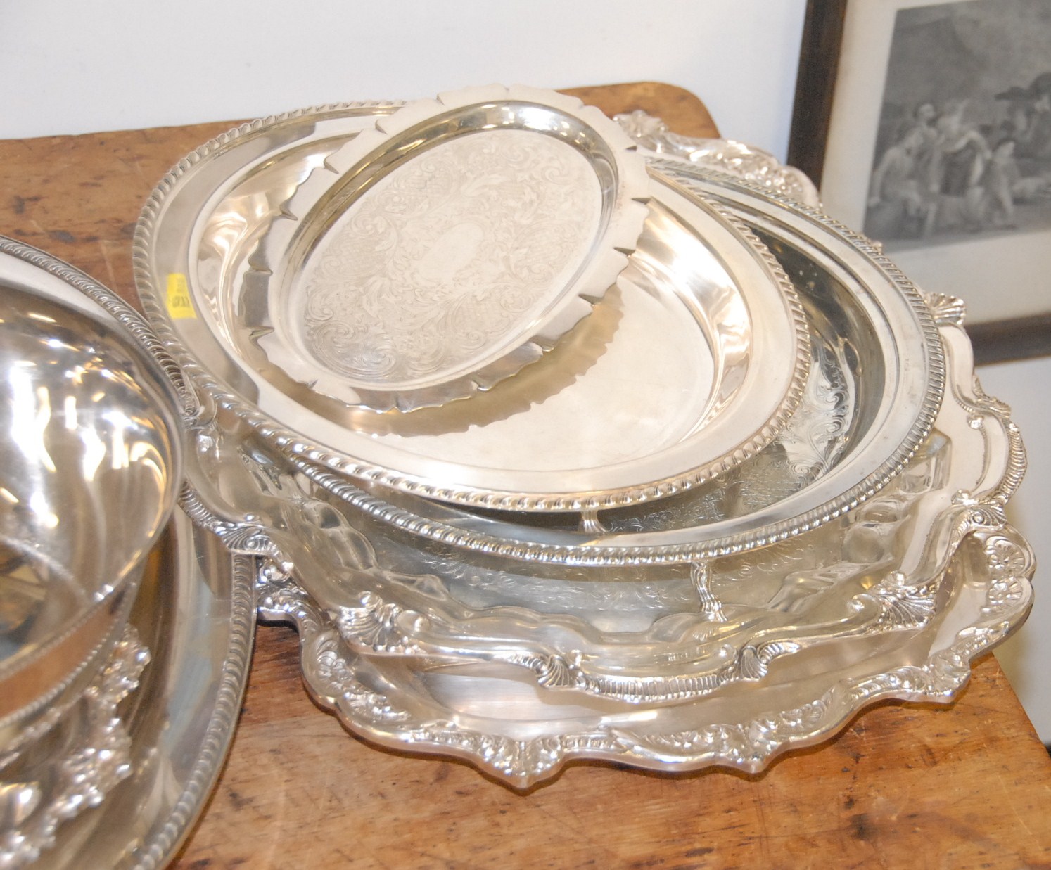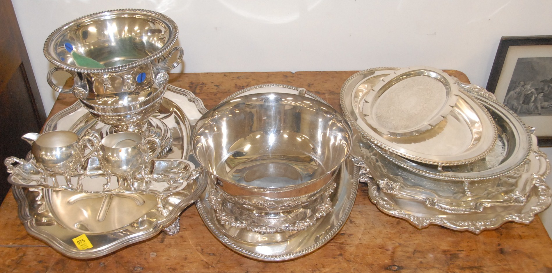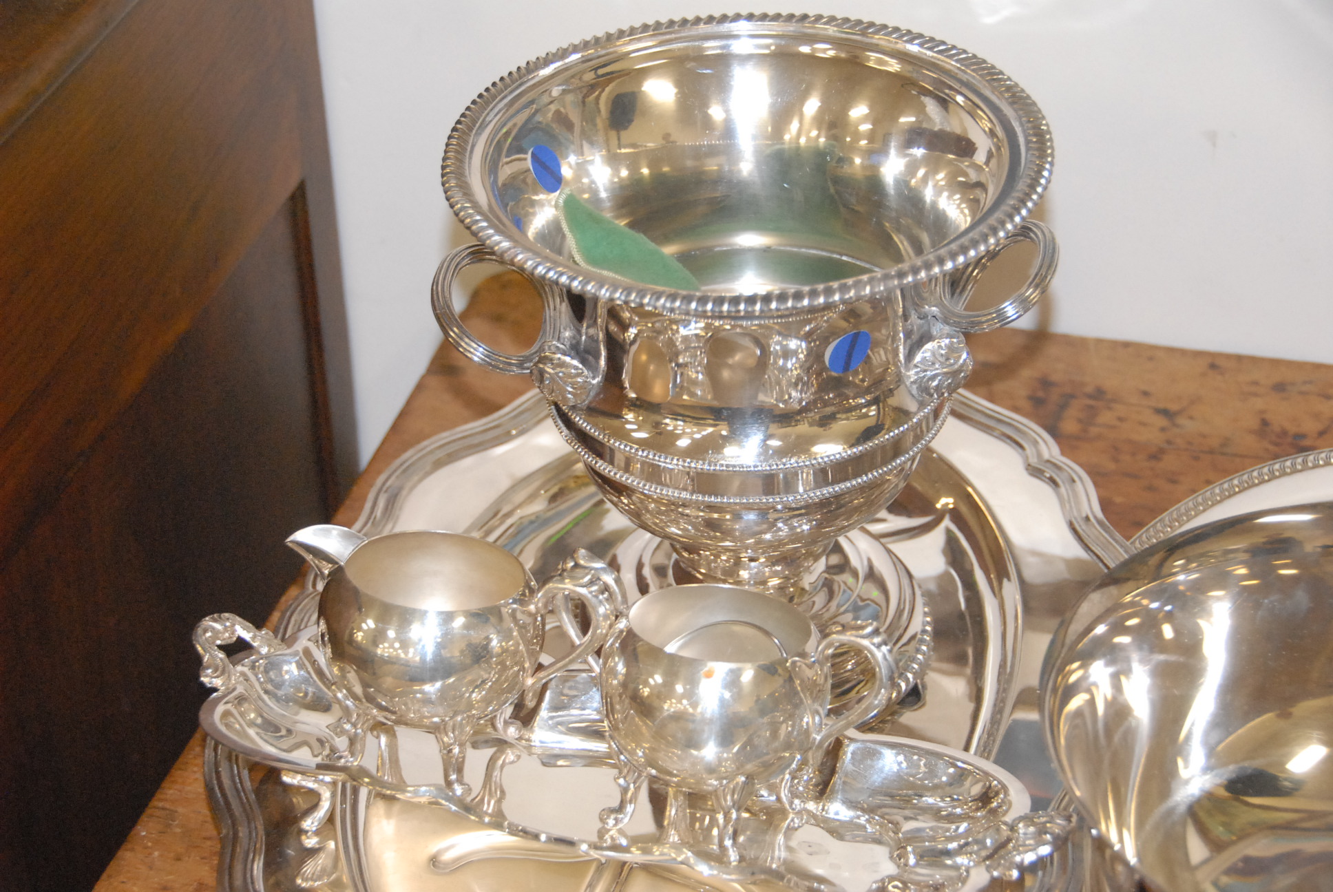 Large lot of silver plate to include wine cooler, several trays, and bowls.