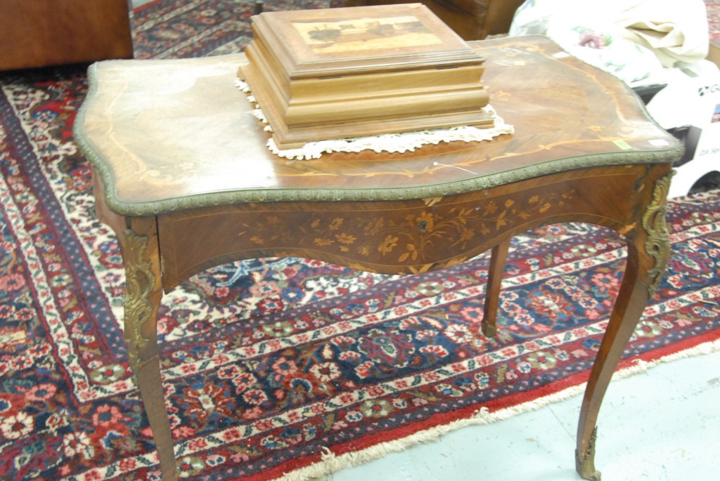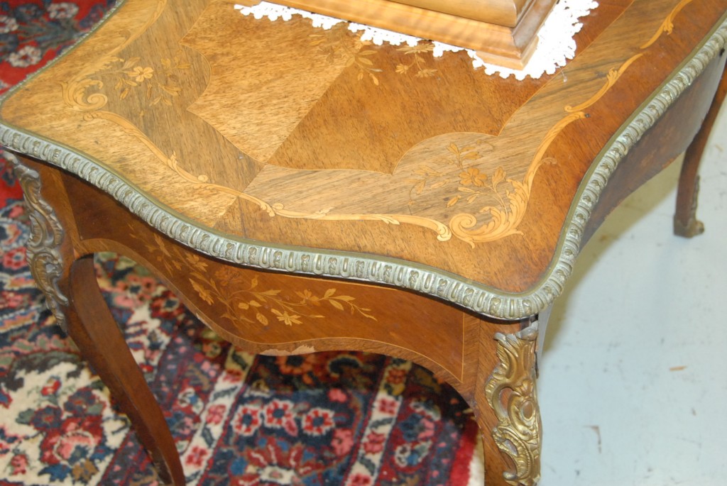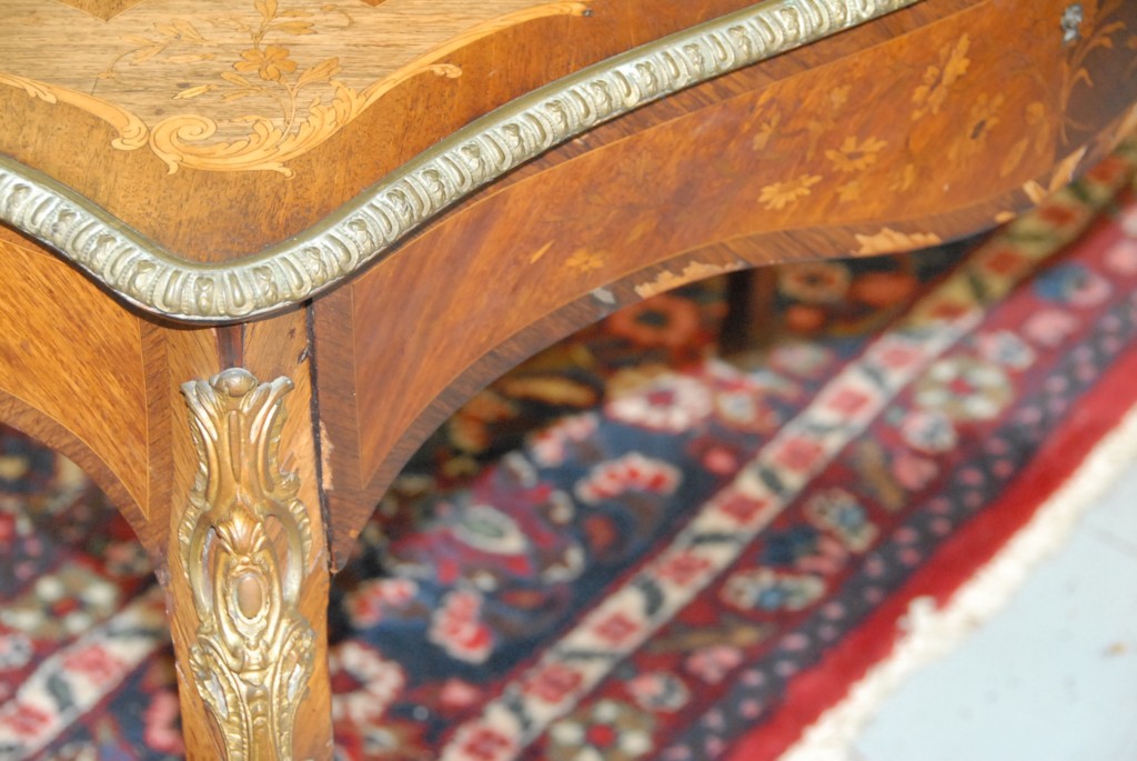 Louis XV style writing table with inlaid top and sides with brass mounts, lg. 38in. dp. 24in.