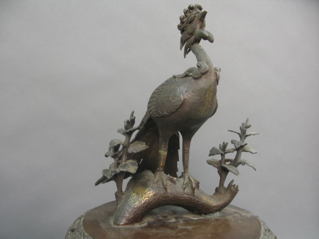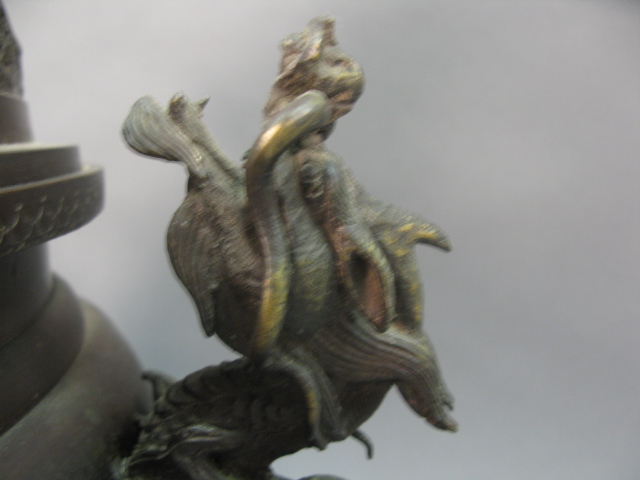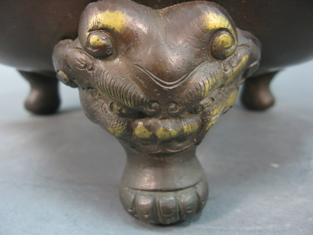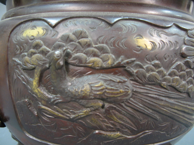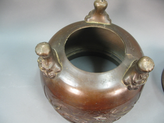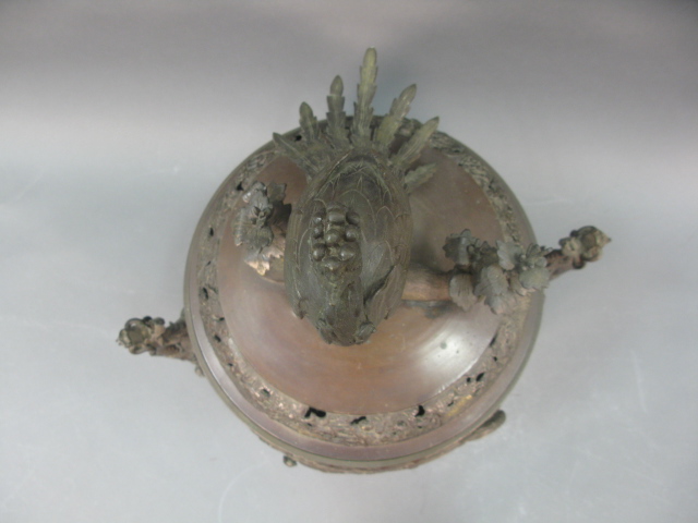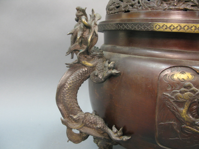 Oriental bronze incense burner with cast relief of flying birds with dragon handles, reticulated cover with phoenix bird finial, all sitting on three casted foo-dog feet.