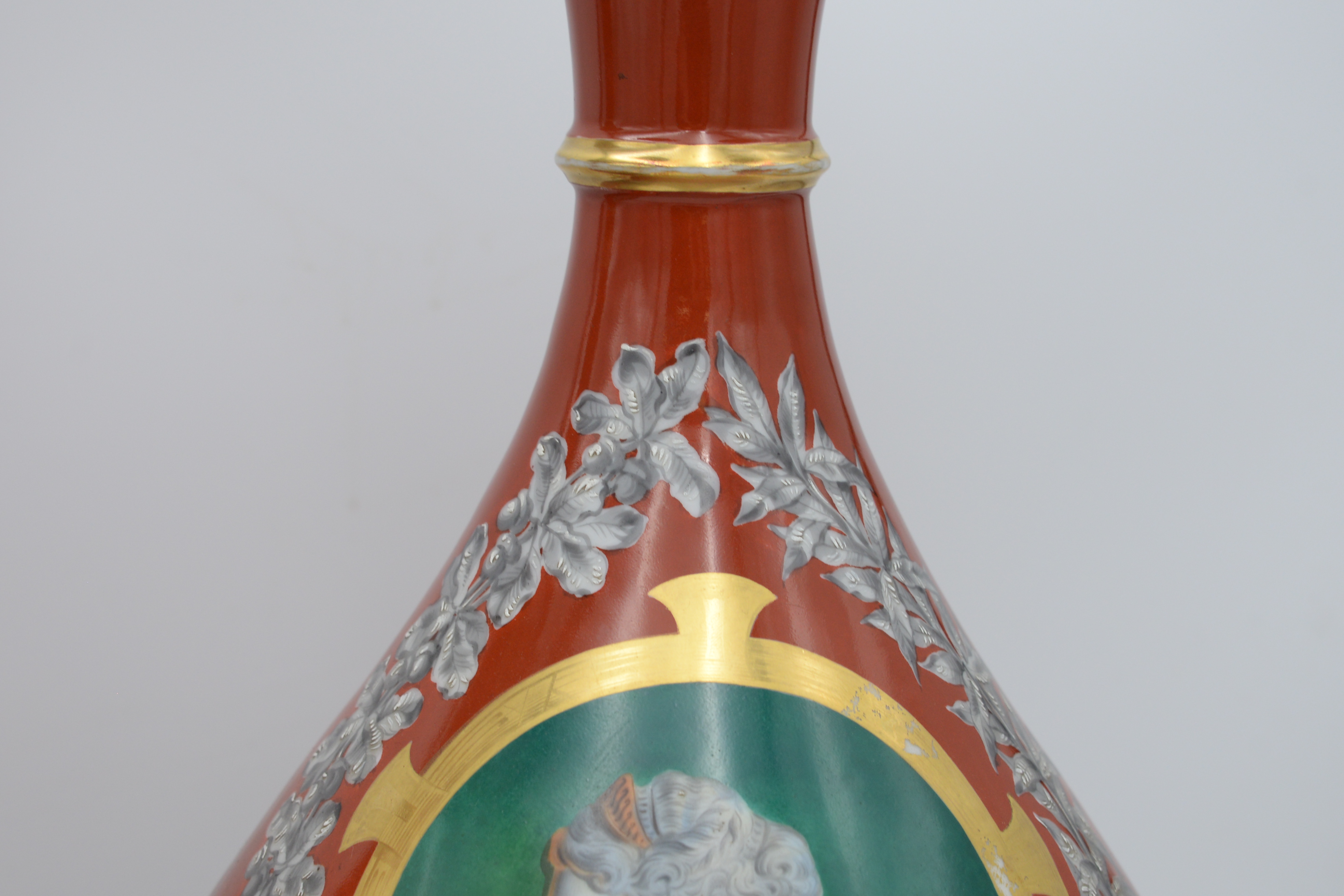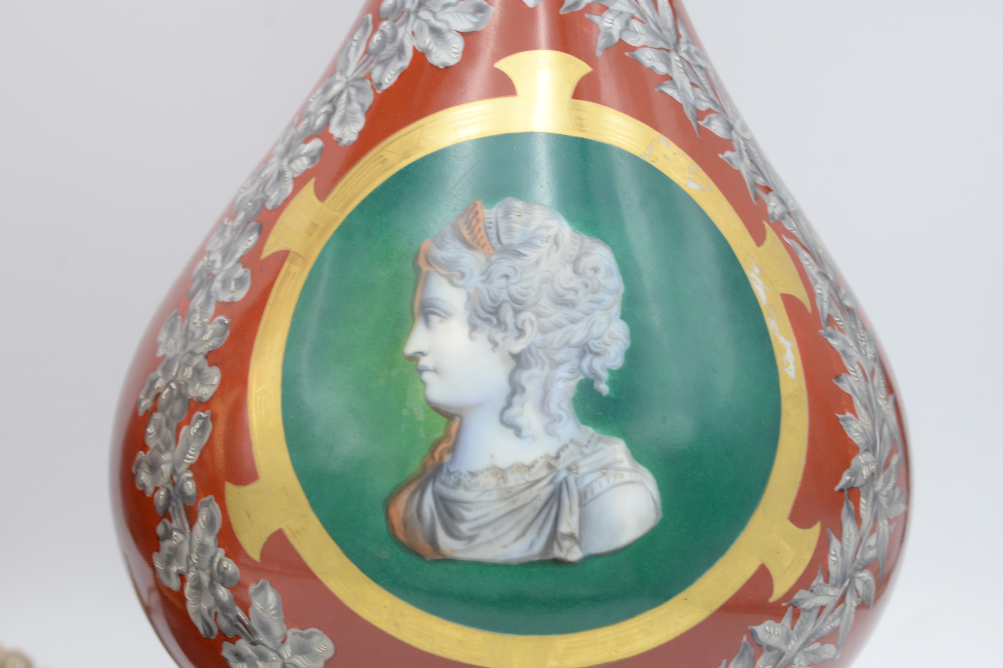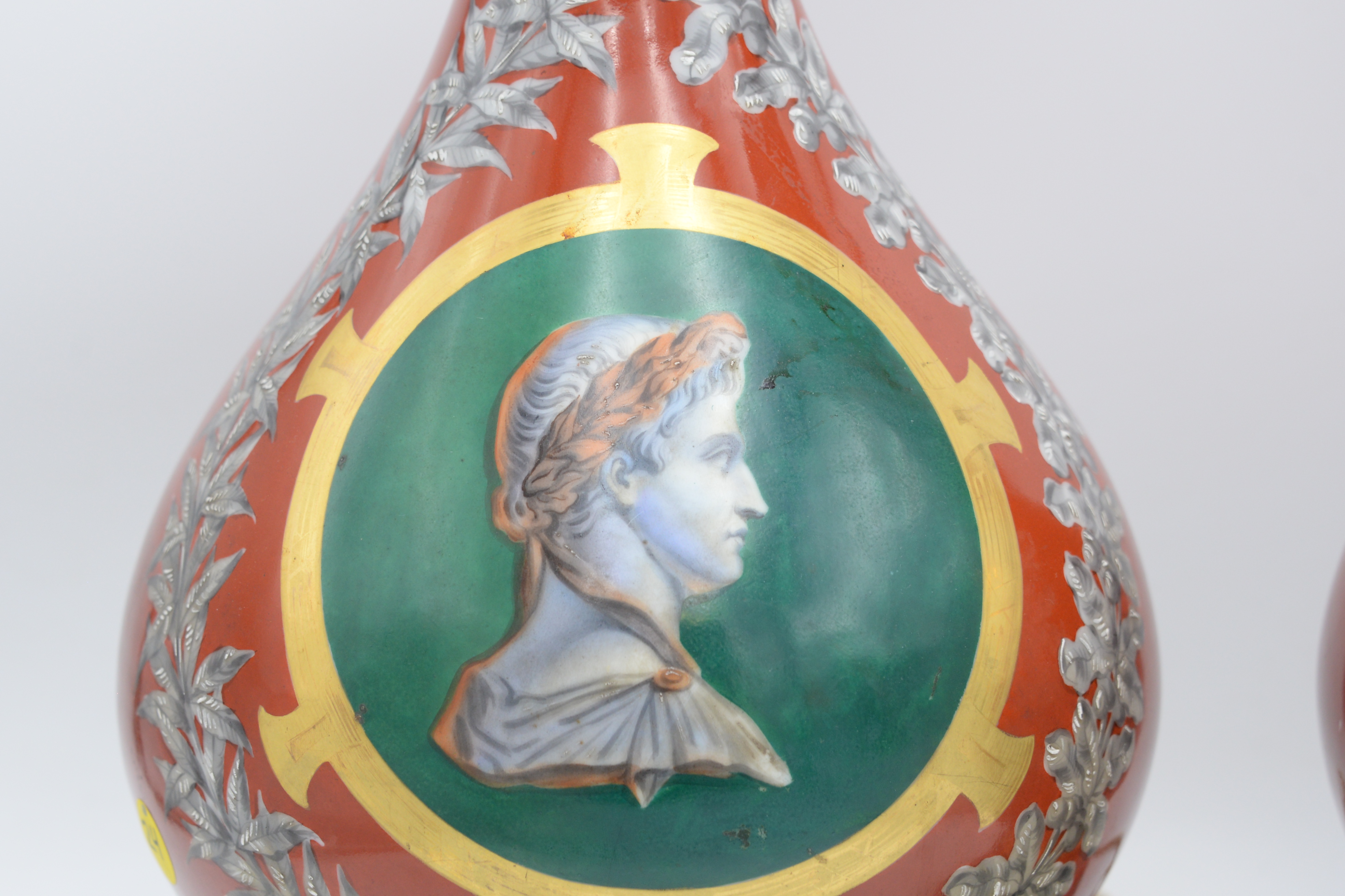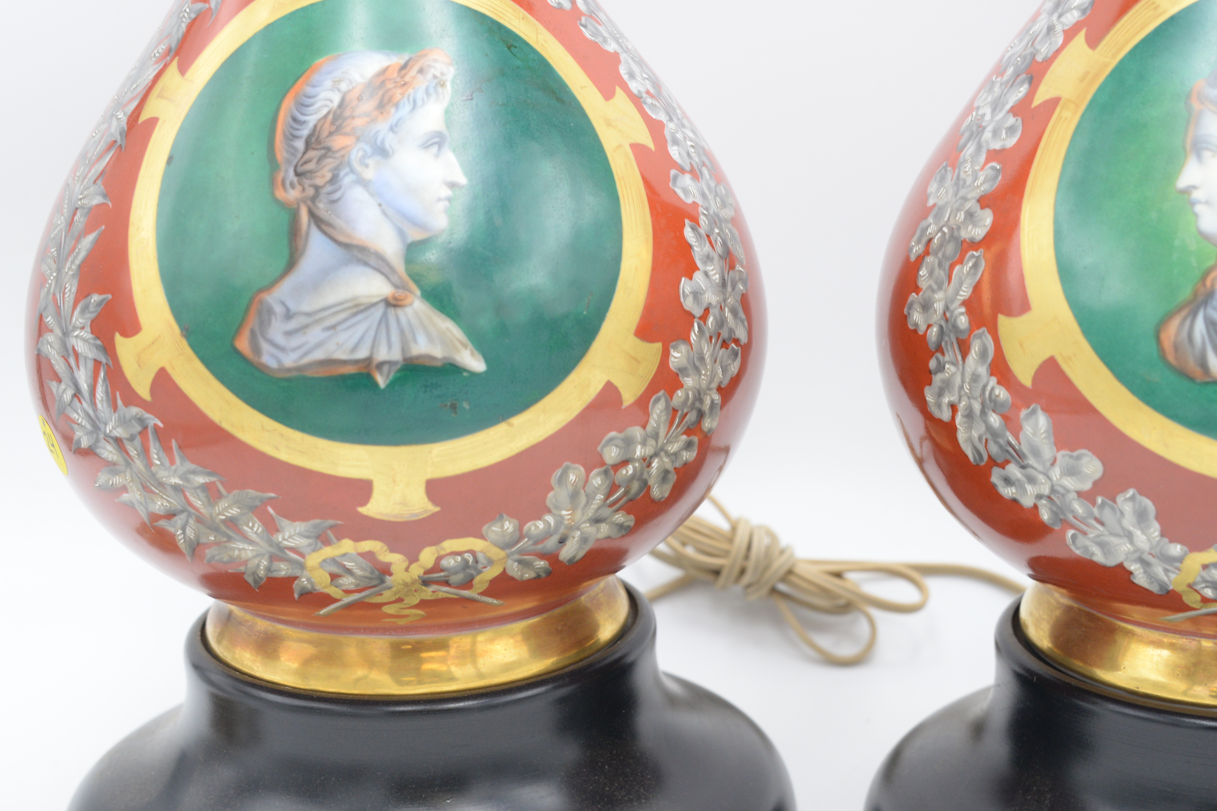 Pair of 19th Century Portrait Vases, with iron red background, now mounted as lamps, vase height 16 inches