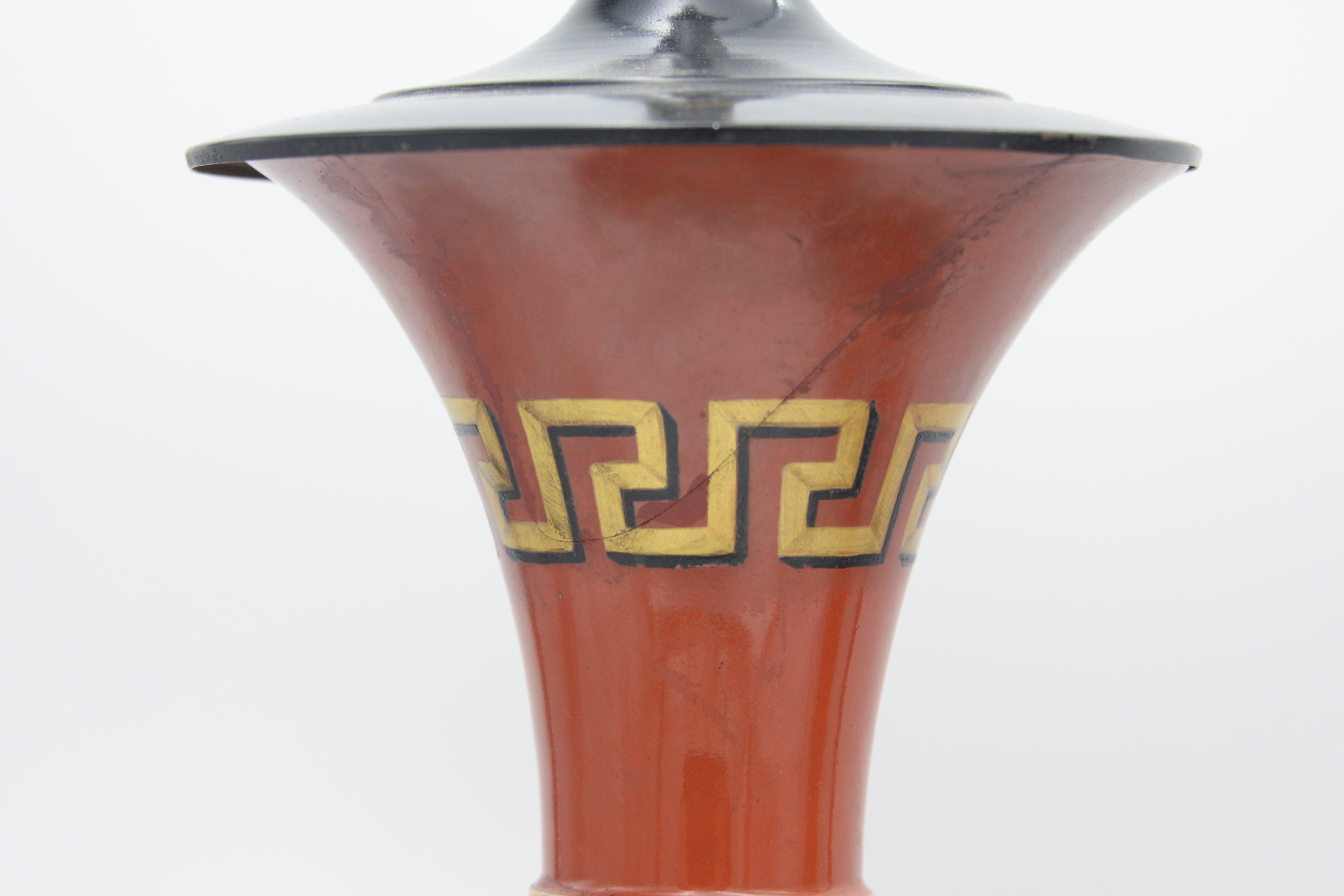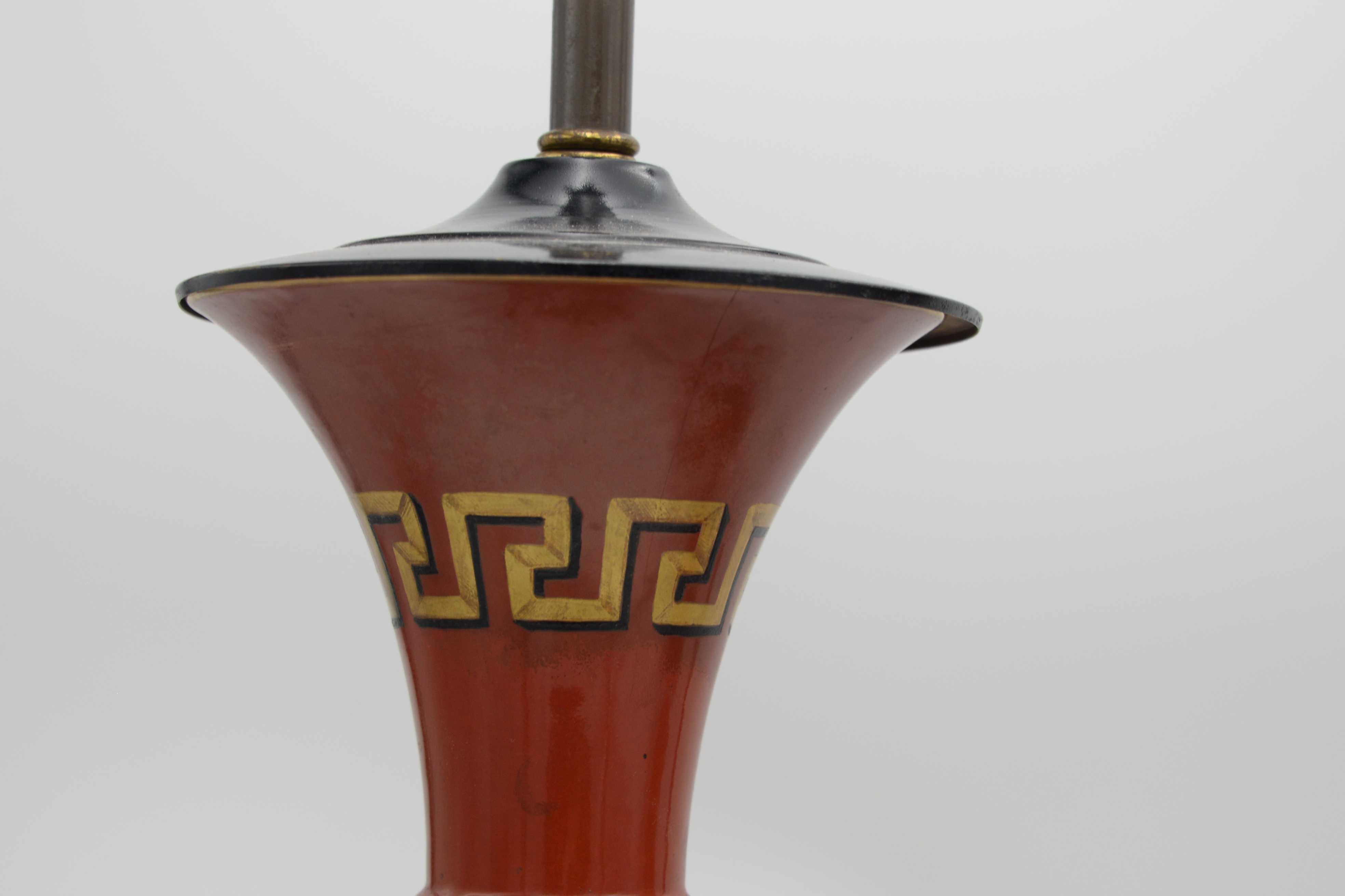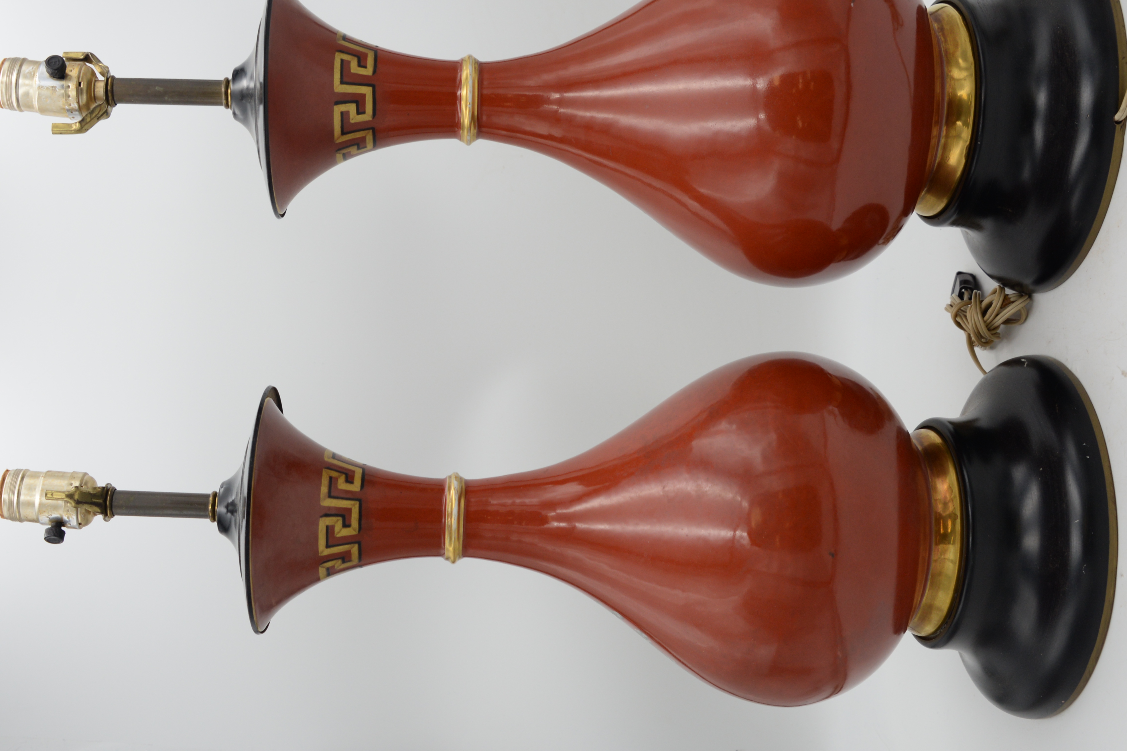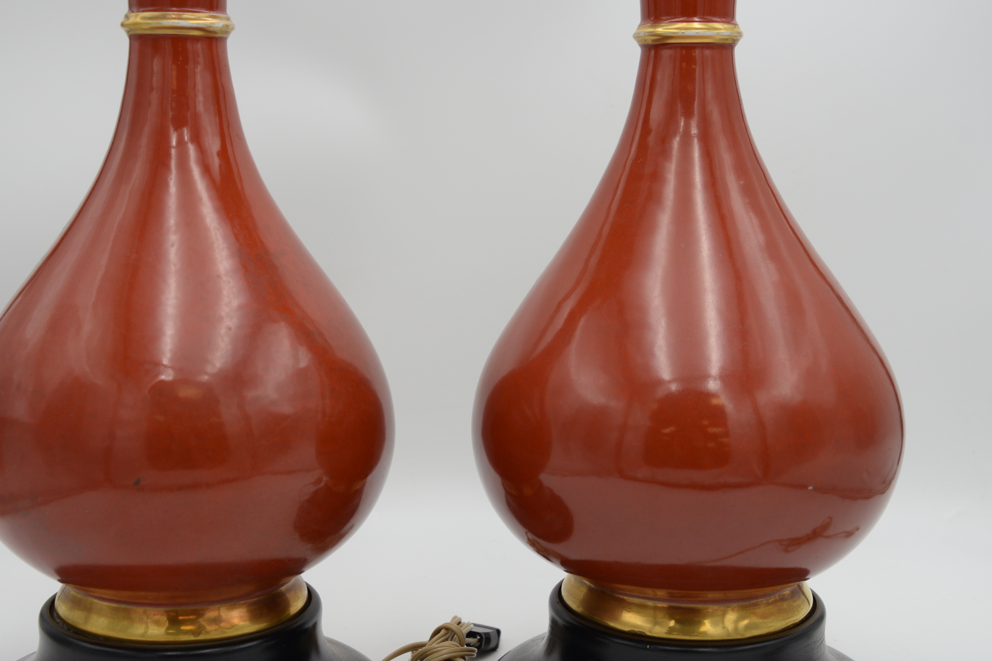 Pair of 19th Century Portrait Vases, with iron red background, now mounted as lamps, vase height 16 inches