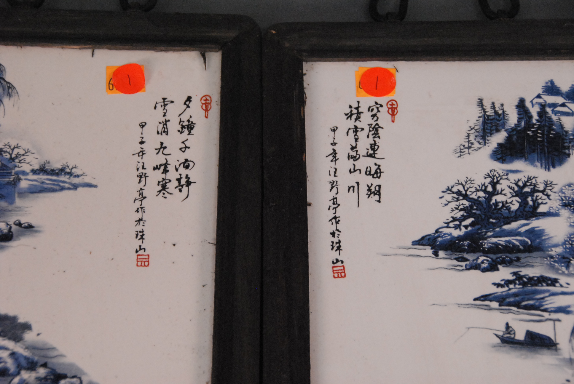 Pair of blue and white porcelain plaques with landscape scenes, 19 1/2 x 6.