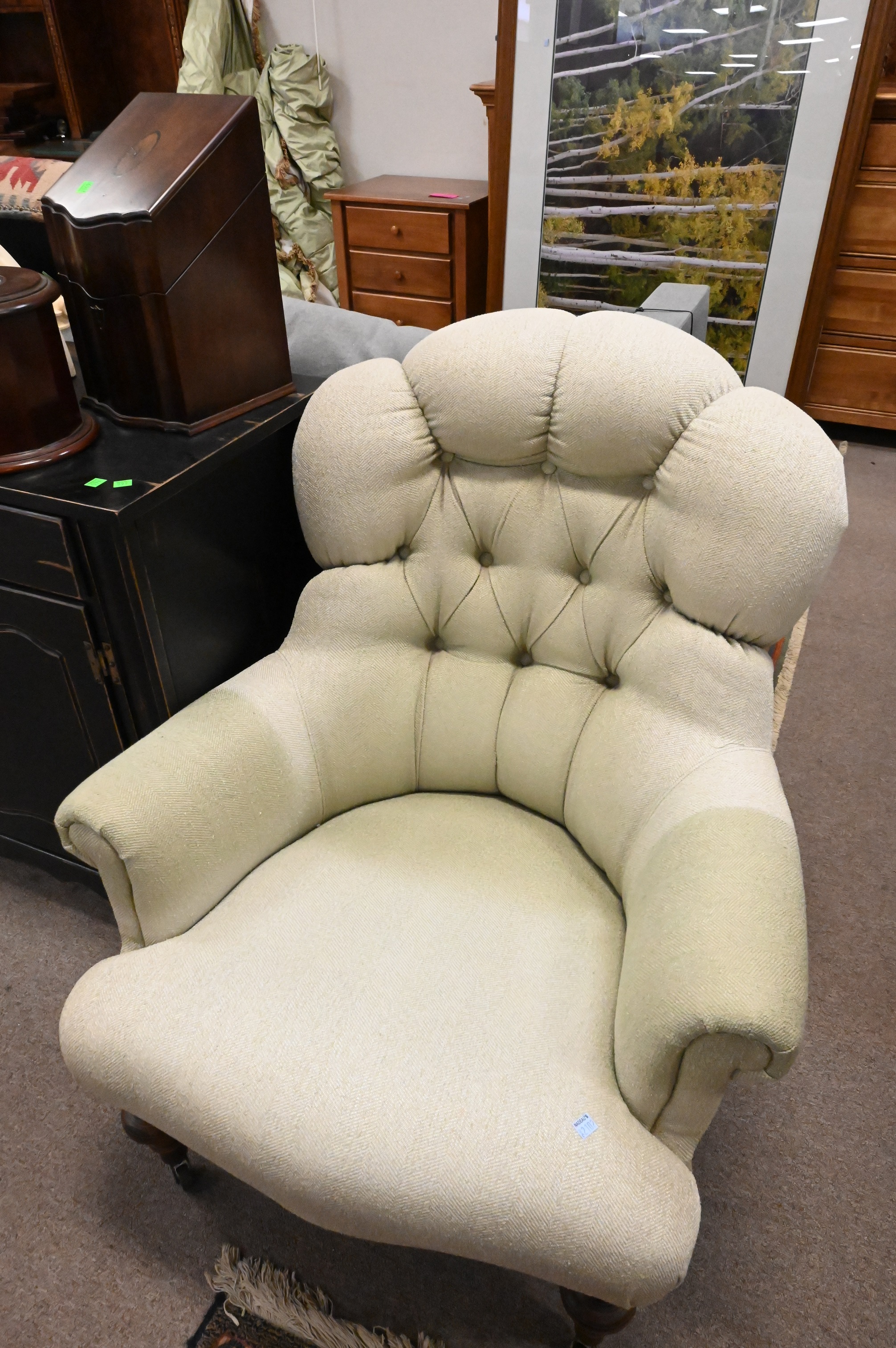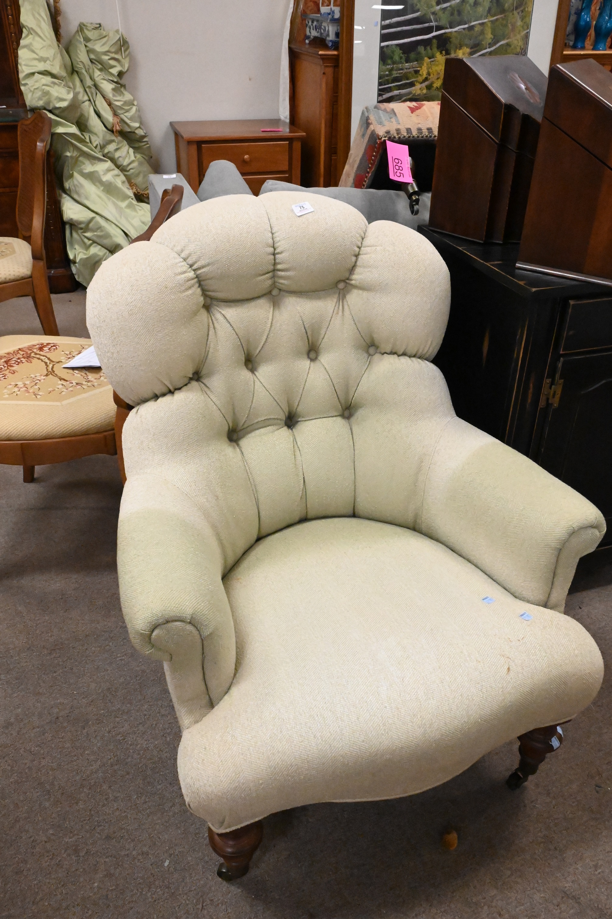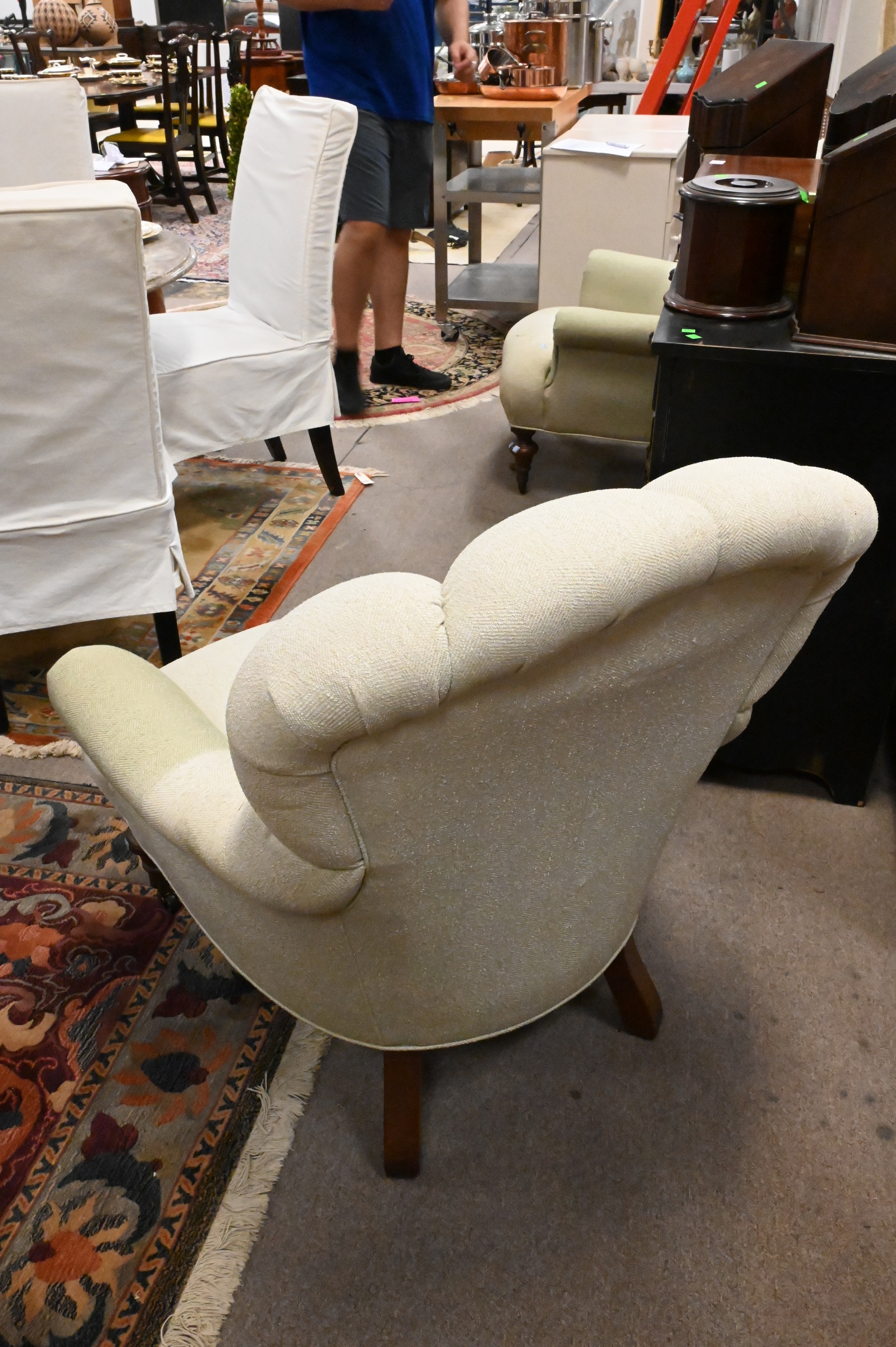 Pair of Upholstered Chairs, on tufted backs, some fading, height 37 inches, width 31 inches.