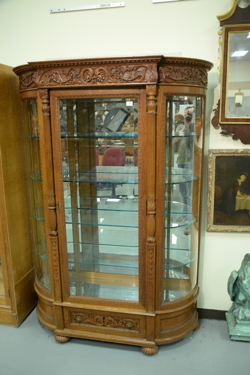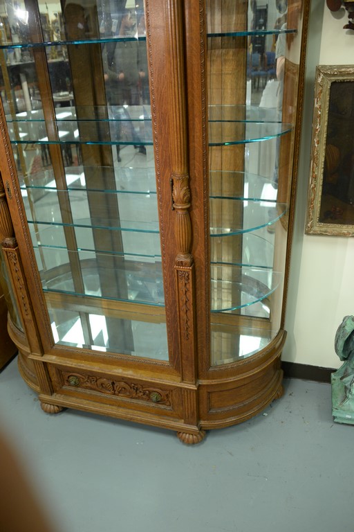 R. J. Horner Victorian oak china cabinet having carved top, columns, and drawer, bowed bevel glass sides with bevel glass door and glass shelves, having label on reverse R. J. Horner Furniture Makers, N.Y. height 78 inches, width 46 inches Provenance: Estate of Dr. Steve Leder